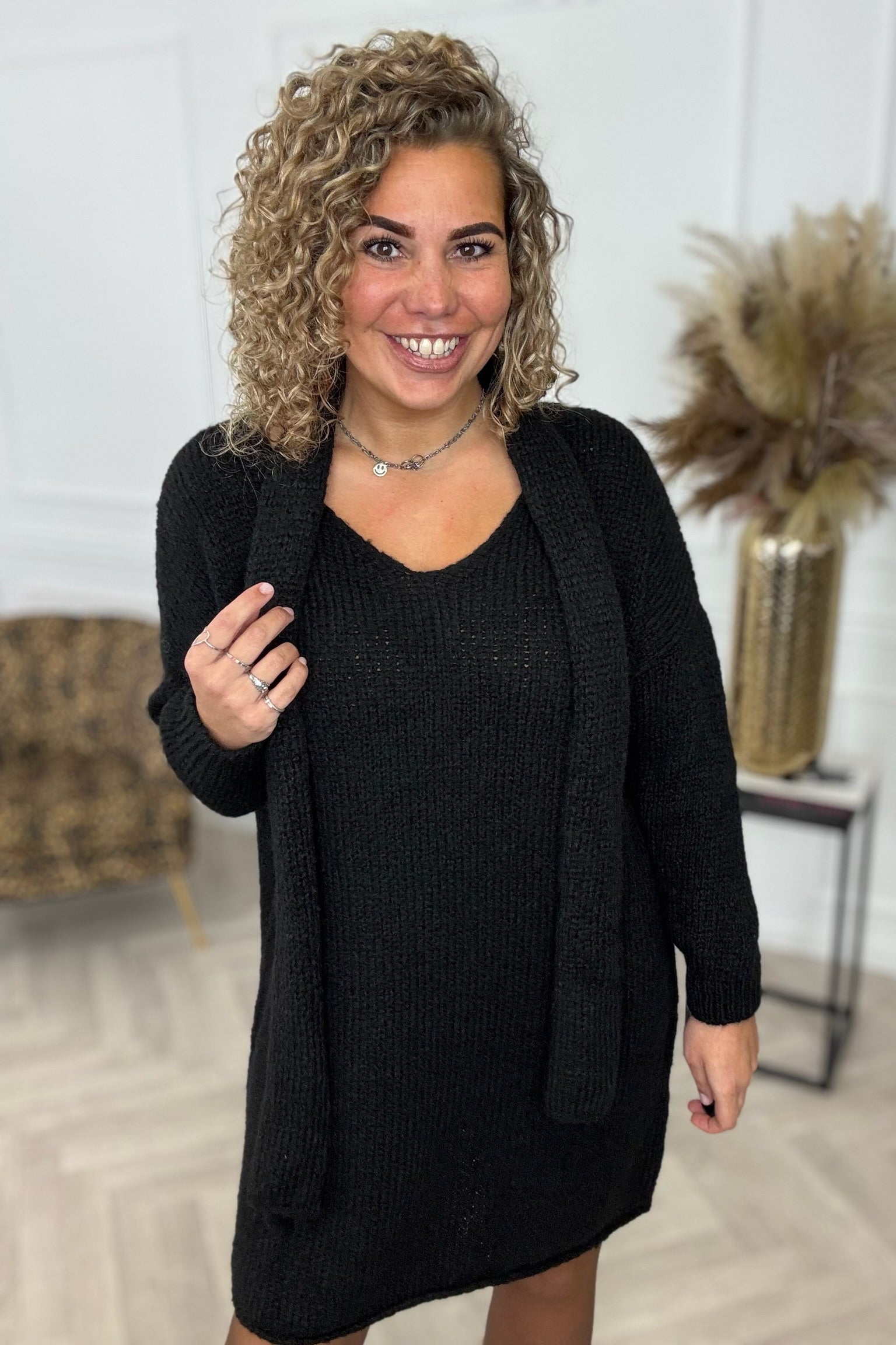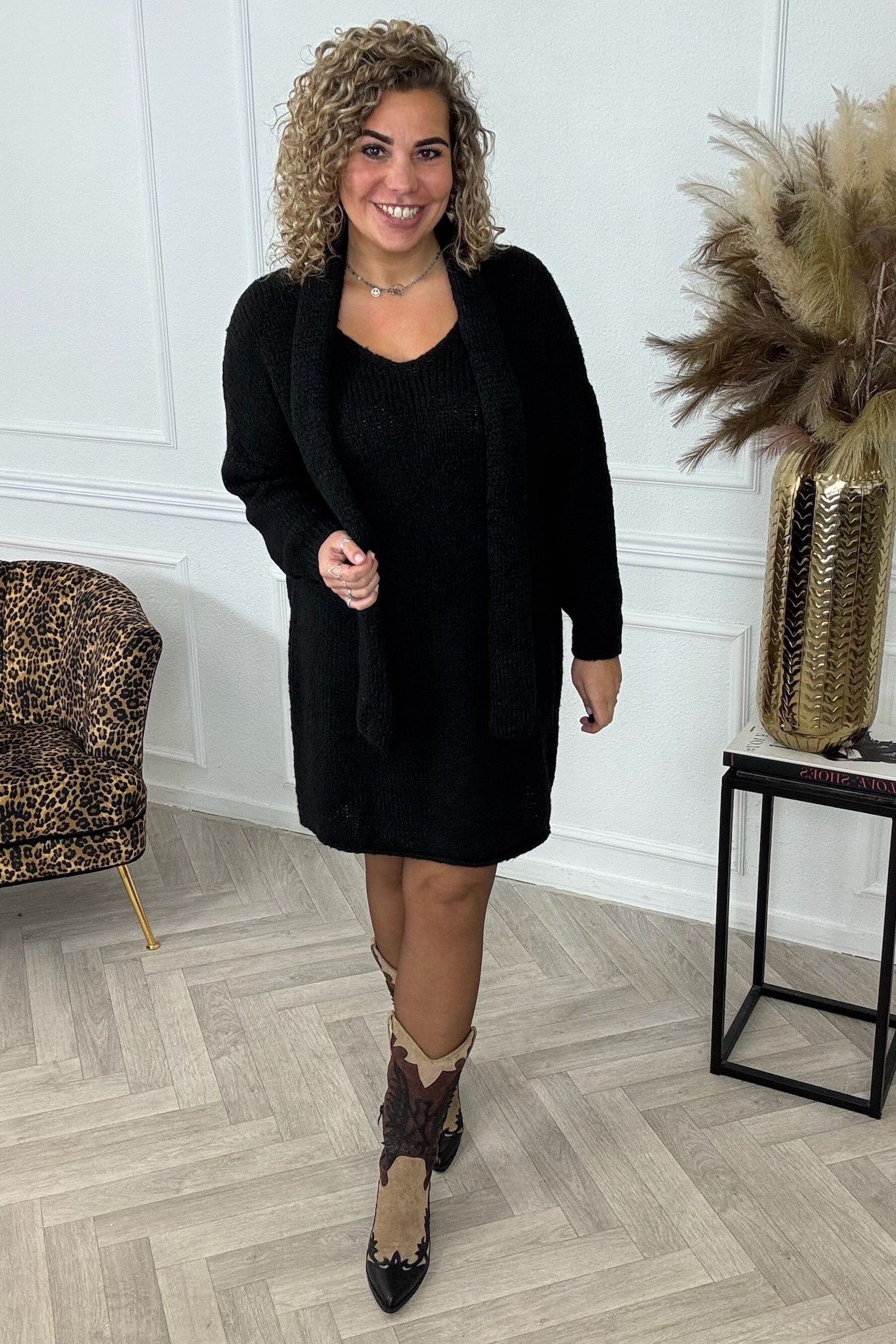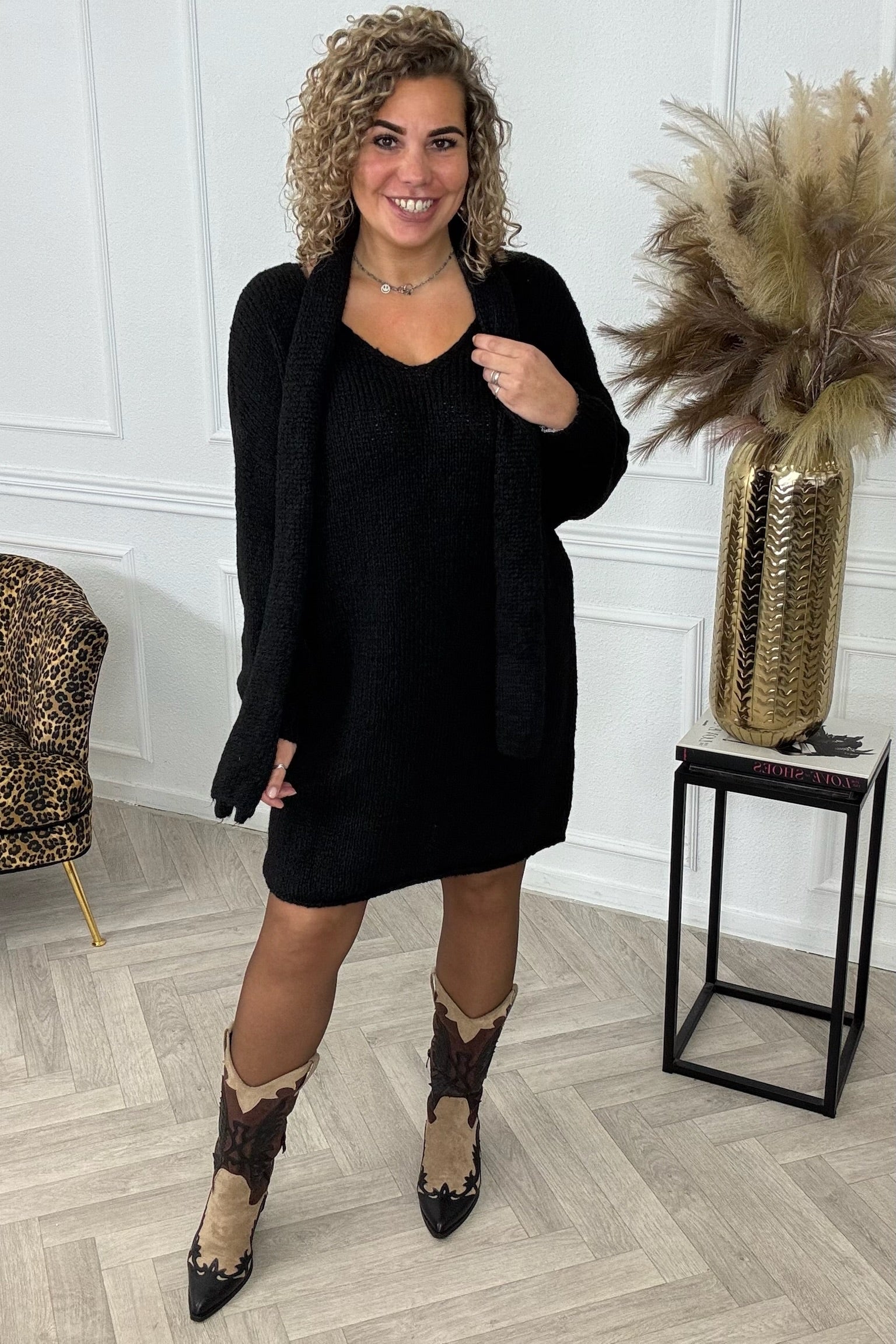 Een heerlijke knitted dress met een leuk sjaaltje erbij! Shop de knitted scarf dress nu in black!