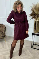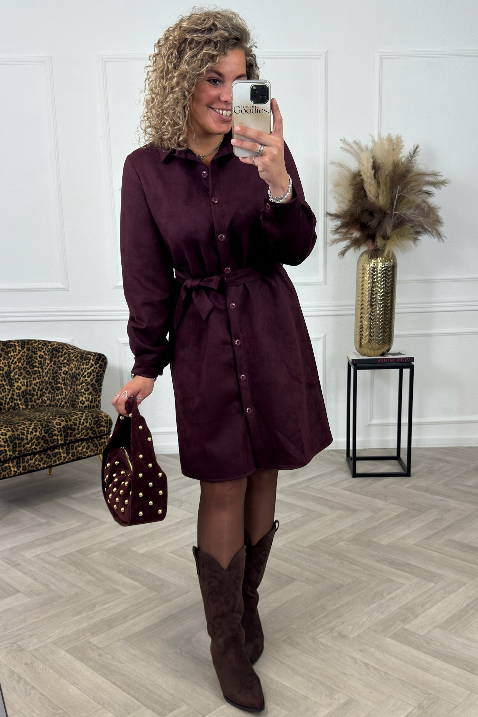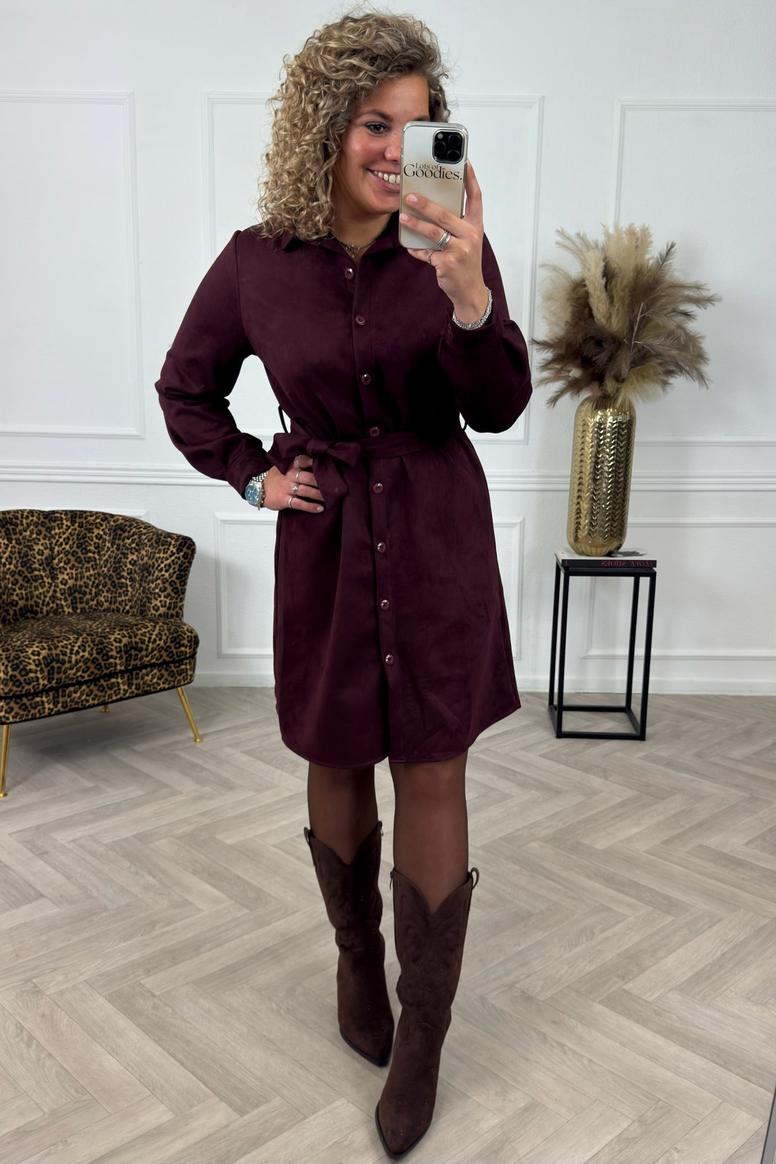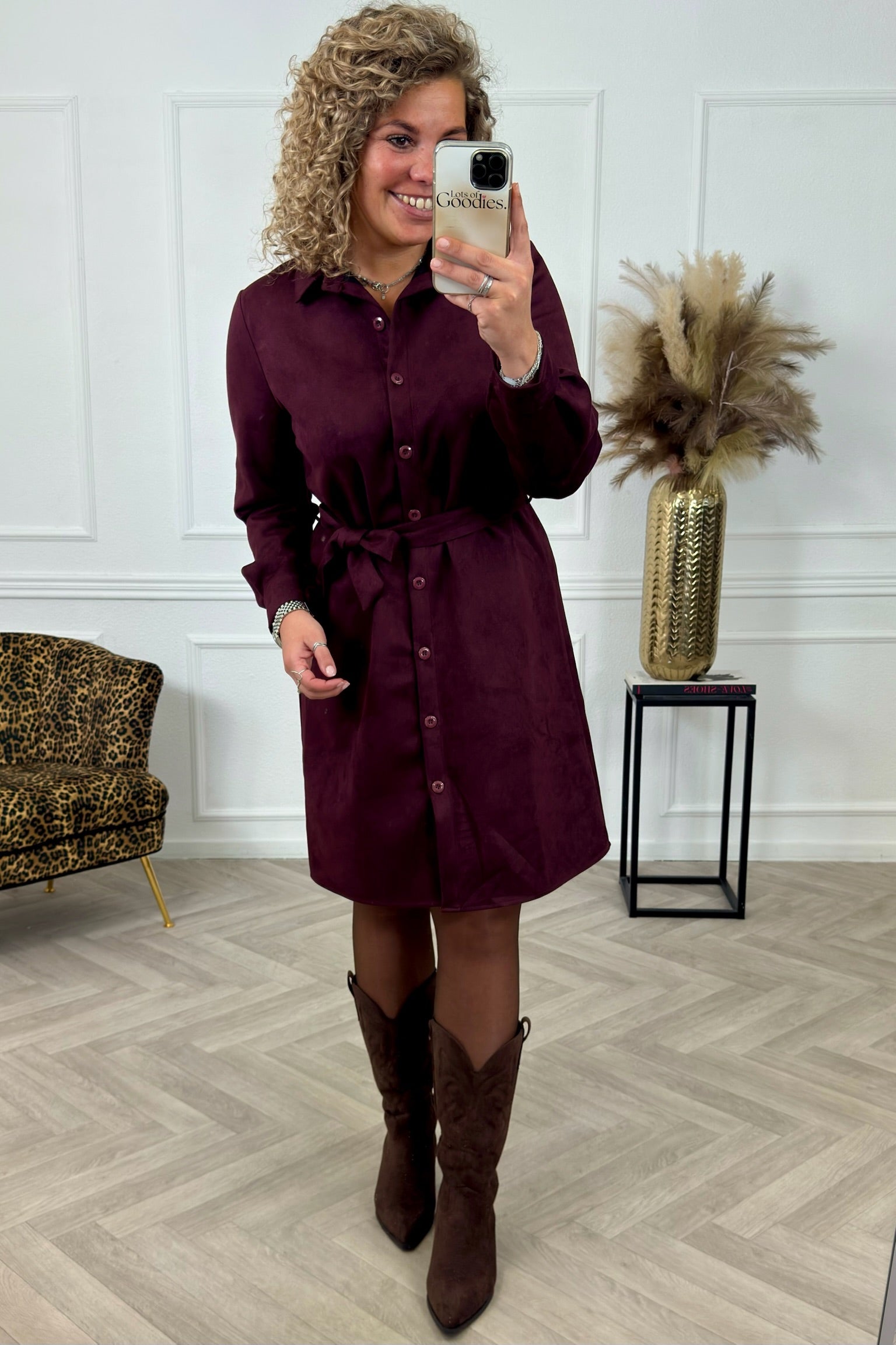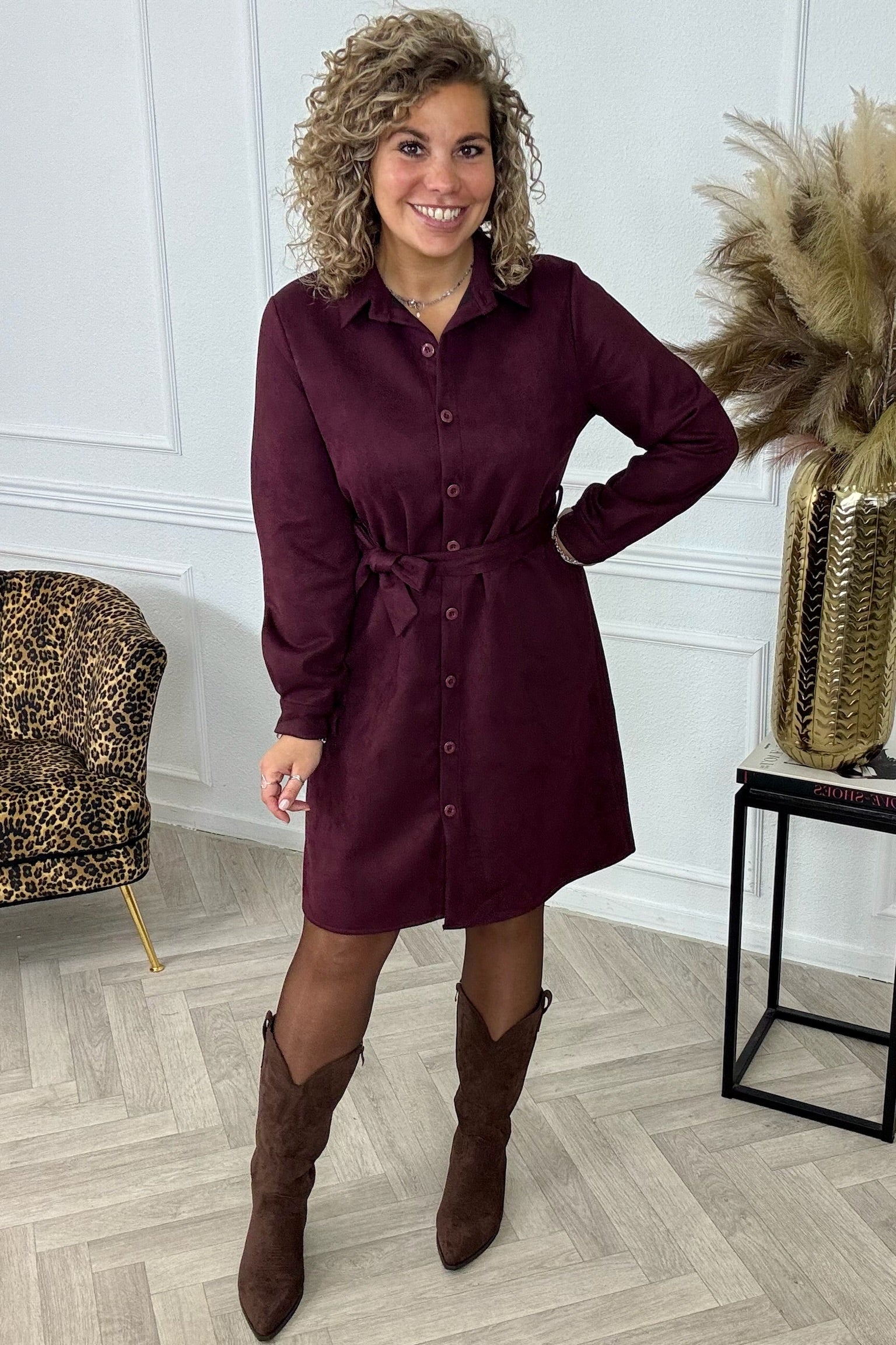 Een prachtige strik jurk, in het suede! Shop hem nu in het bordeaux!