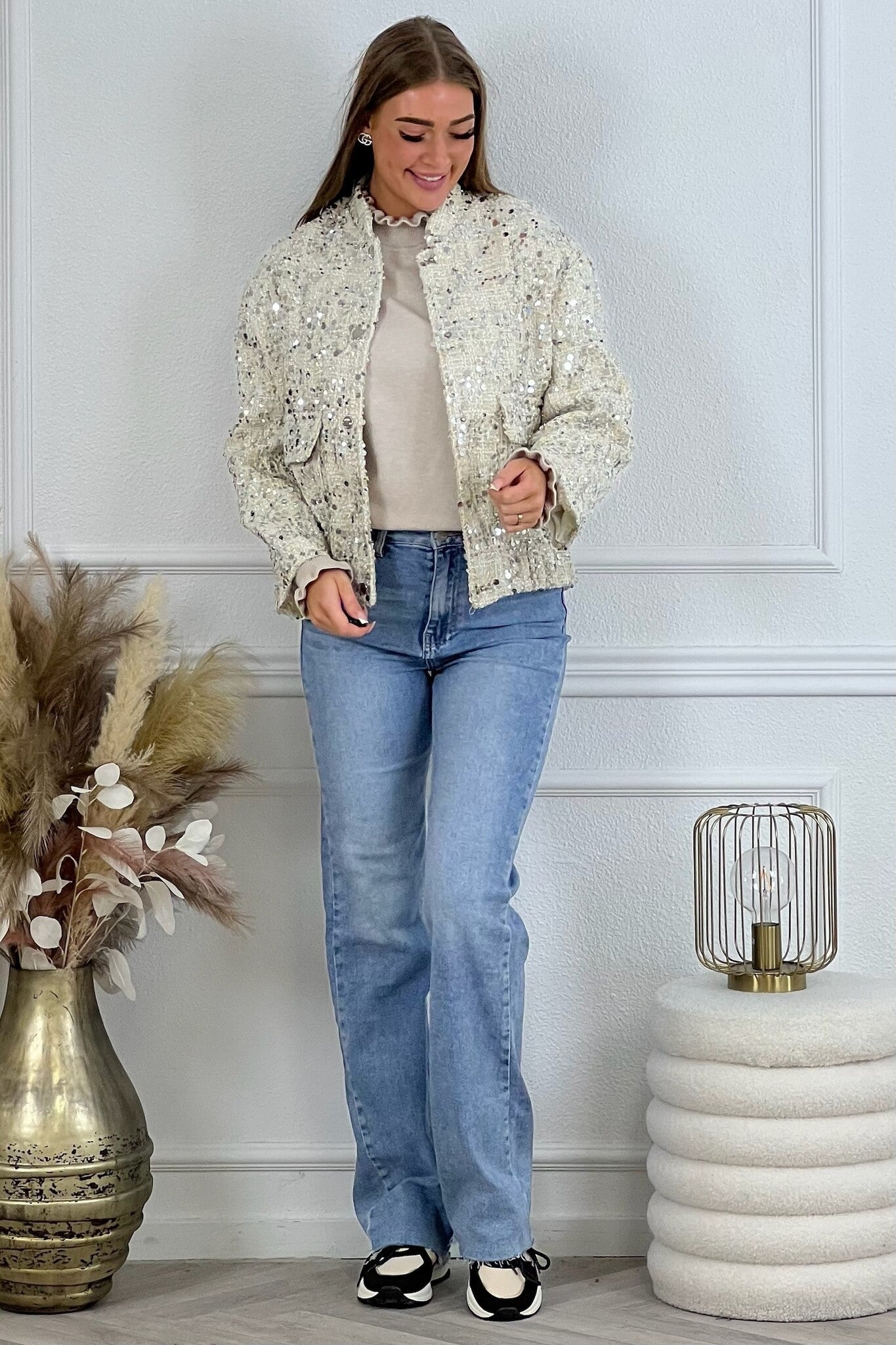 Deze super gave glitter bomber is zo leuk en verkrijgbaar in 2 kleuren! Shop hem nu in creme.