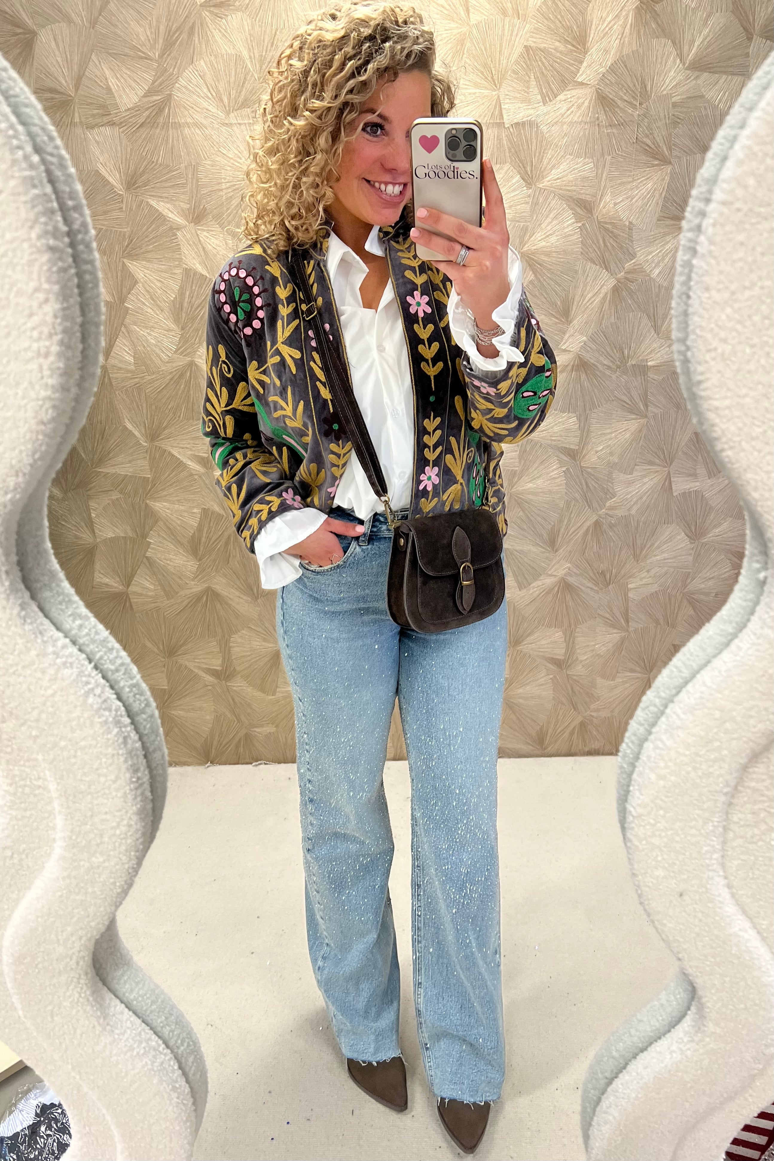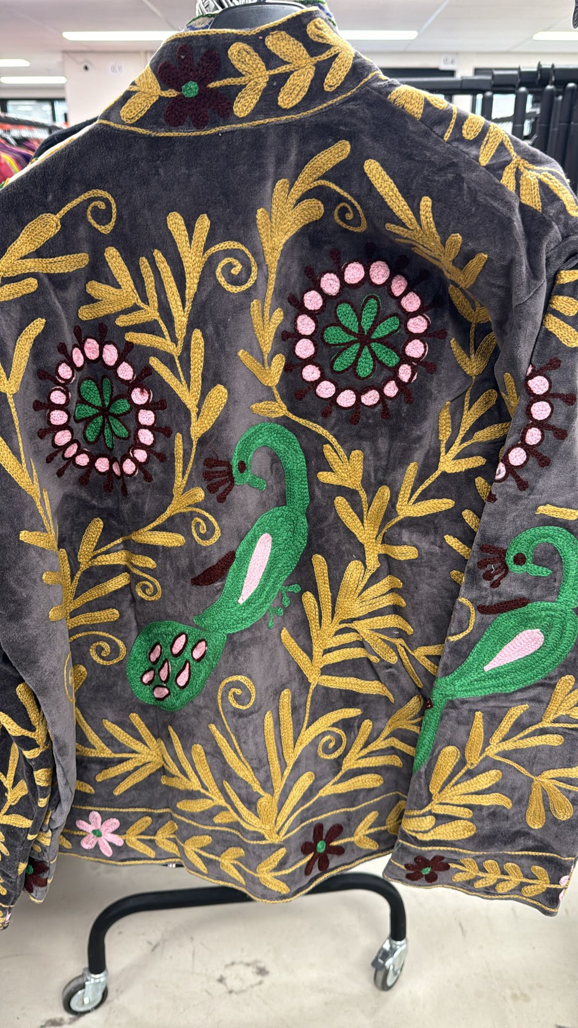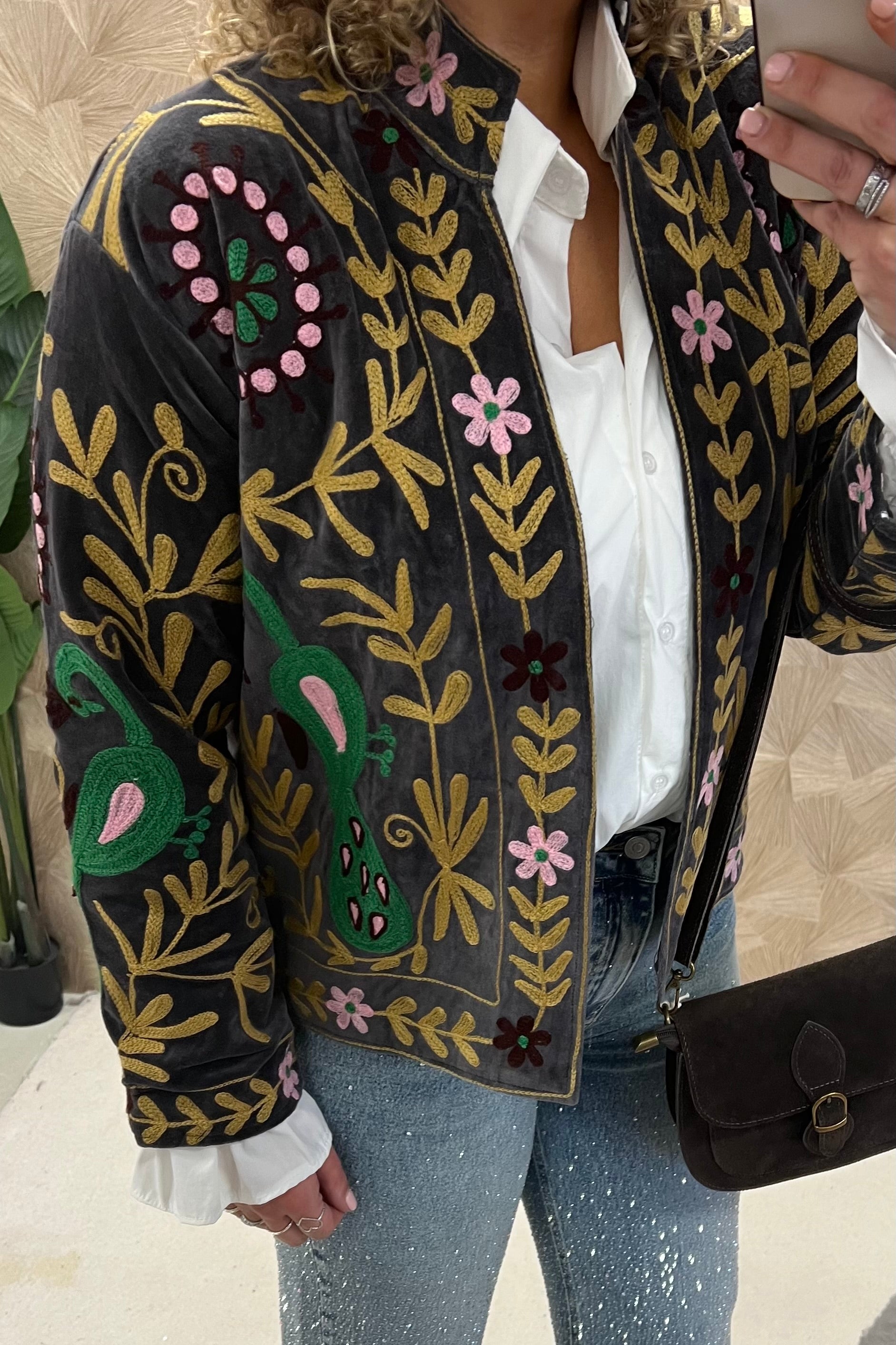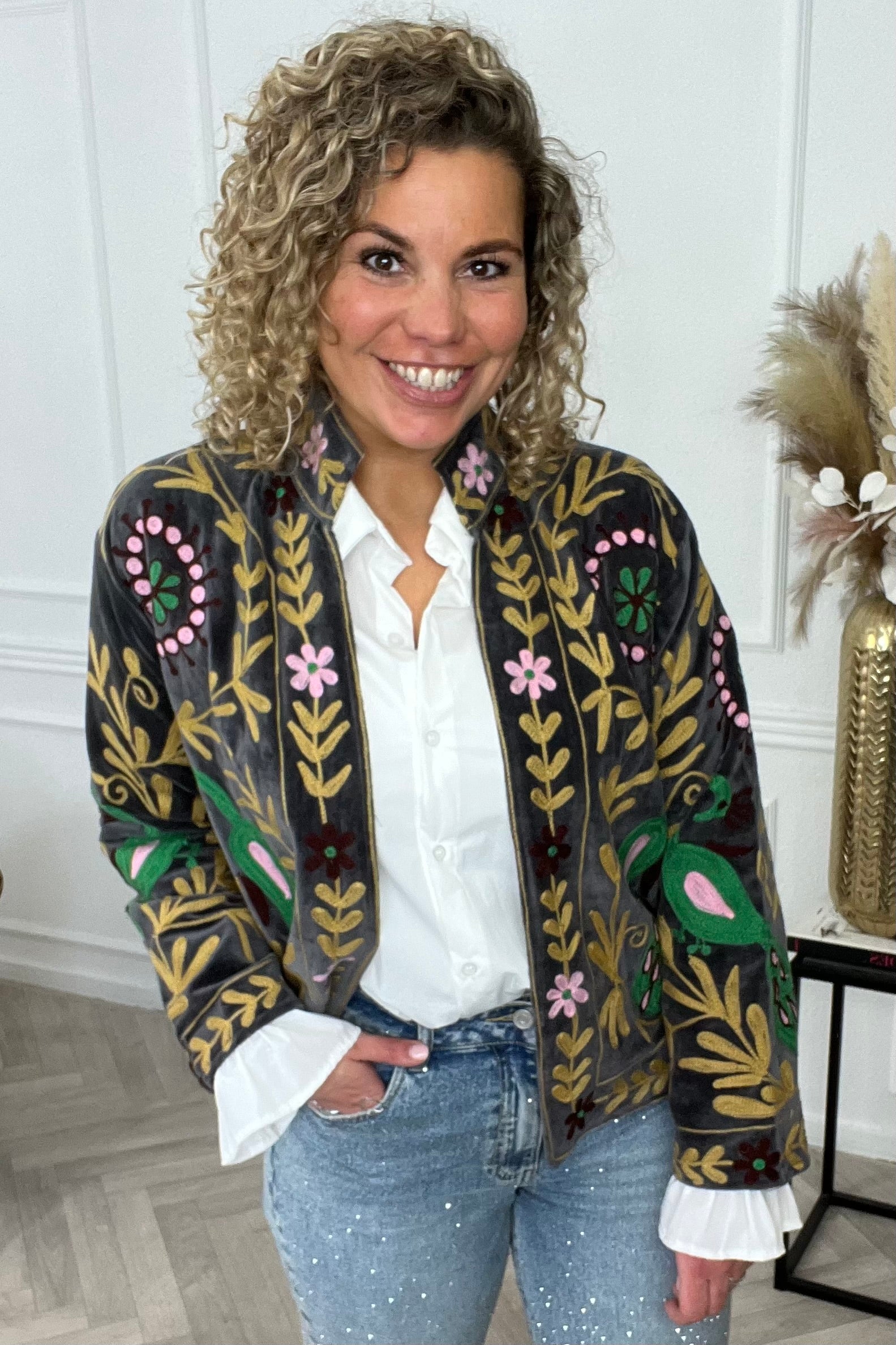 Dit mega leuke jasje is gemaakt van 100% katoen en heeft een velvet look! Dit exemplaar heeft een mooie small peacock print. Shop hem nu in grey/light pink!