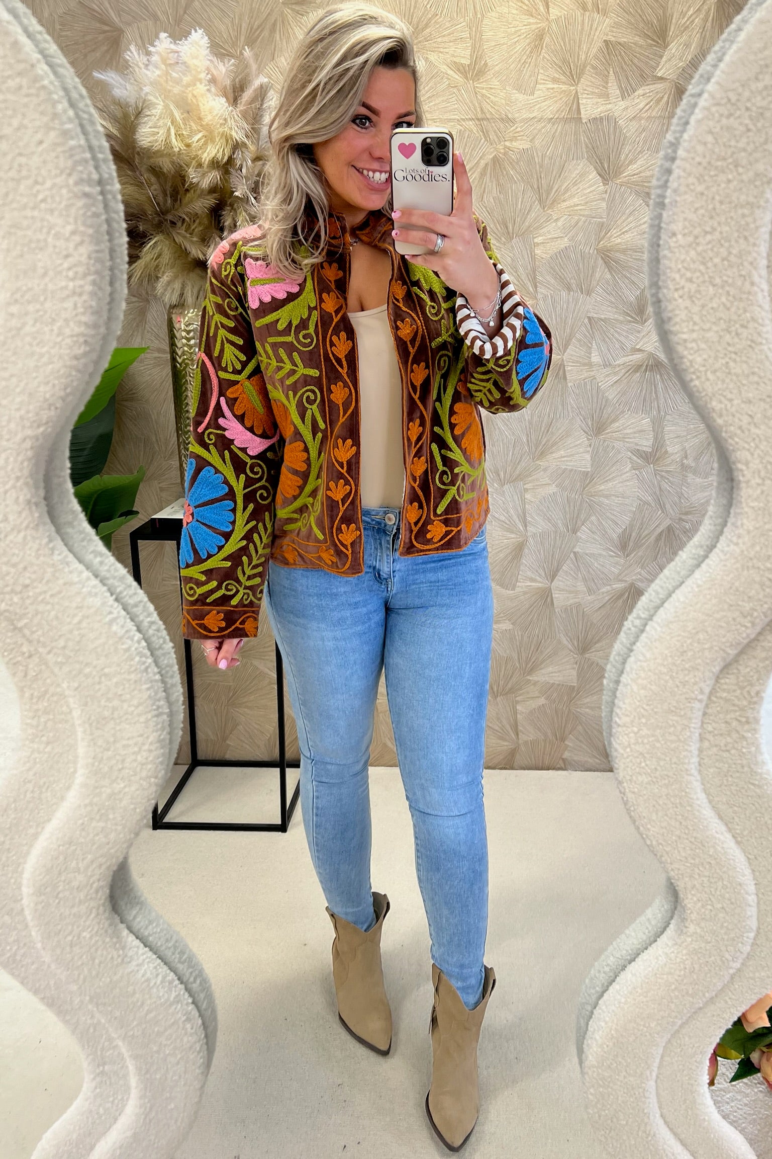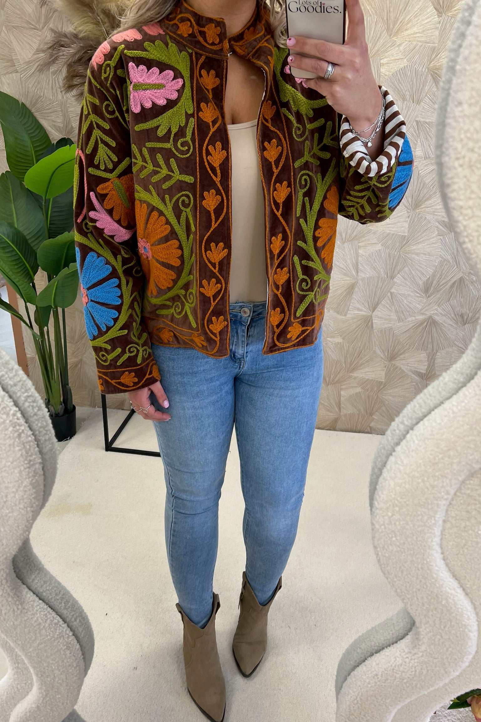 Dit mega leuke jasje is gemaakt van 100% katoen en heeft een velvet look! Dit exemplaar heeft een gave chakri print, hij is ook verkrijgbaar met andere mooie prints. Wees er snel bij en shop the chakri jacket nu in het brown!