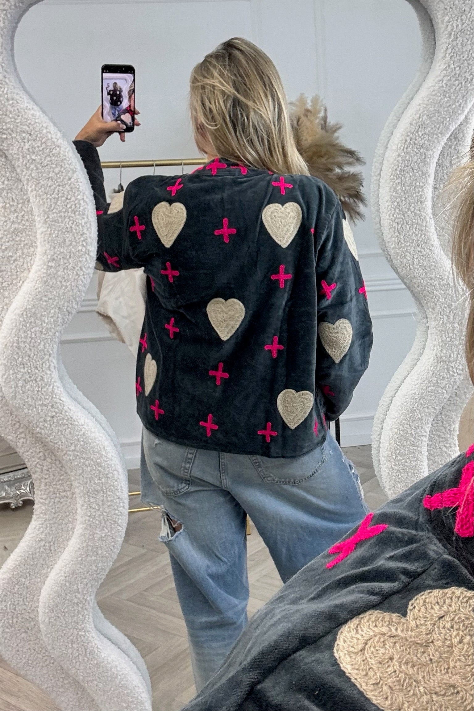Cotton Velvet Heart And Cross Jacket - Dark Grey/Pink