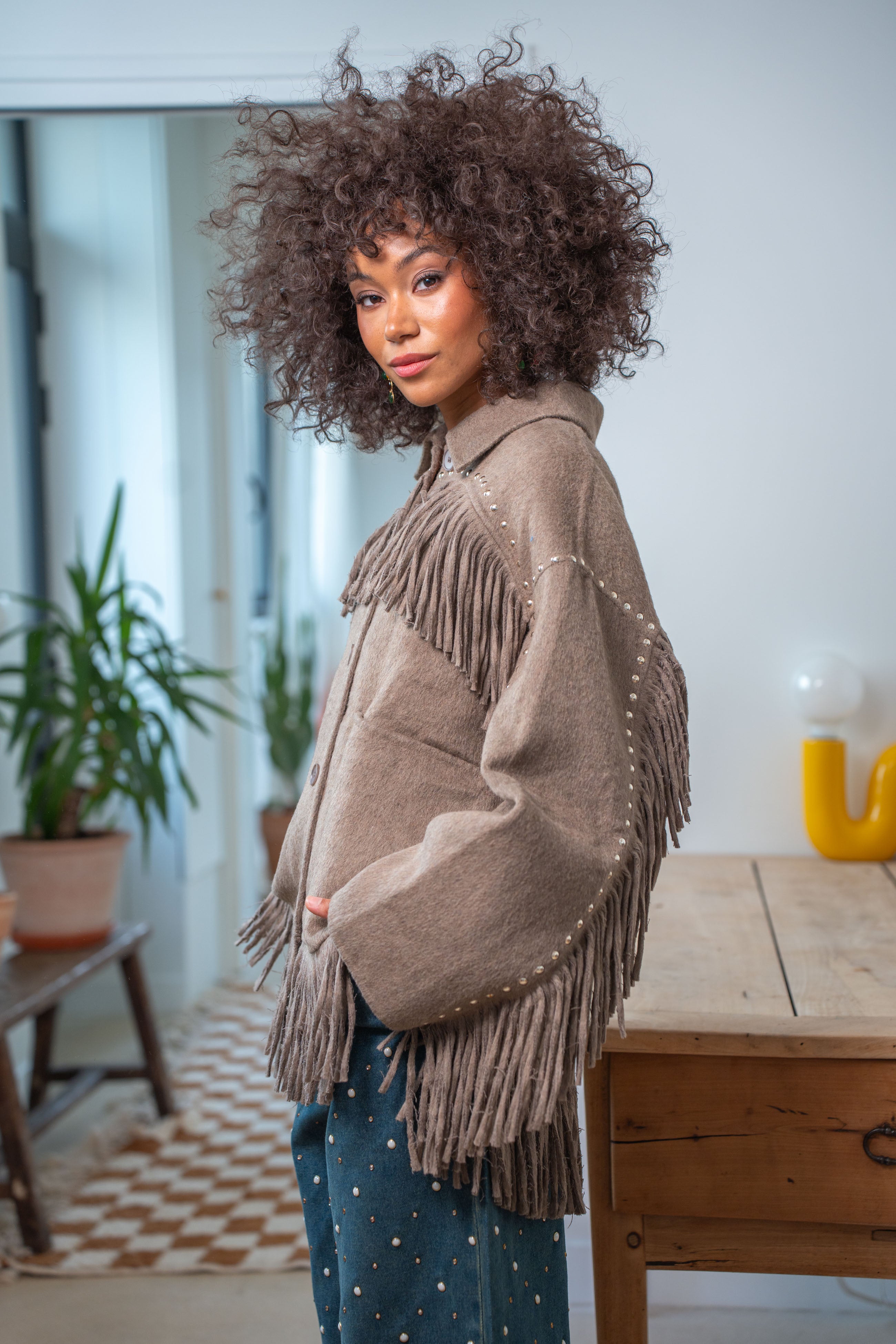 WAUW! Dit fantastische fringe jasje is handgemaakt! Shop de handmade fringe jacket nu snel in taupe.