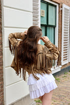 Dit prachtige jacket heeft lange franjes langs de mouwen en rug. Of je nu gaat voor een casual jeans-combi of gestyled met een jurk, je outfit krijgt direct die extra flair!