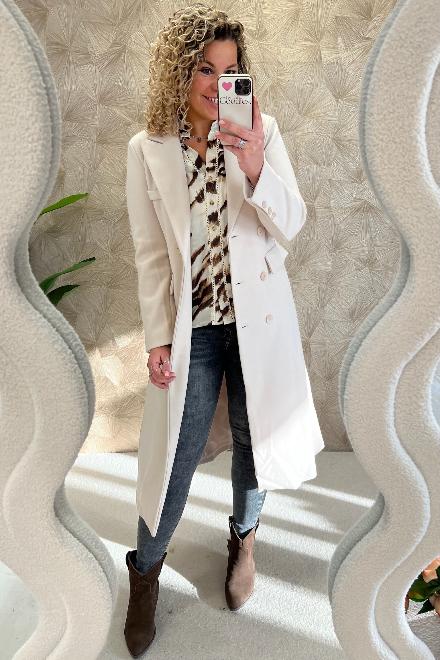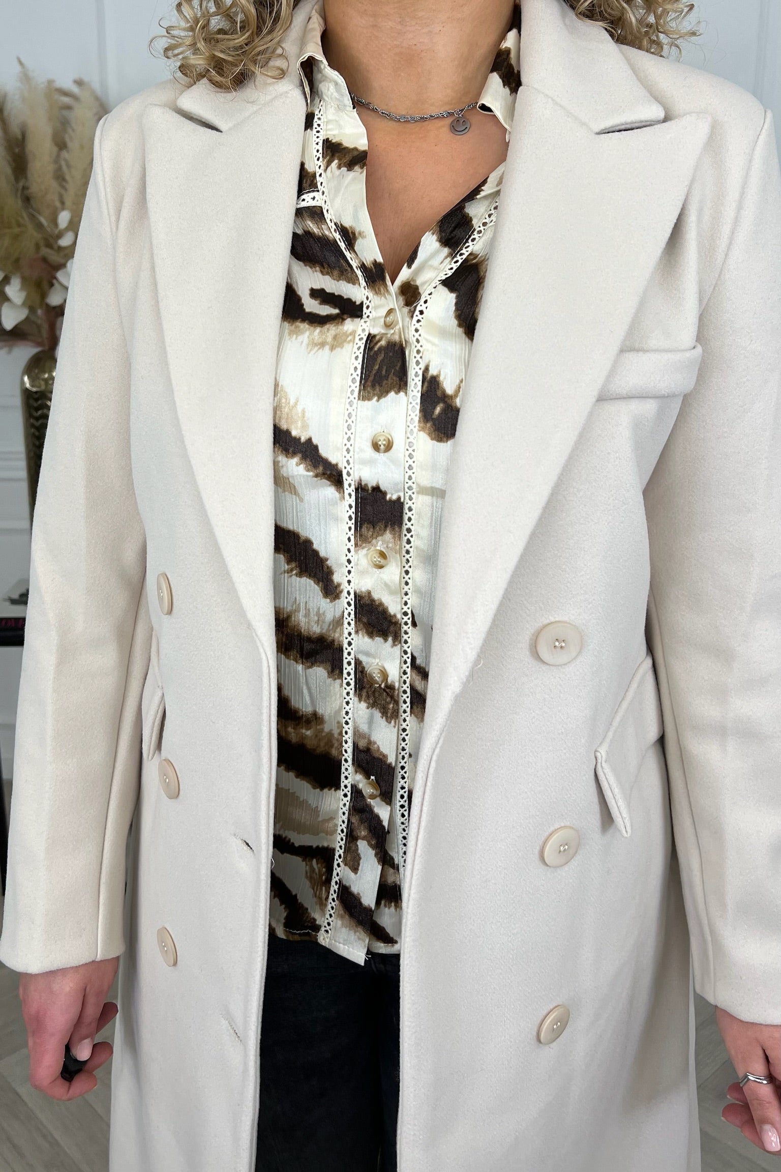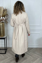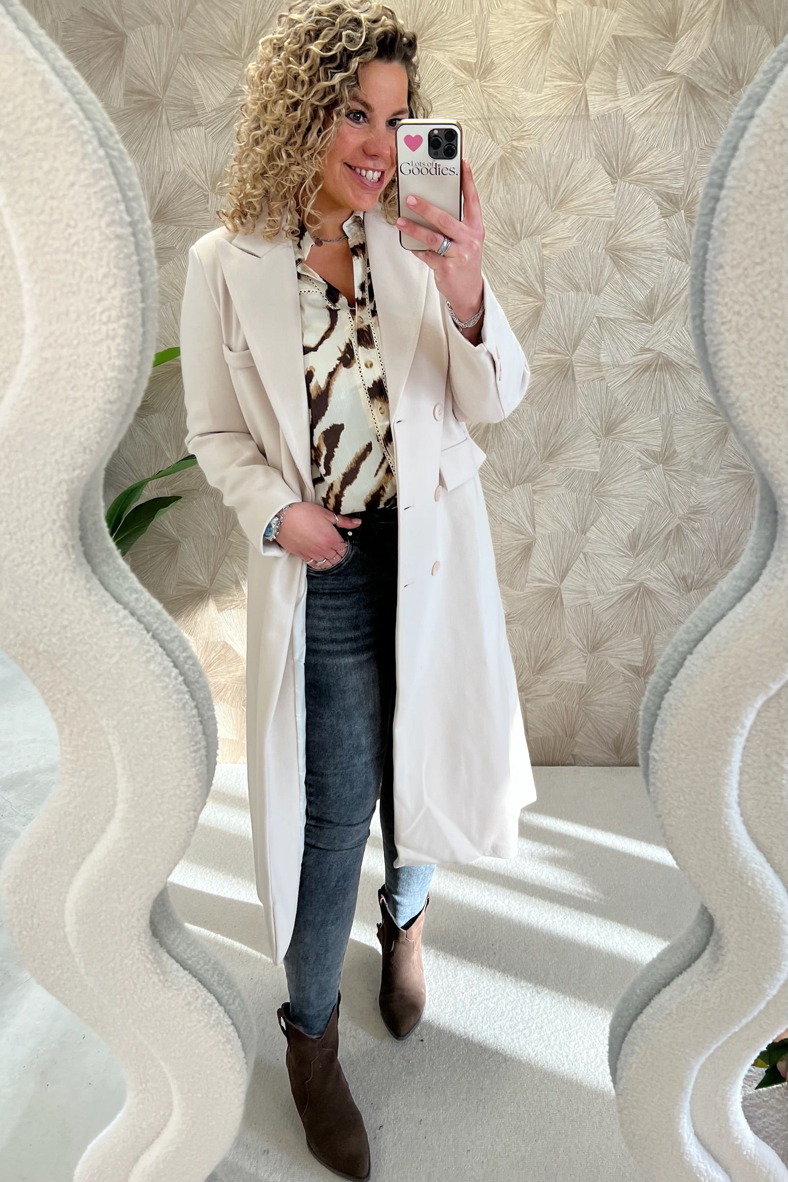 Een prachtige jas met mooie knopen voorop! Deze jas kan je aan de achterkant aantrekken met een soort riempje, waardoor die prachtig op maat en in de taille valt! Shop de back drawstring coat nu snel in beige!