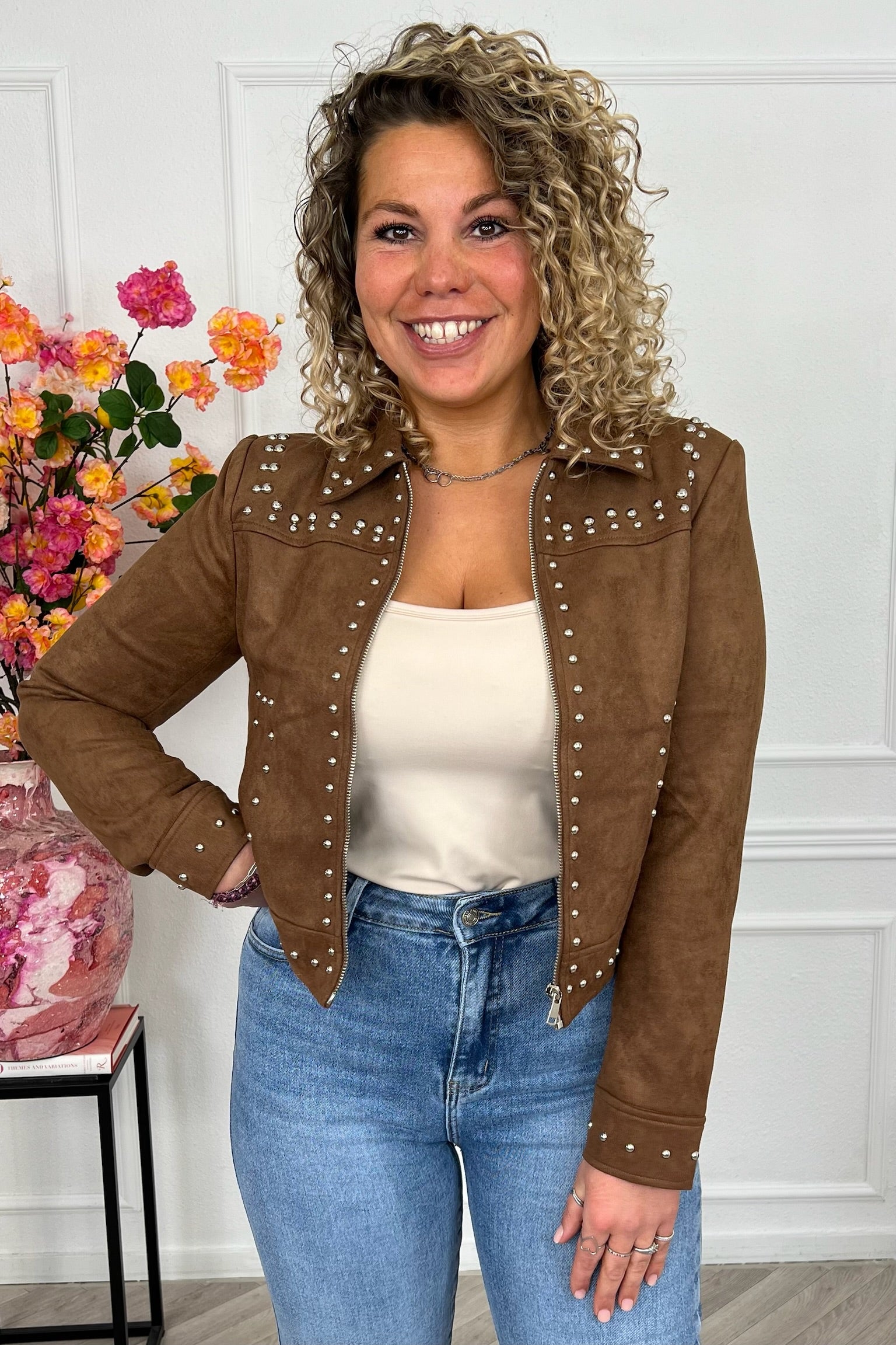 Dit mega leuke jasje heeft een suede look en heeft mooie studs! Nu verkrijgbaar in drie maten, shop hem nu in brown!