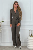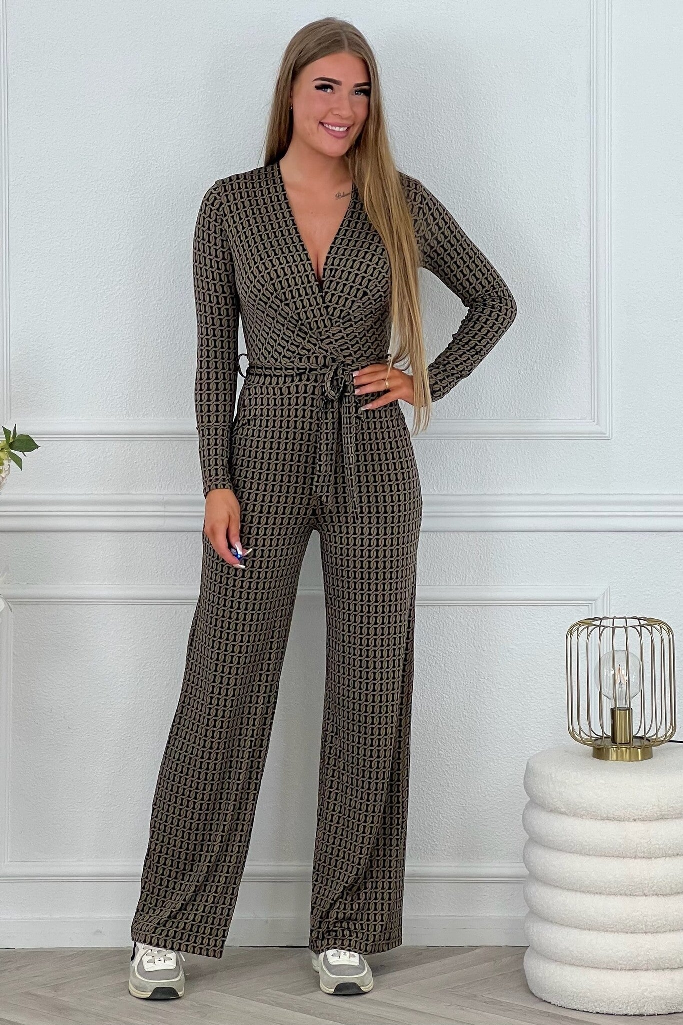 Een mooie jumpsuit met lange mouwen! Verkrijgbaar in verschillende kleuren en printjes! Shop hem met cableprint in black/camel!