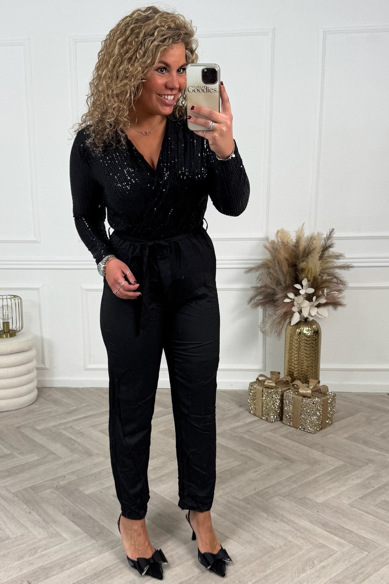 We hebben een superleuke nieuwe sequin jumpsuit binnen voor de feestdagen! Met een v-hals, een ceintuur en heel veel glitters! Shop hem nu in black.