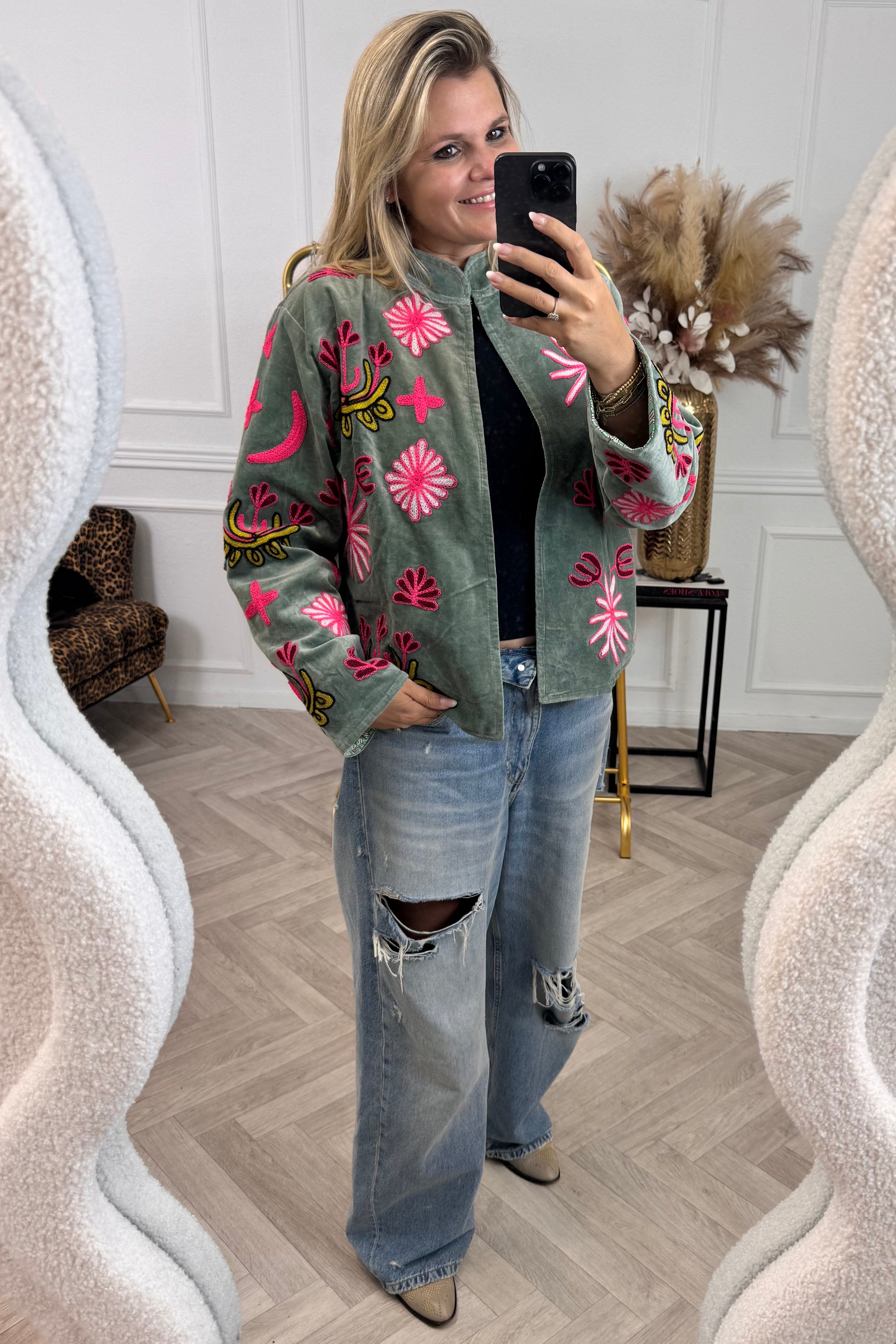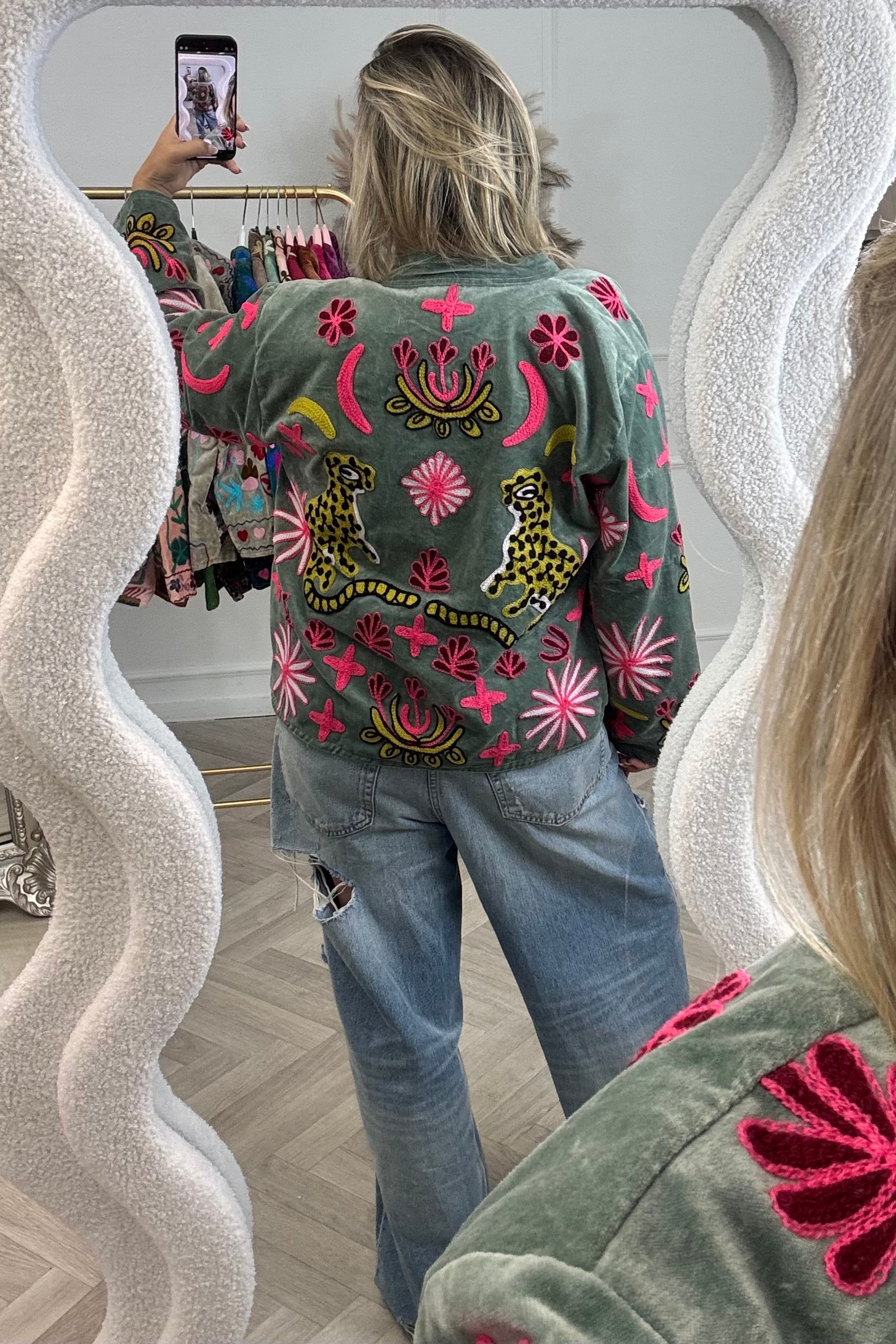 Dit mega leuke jasje is gemaakt van 100% katoen en heeft een velvet look! Dit exemplaar heeft een mooie leopard print. Shop hem nu in sage!