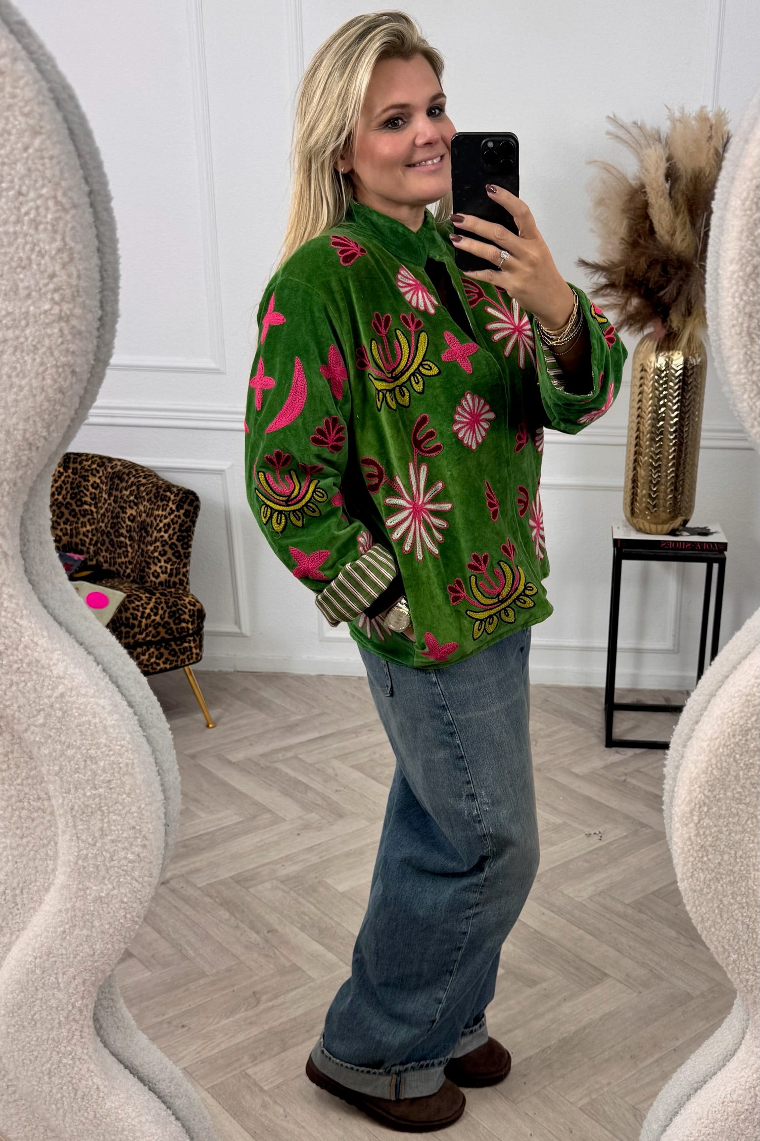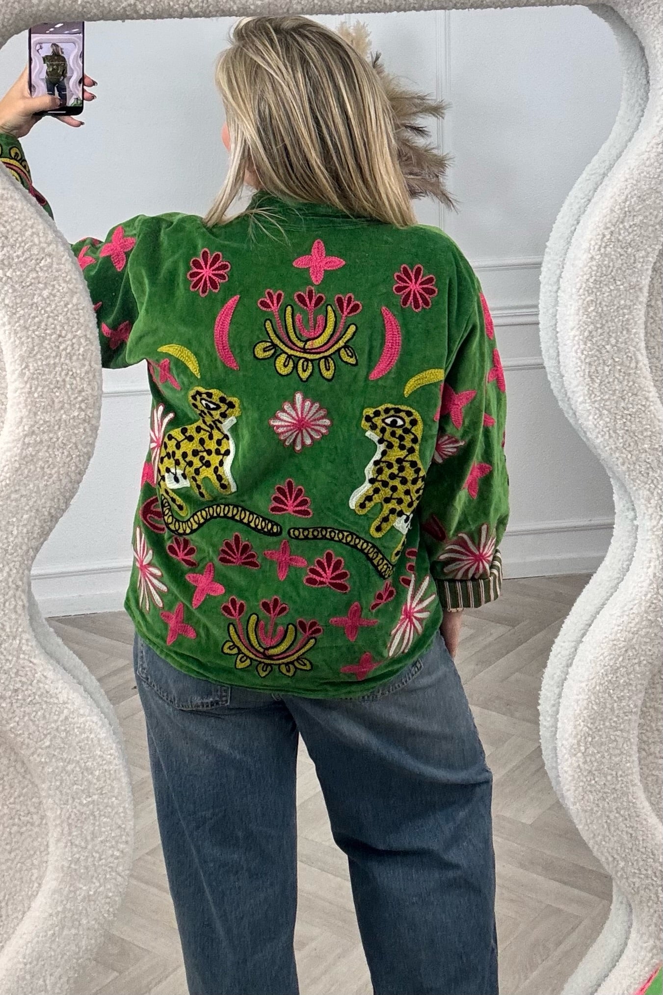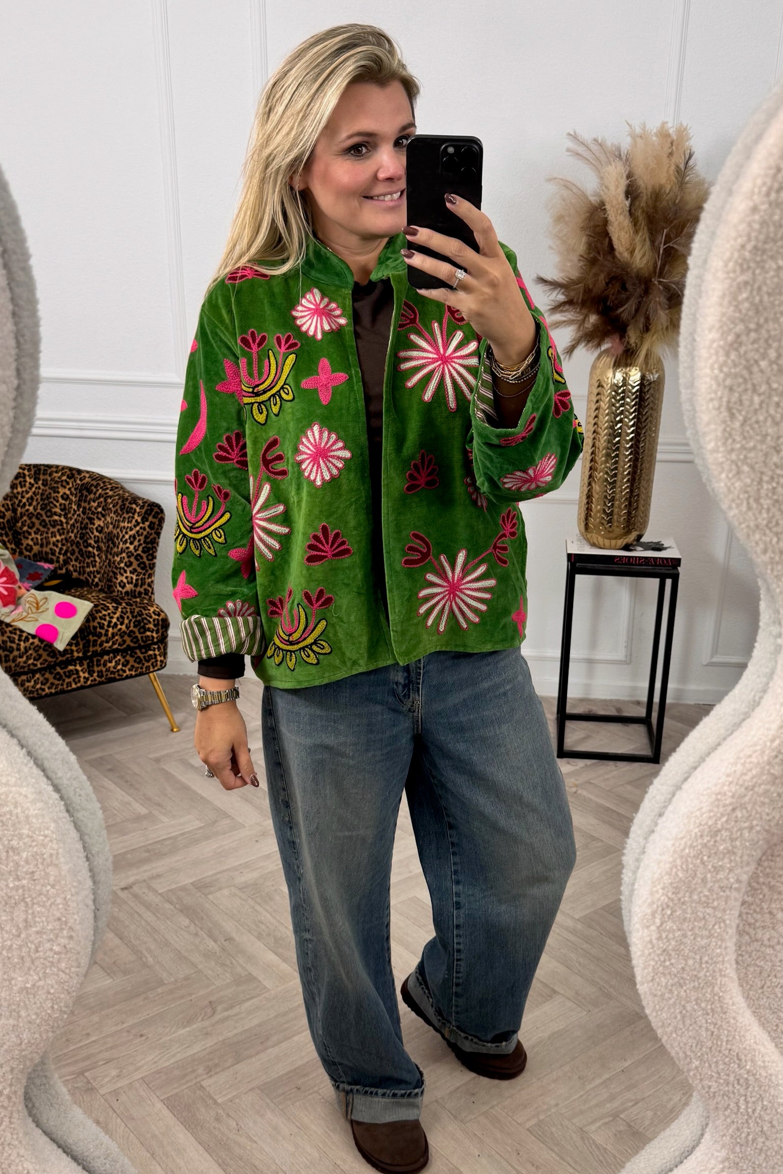 Dit mega leuke jasje is gemaakt van 100% katoen en heeft een velvet look! Dit exemplaar heeft een gave star flower print met een luipaard op de rug, hij is ook verkrijgbaar met andere mooie prints. Wees er snel bij en shop hem in green!