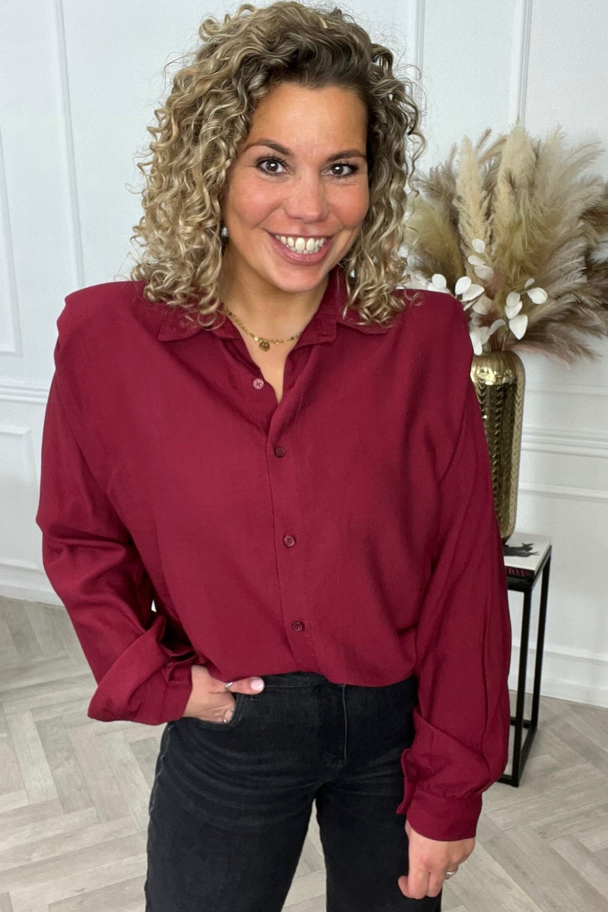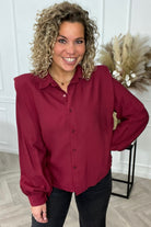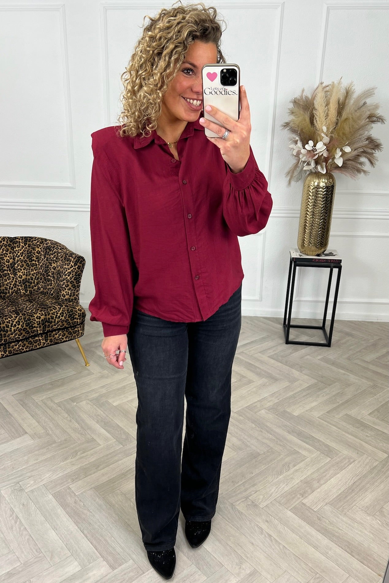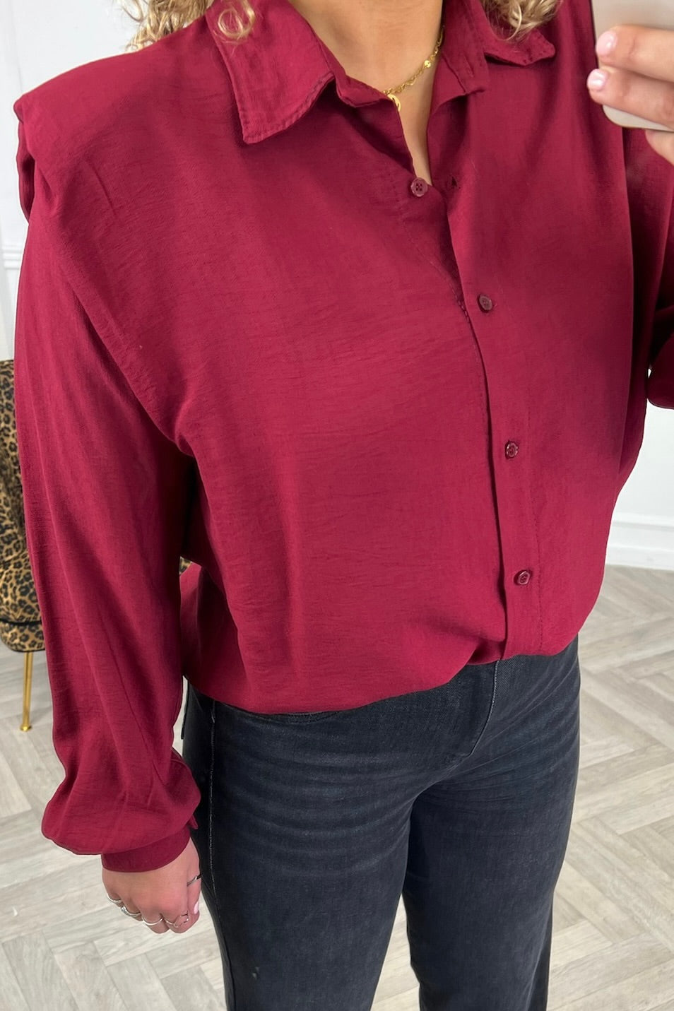 We hebben een prachtige nieuwe blouse met schoudervulling binnen! Shop de celeste shoulder blouse nu in bordeaux!
