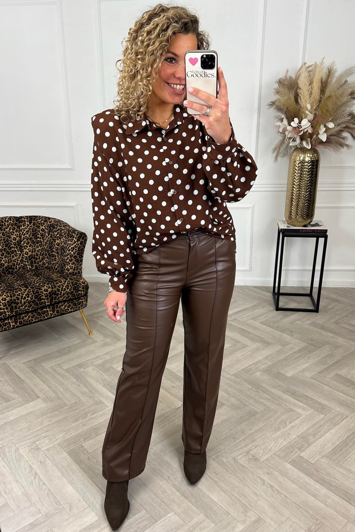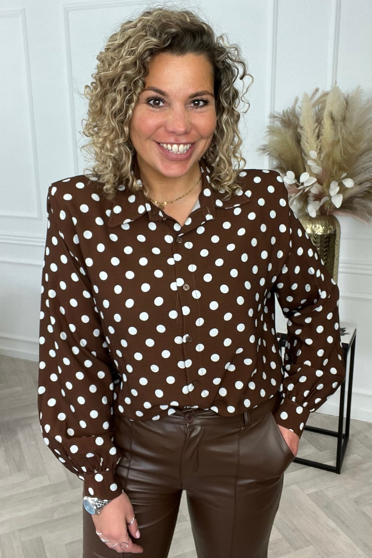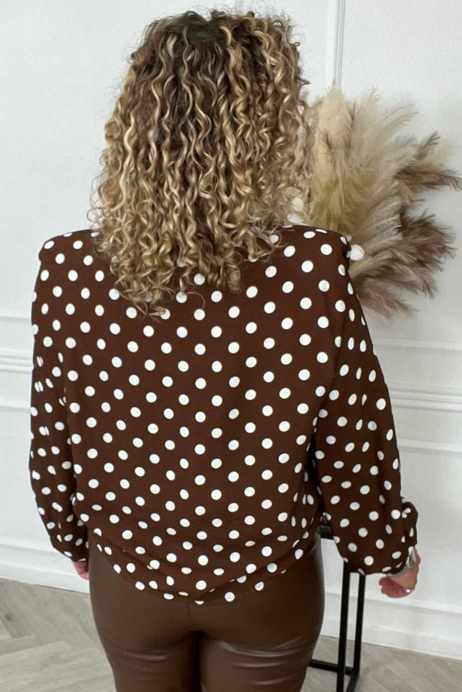 We hebben een prachtige nieuwe blouse met schoudervulling binnen! Shop de celeste shoulder blouse nu in brown met stippen!