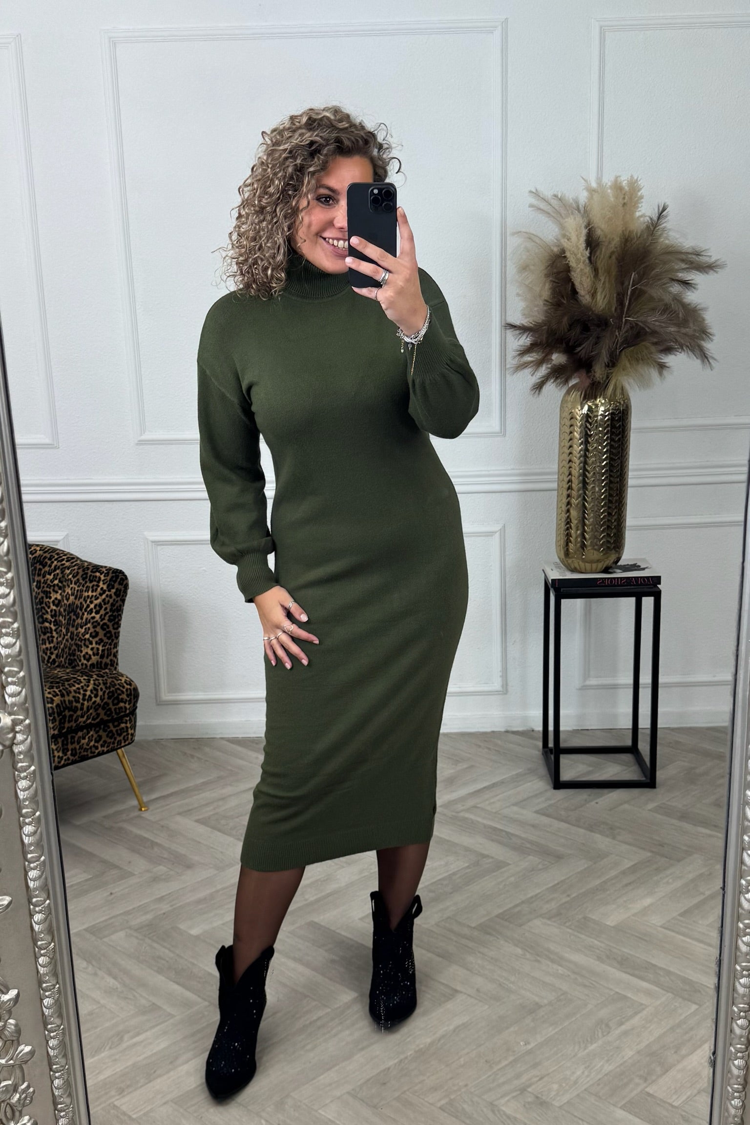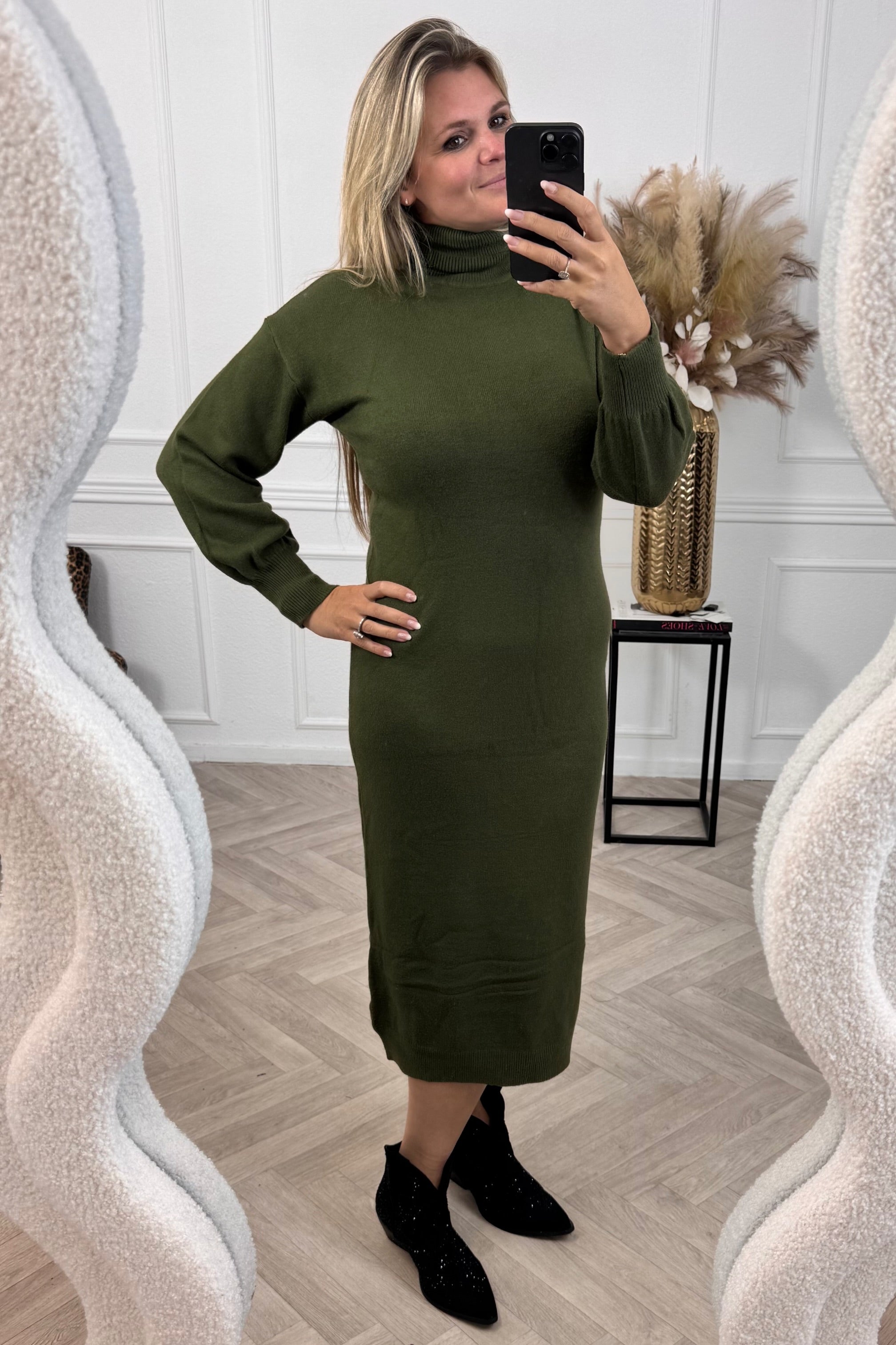 Super fijne jurk, lekker lang, leuke mauwen en een heerlijk colletje voor de echt koude dagen! Shop de wonderful coll dress nu in armygreen!