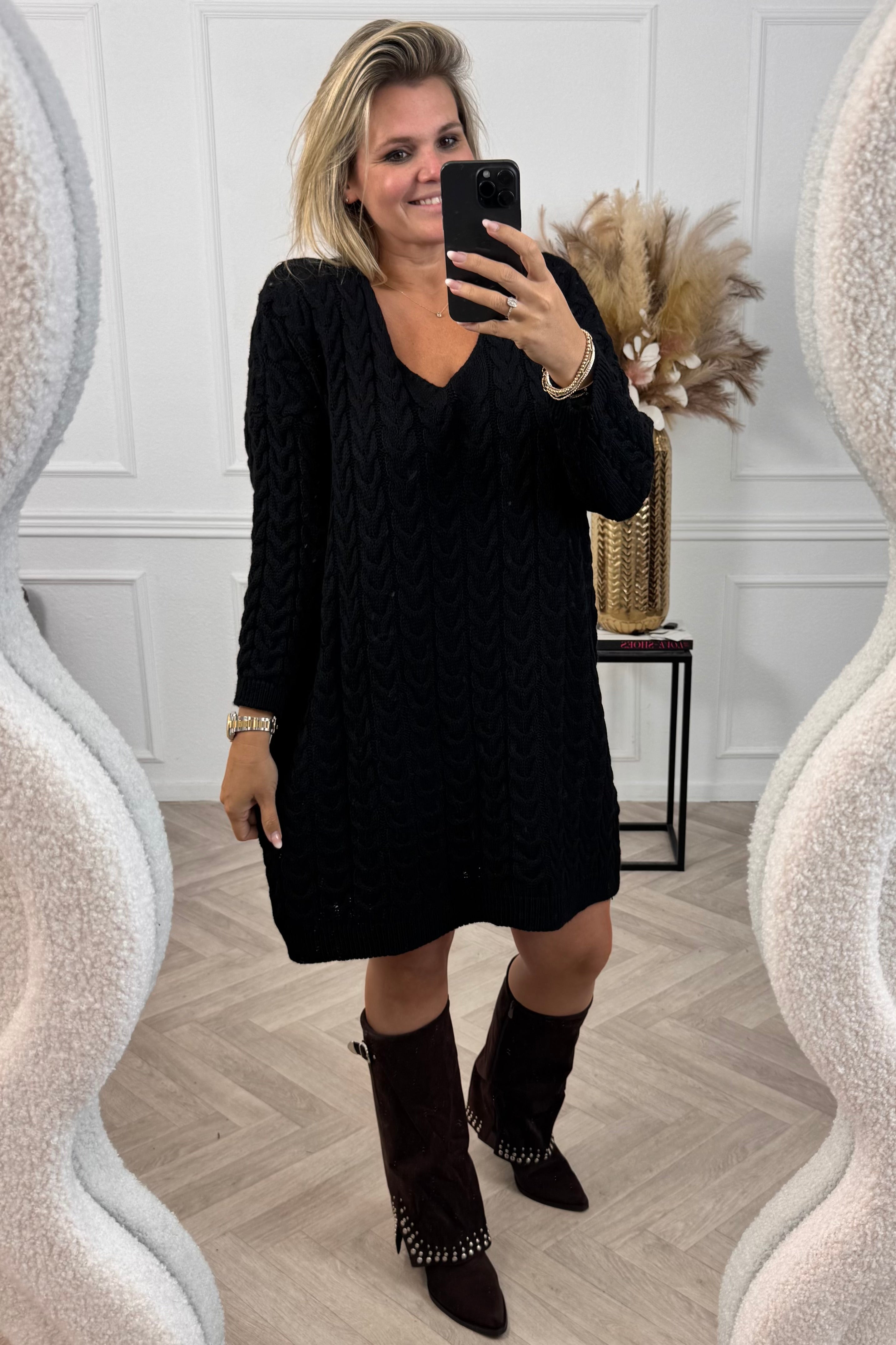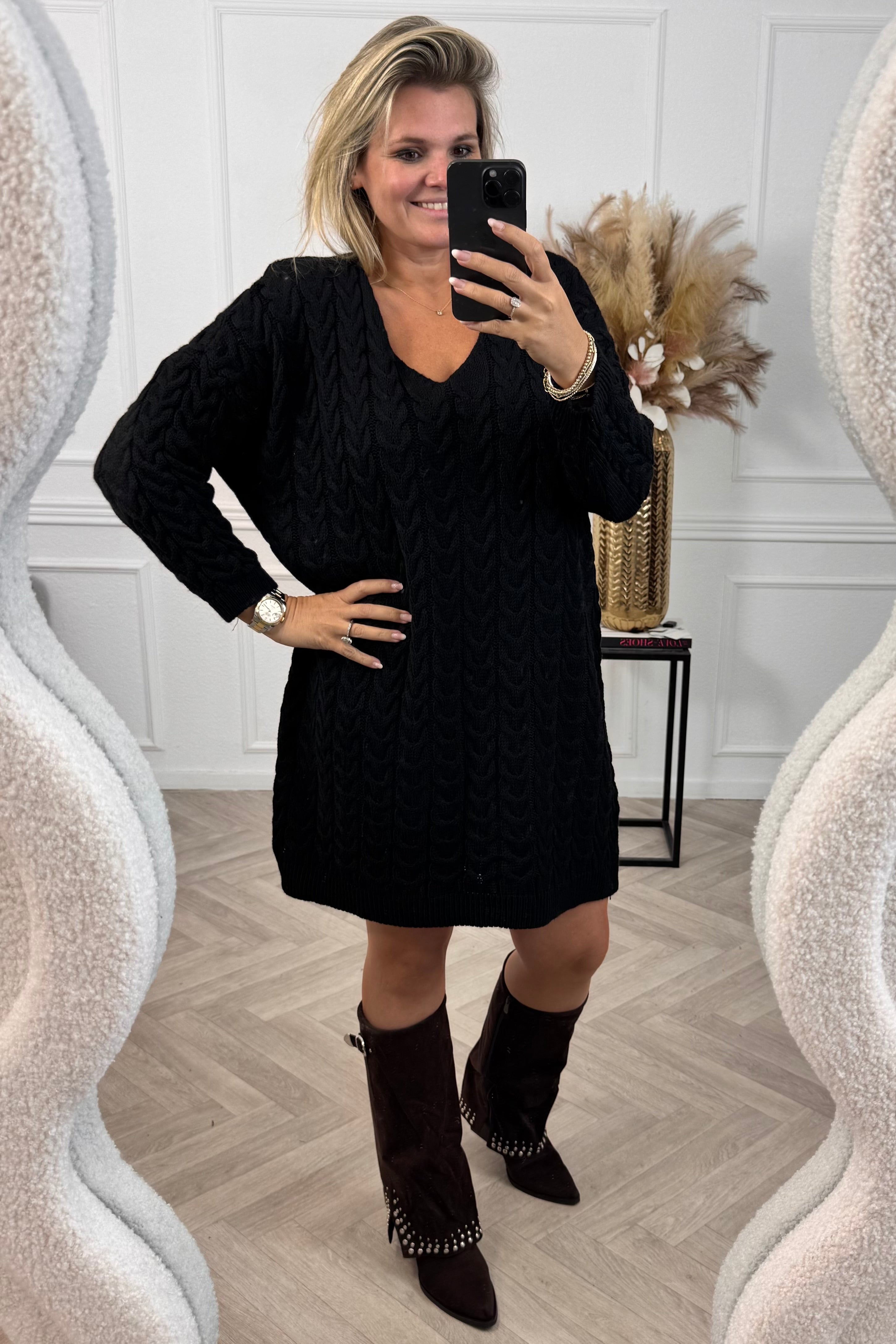 Een super dress voor deze tijd. Zit heerlijk comfy en warm, maar ziet er alsnog fantastisch uit! Shop de braided sweater dress nu in black!
