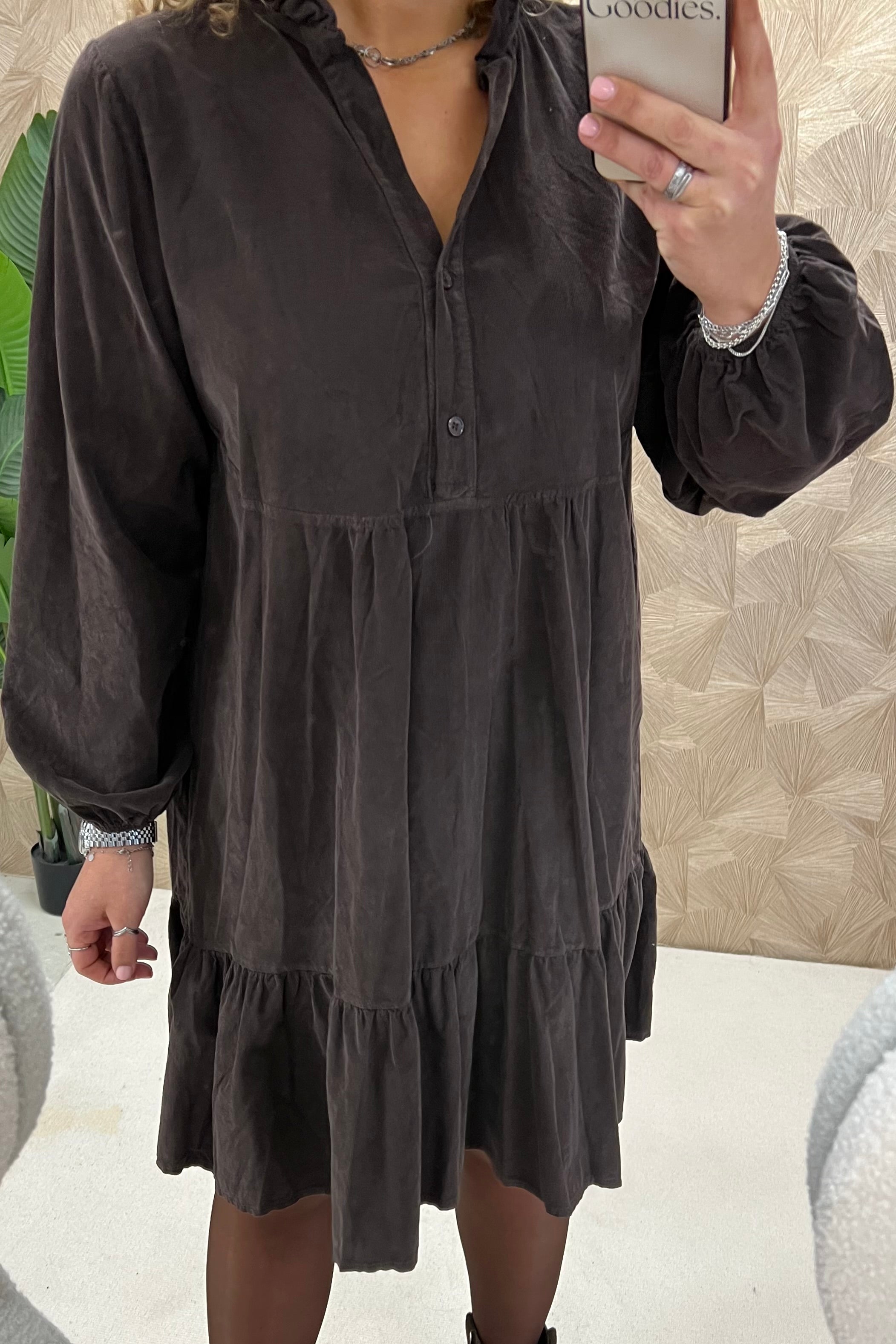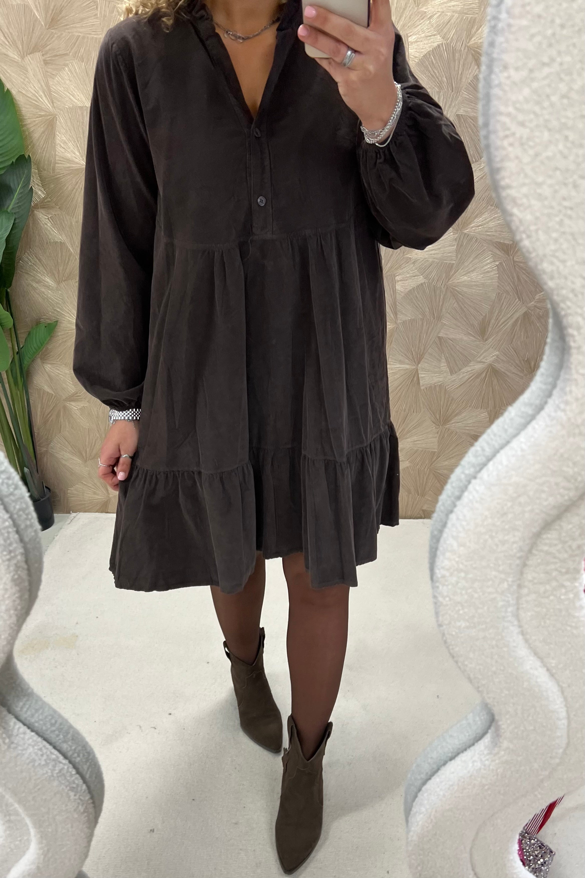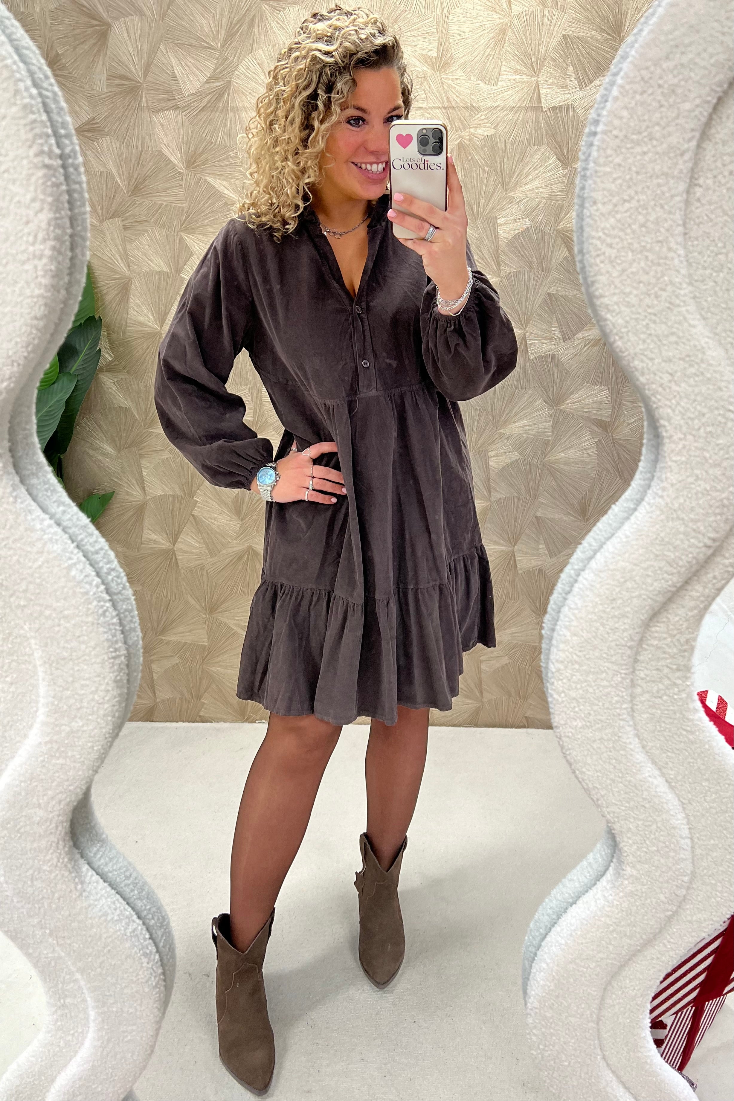 Deze prachtige corduroy A-line dress is gemaakt van 100% katoen! Wij zijn gek op die fijne ribstof! Shop hem in brown!