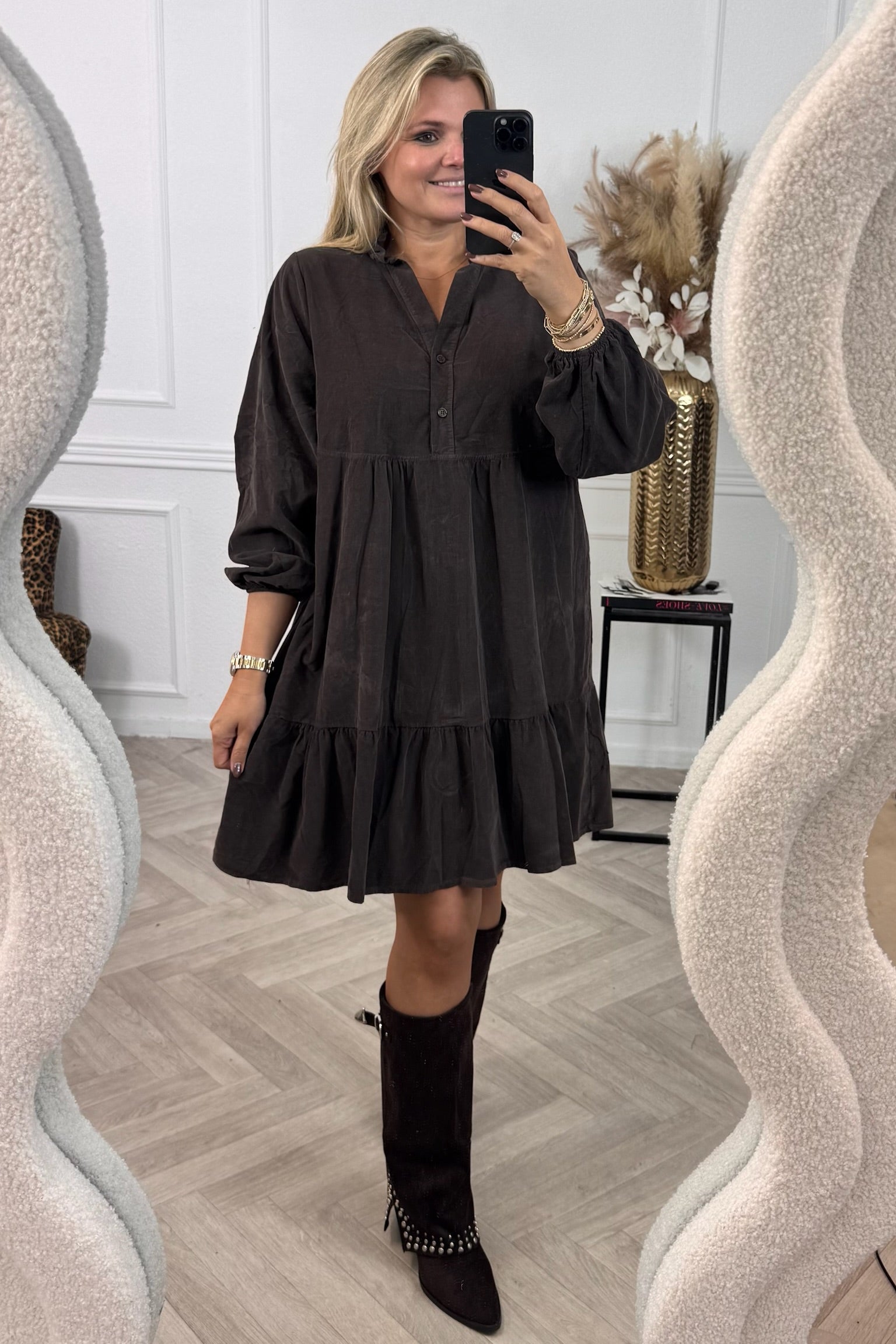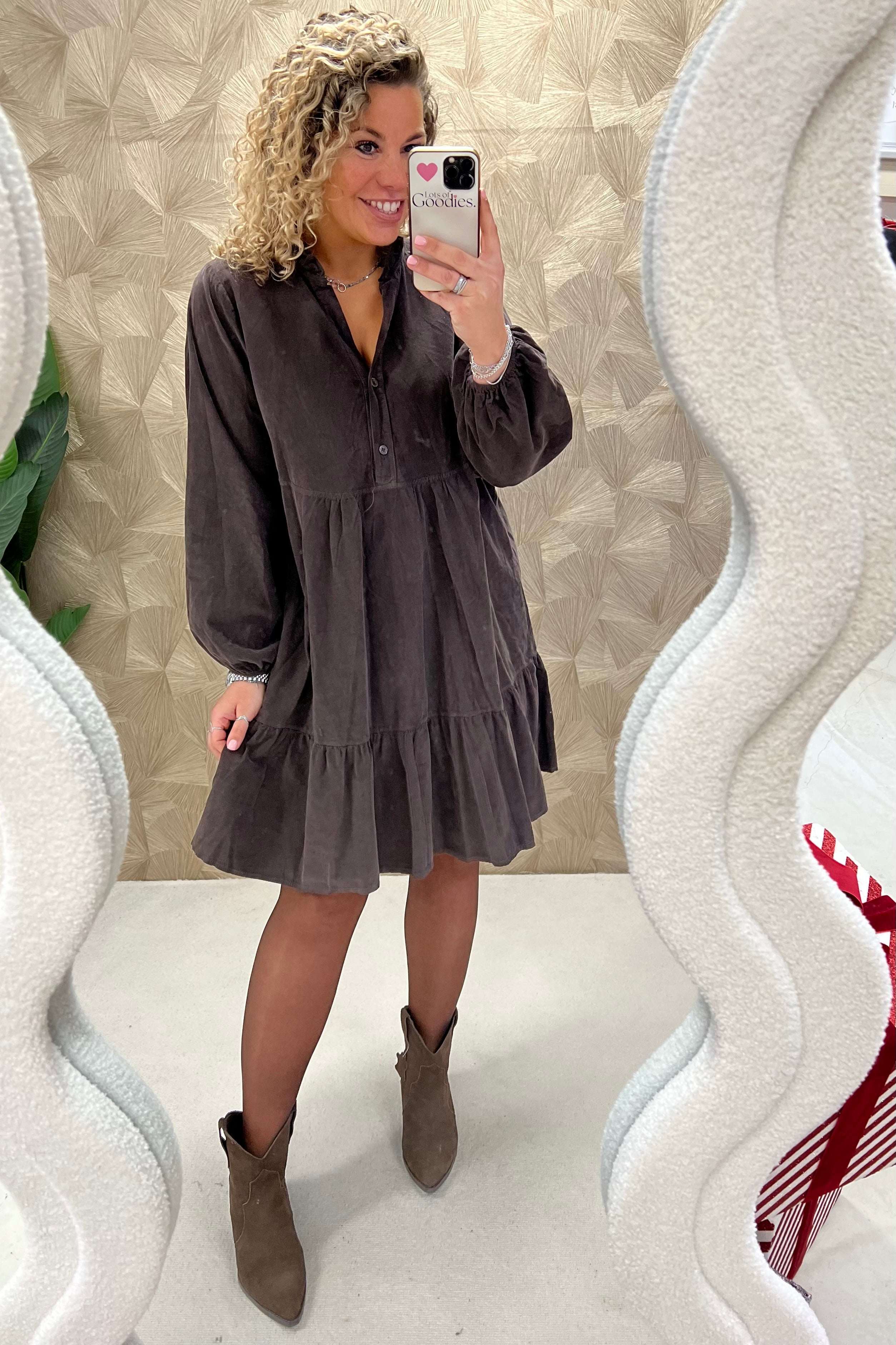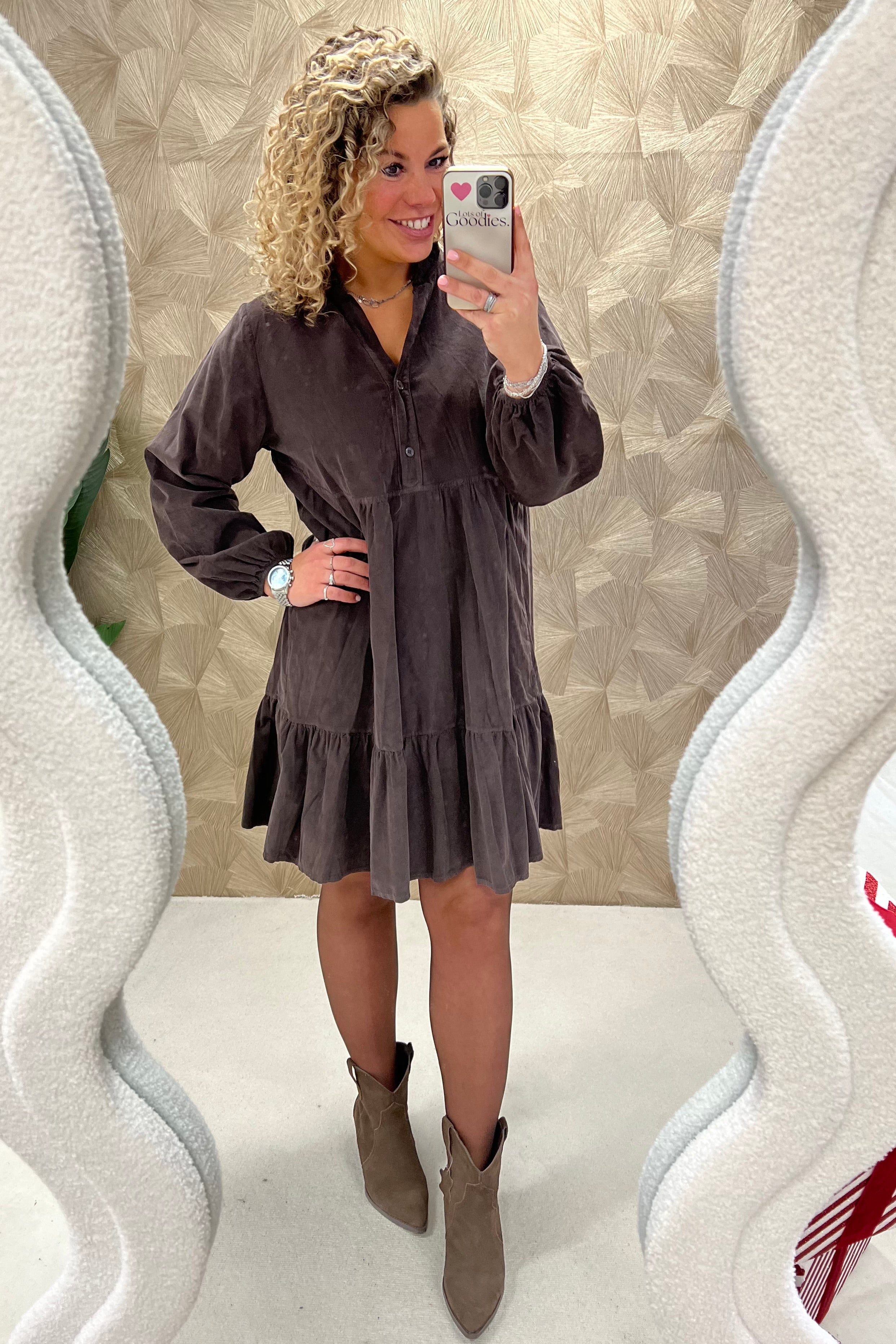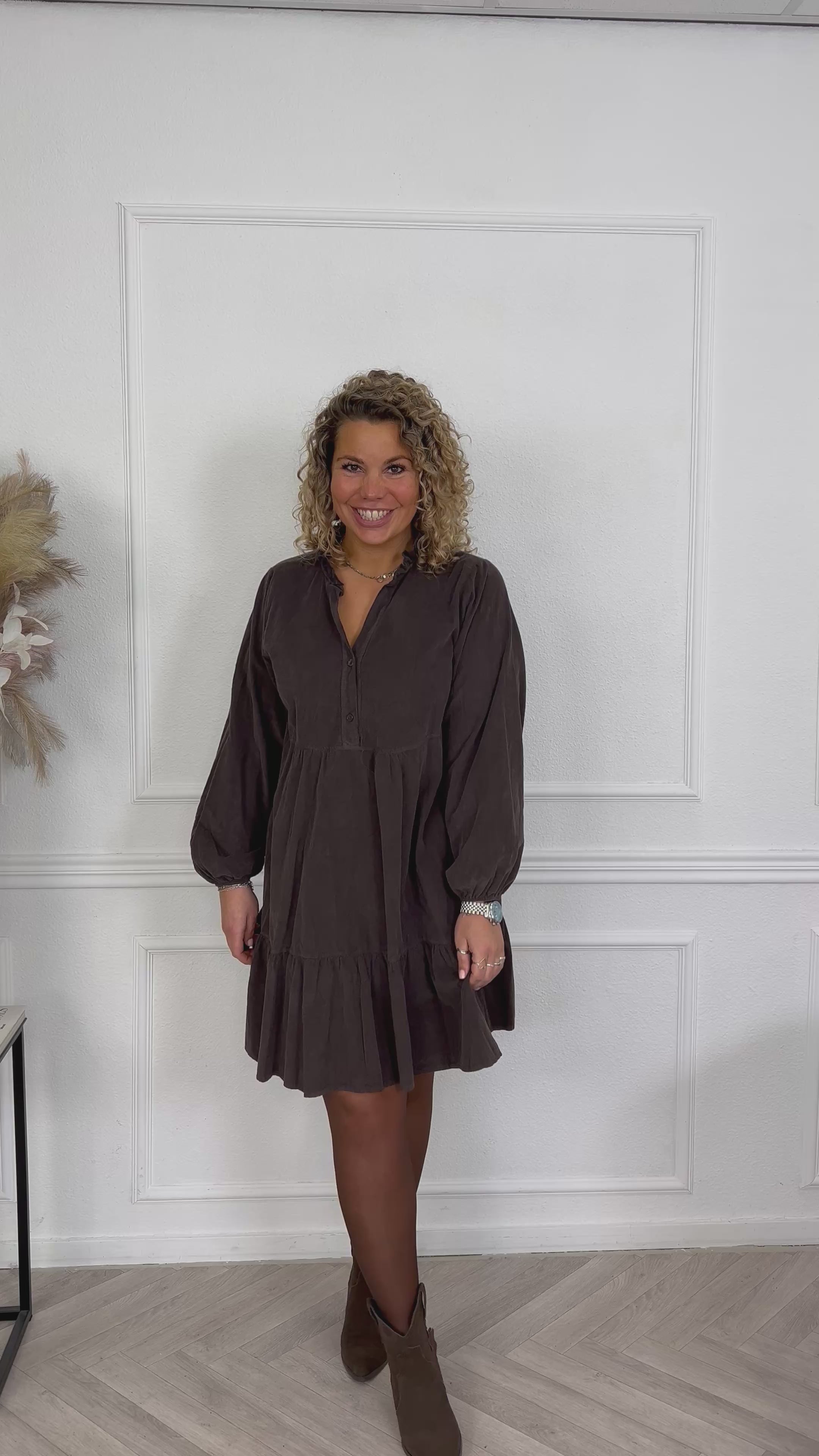 Deze prachtige corduroy A-line dress is gemaakt van 100% katoen! Wij zijn gek op die fijne ribstof! Shop hem in brown!