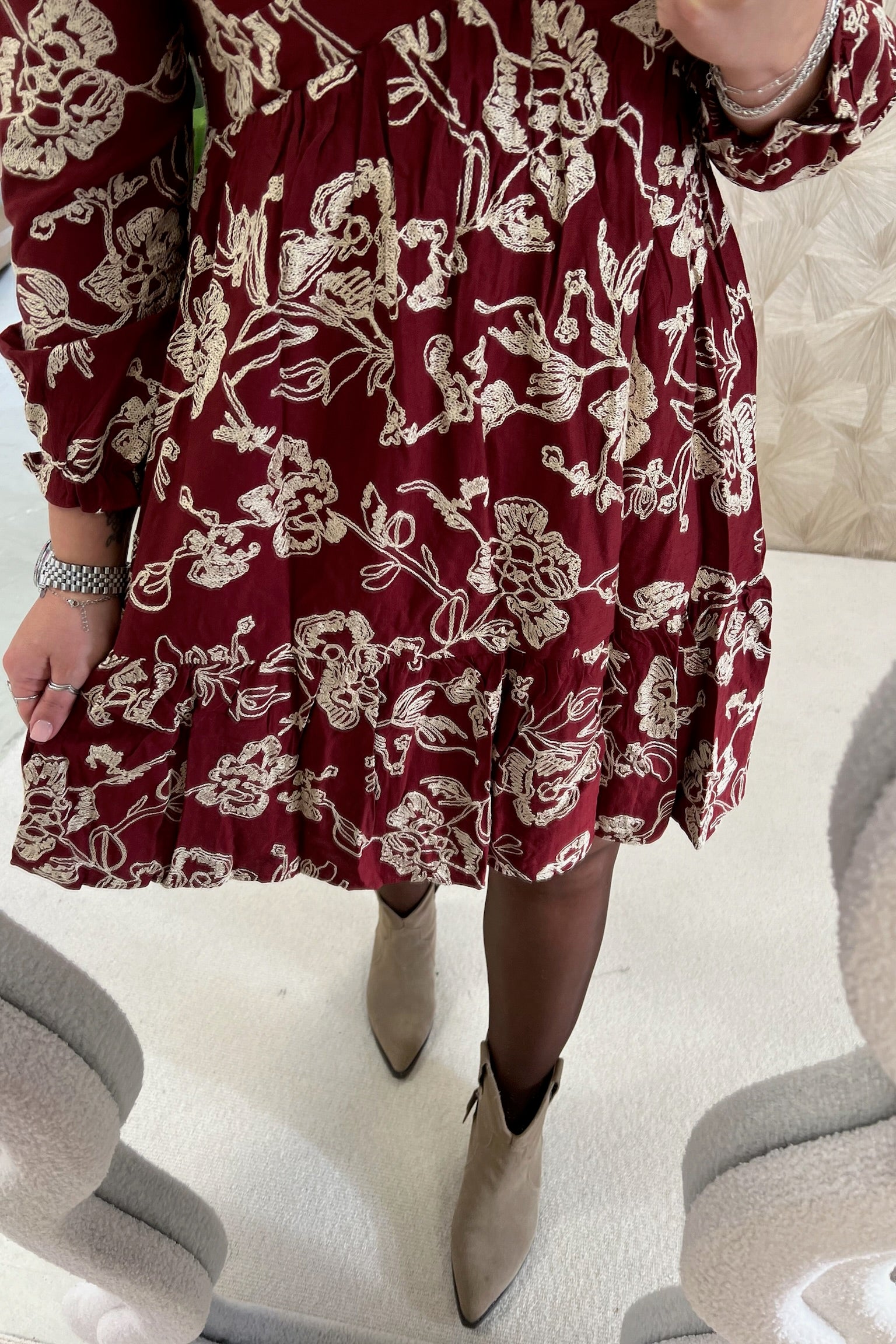 Een heerlijk zacht jurkje met een enig patroon! Shop de ivy flower dress nu in Bordeaux.