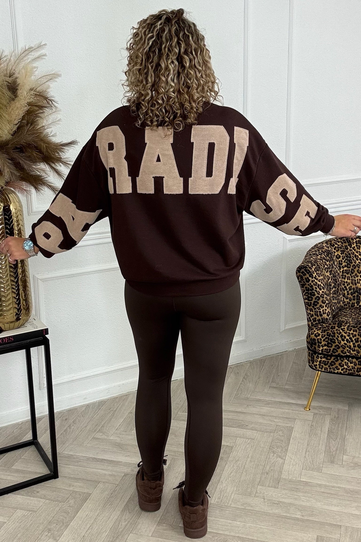 Een heerlijke sweater met een tekst op de achterkant! Shop hem nu in brown/taupe!