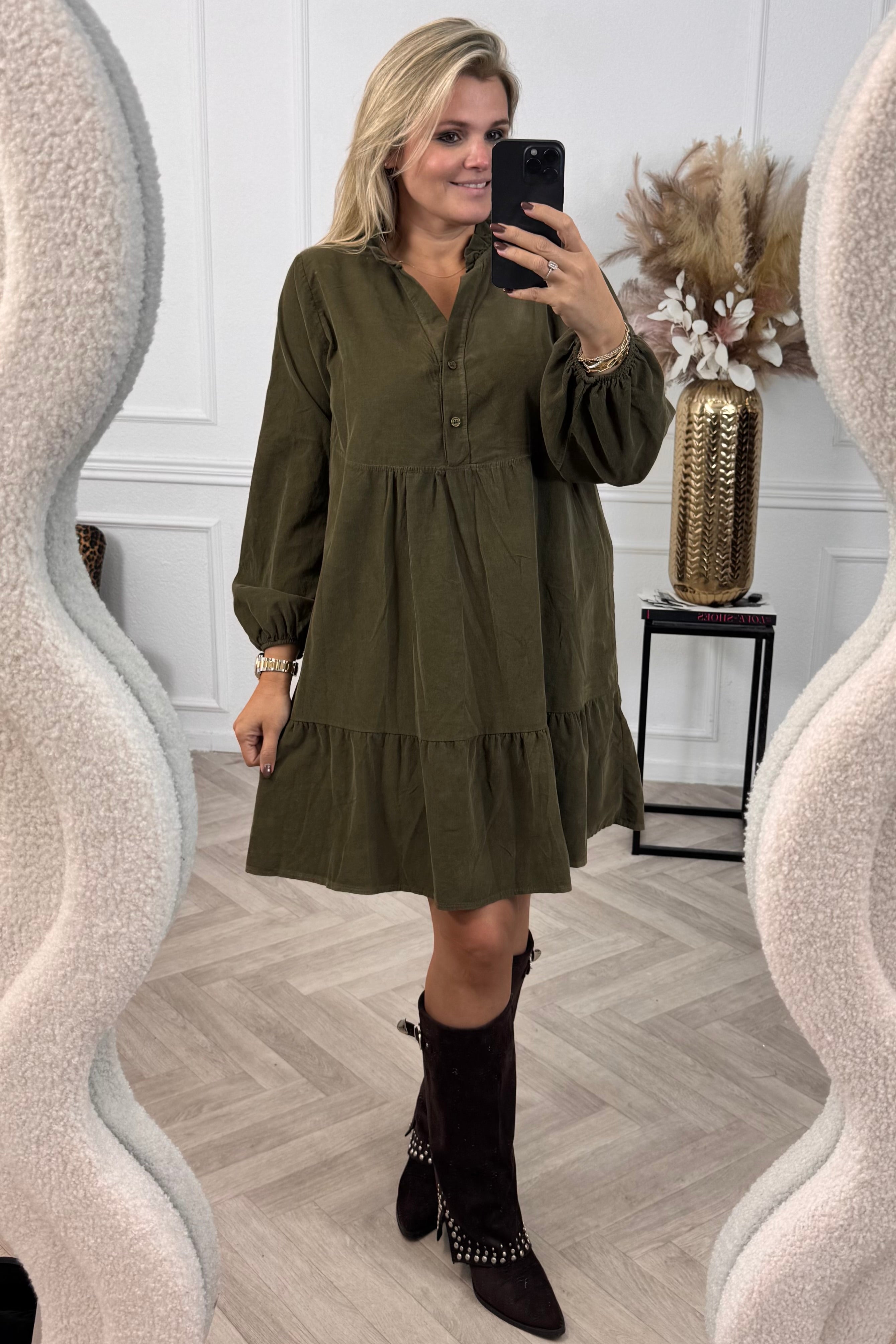 Deze prachtige corduroy A-line dress is gemaakt van 100% katoen! Wij zijn gek op die fijne ribstof! Shop hem in armygreen!
