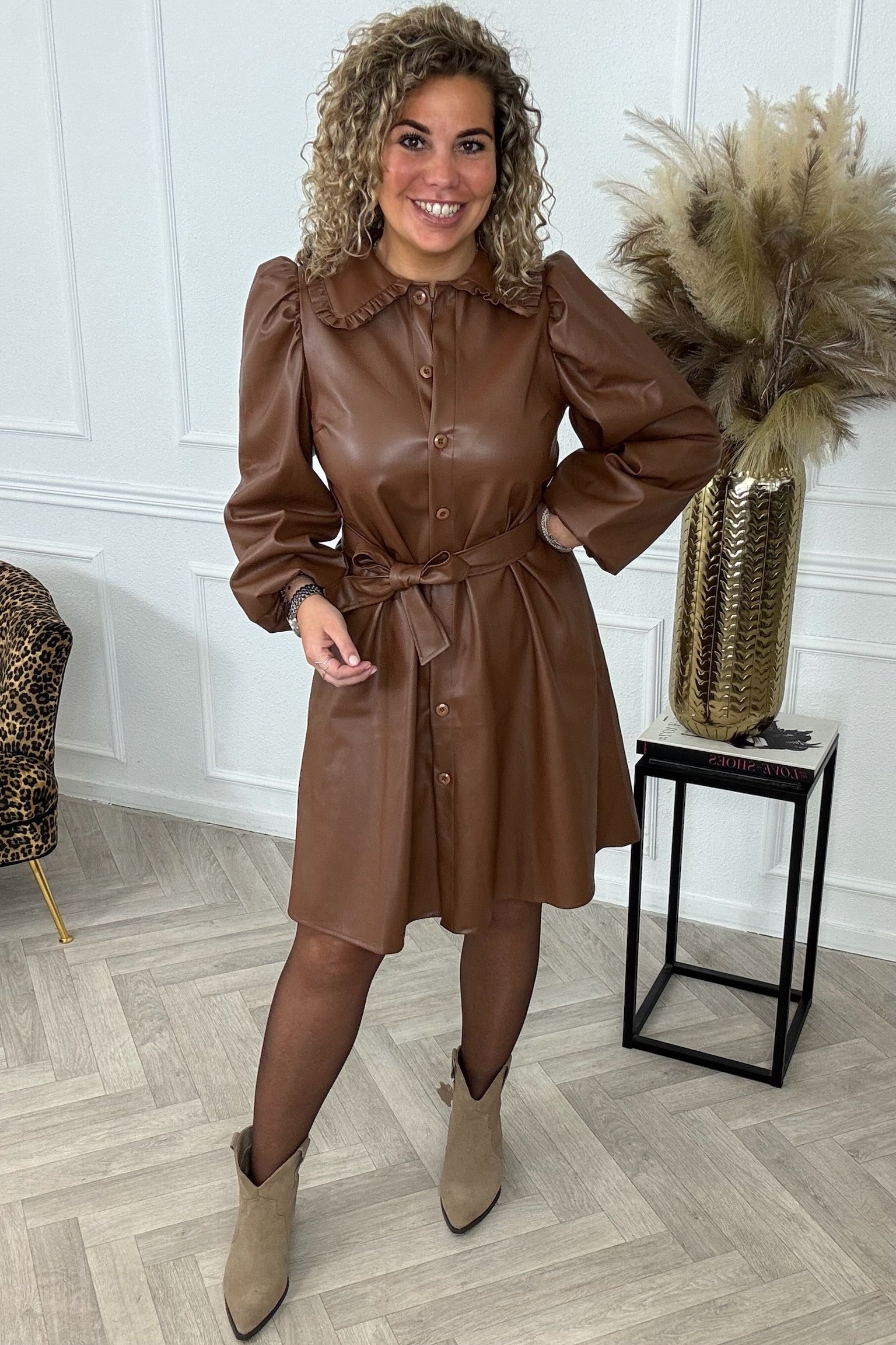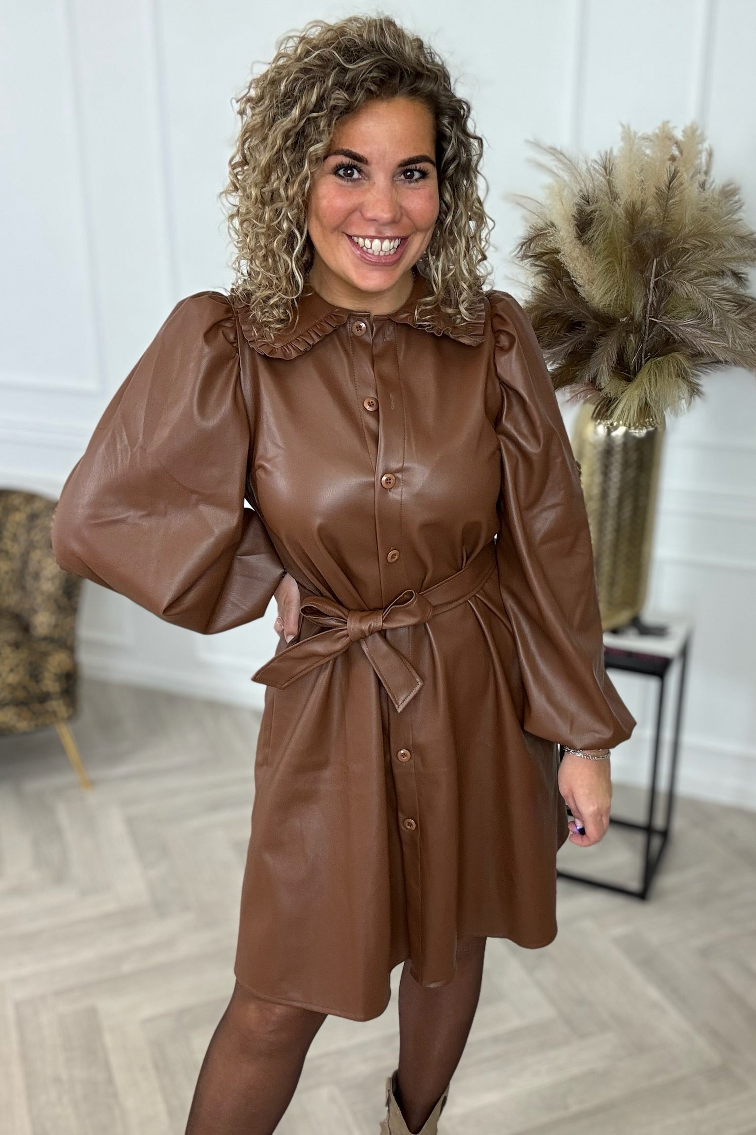 Dit prachtige fake leather jurkje is helemaal het einde! Hij heeft een mooi koordje, een prachtig afgewerkte kraag en ballonmouwtjes. Van ons eigen label, dus uniek! Shop hem nu in brown!