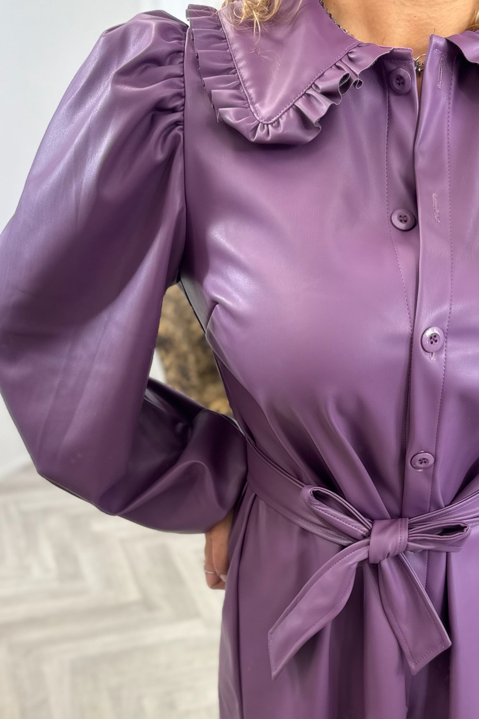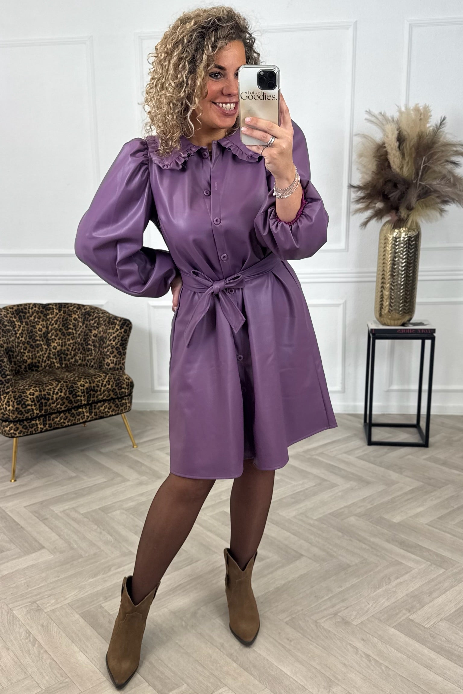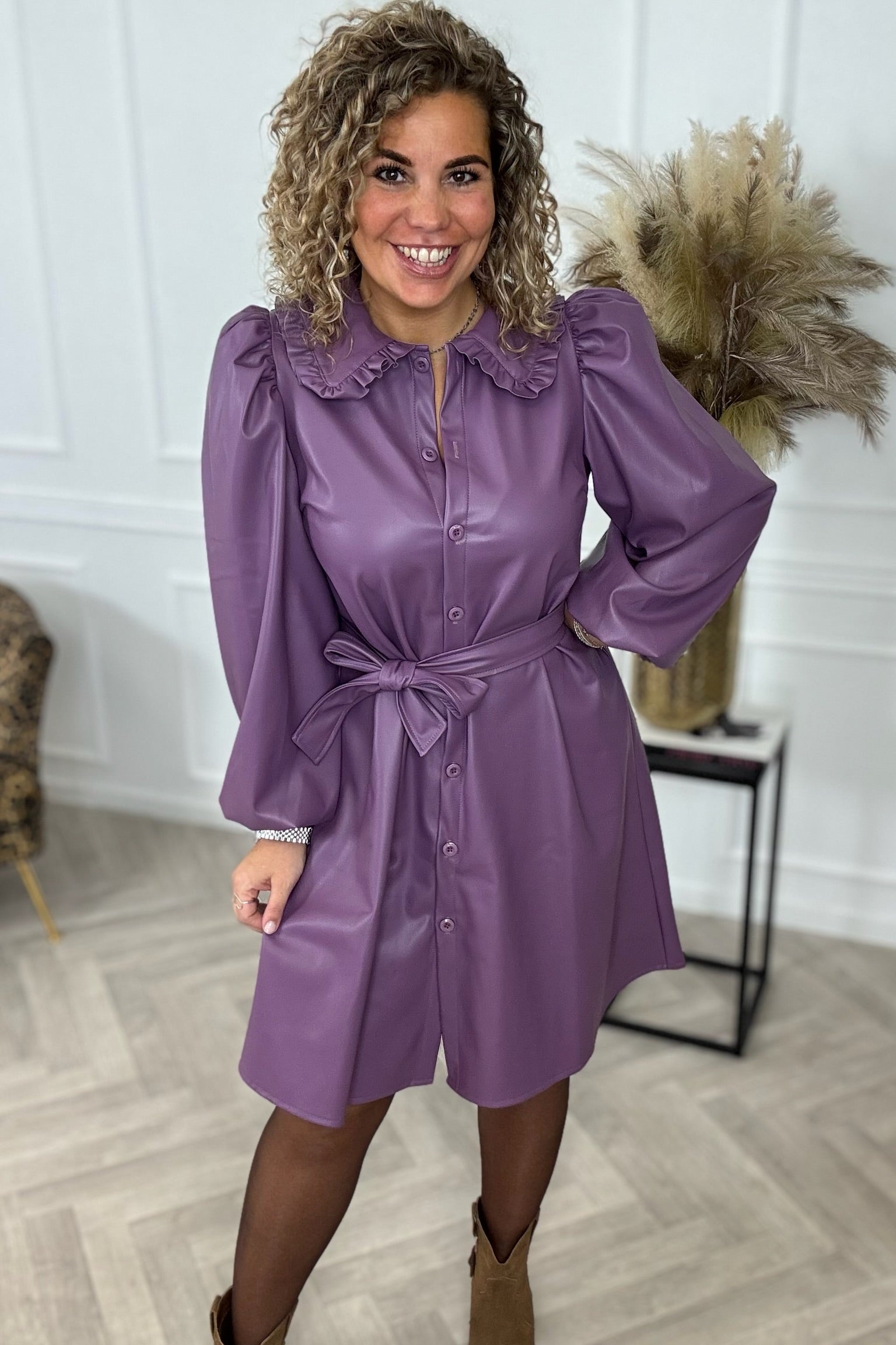 Dit prachtige fake leather jurkje is helemaal het einde! Hij heeft een mooi koordje, een prachtig afgewerkte kraag en ballonmouwtjes. Van ons eigen label, dus uniek! Shop hem nu in mauve!