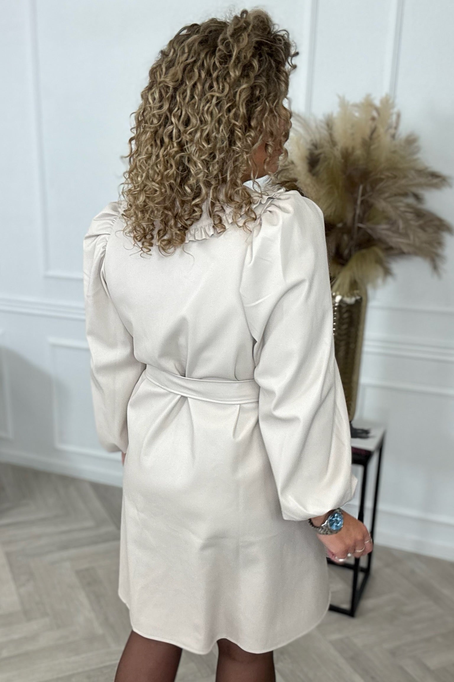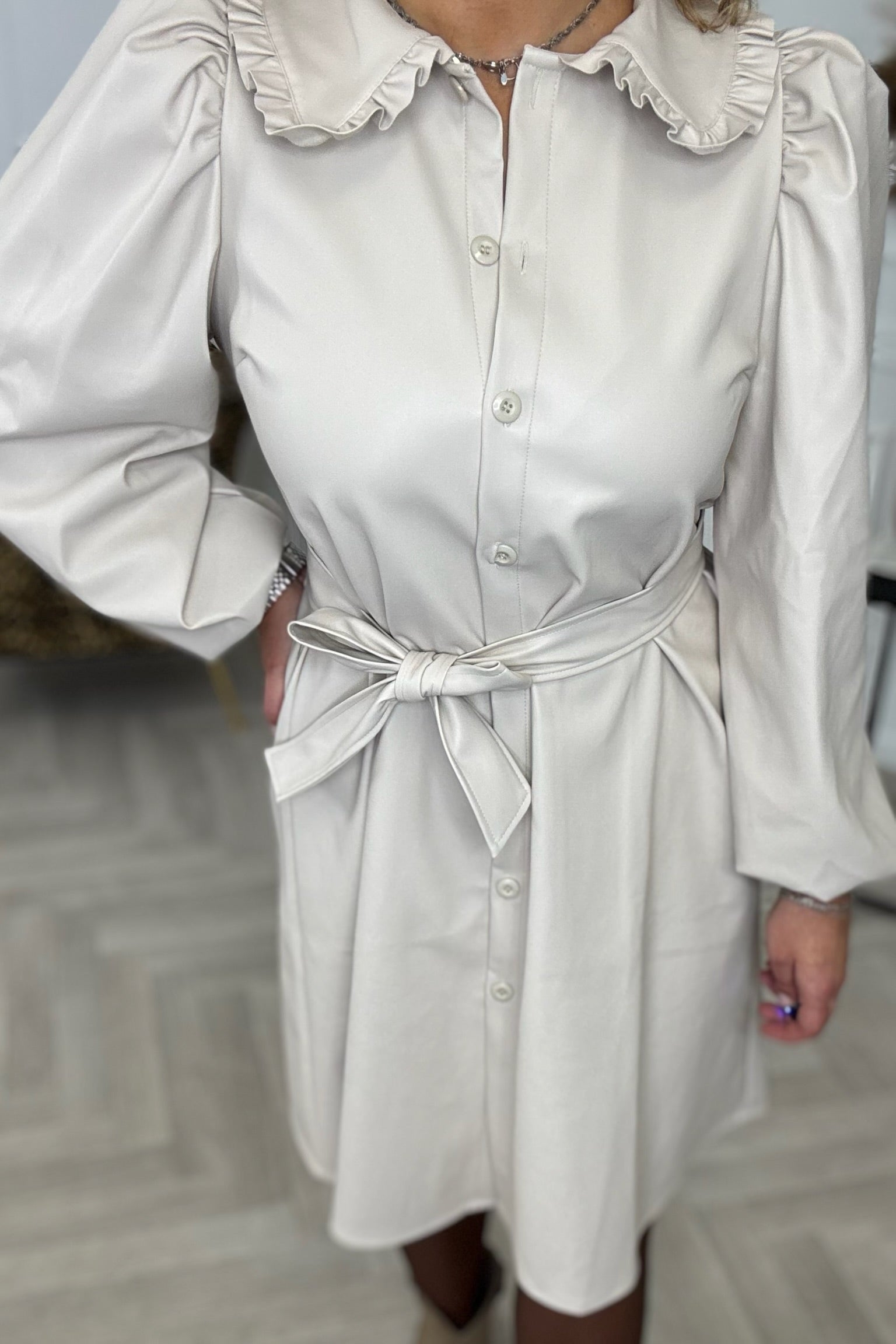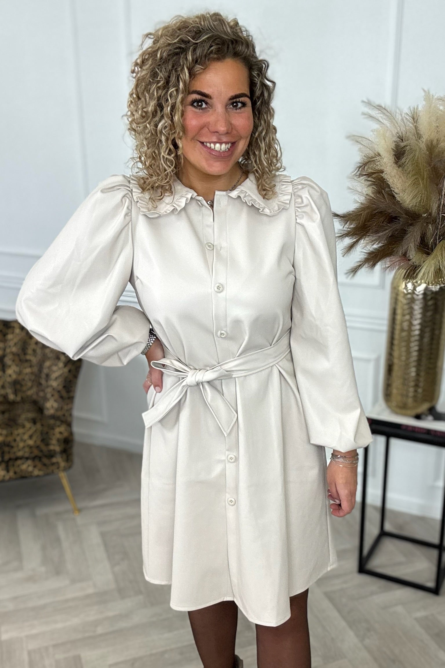Dit prachtige fake leather jurkje is helemaal het einde! Hij heeft een mooi koordje, een prachtig afgewerkte kraag en ballonmouwtjes. Van ons eigen label, dus uniek! Shop hem nu in beige!