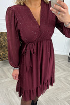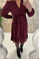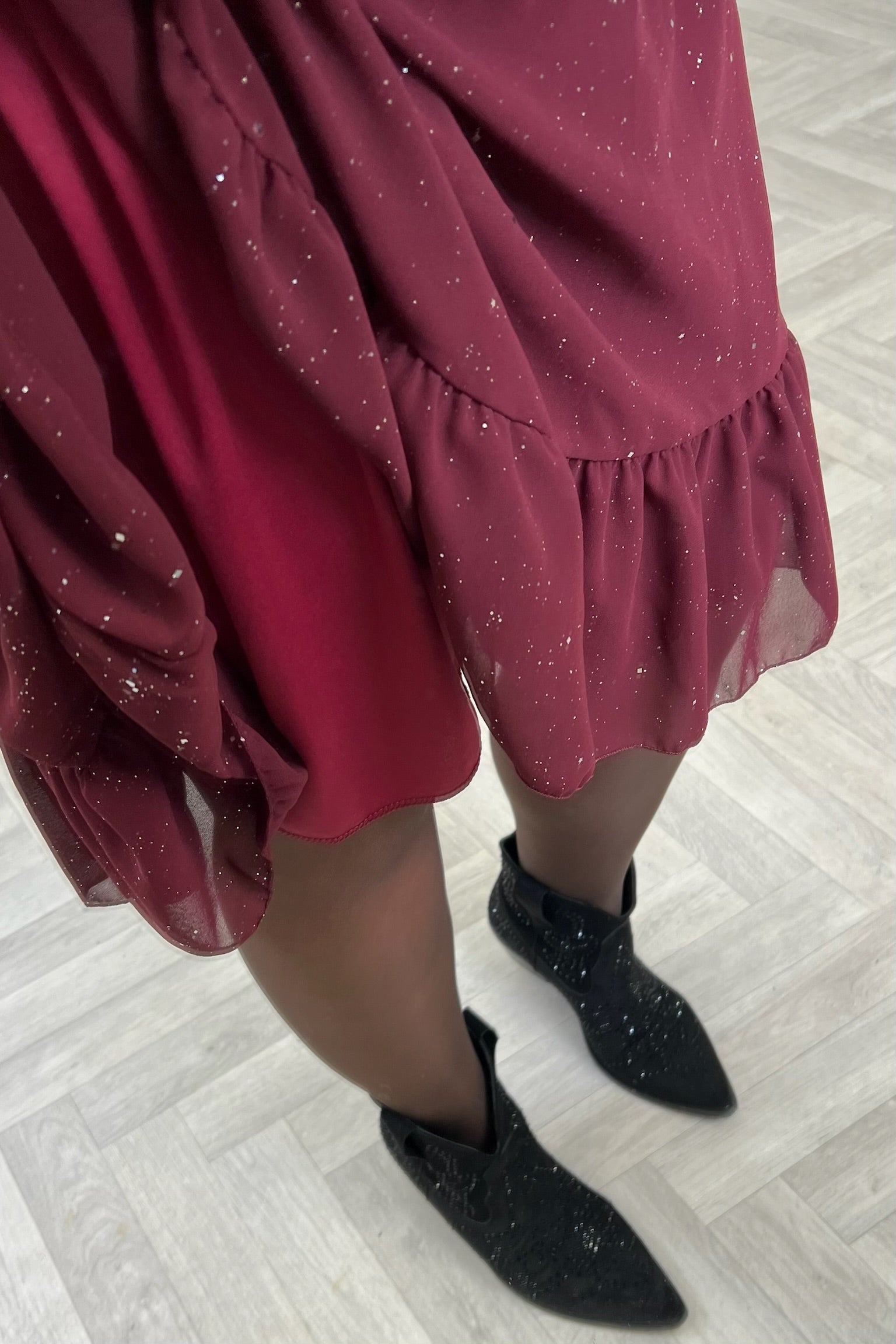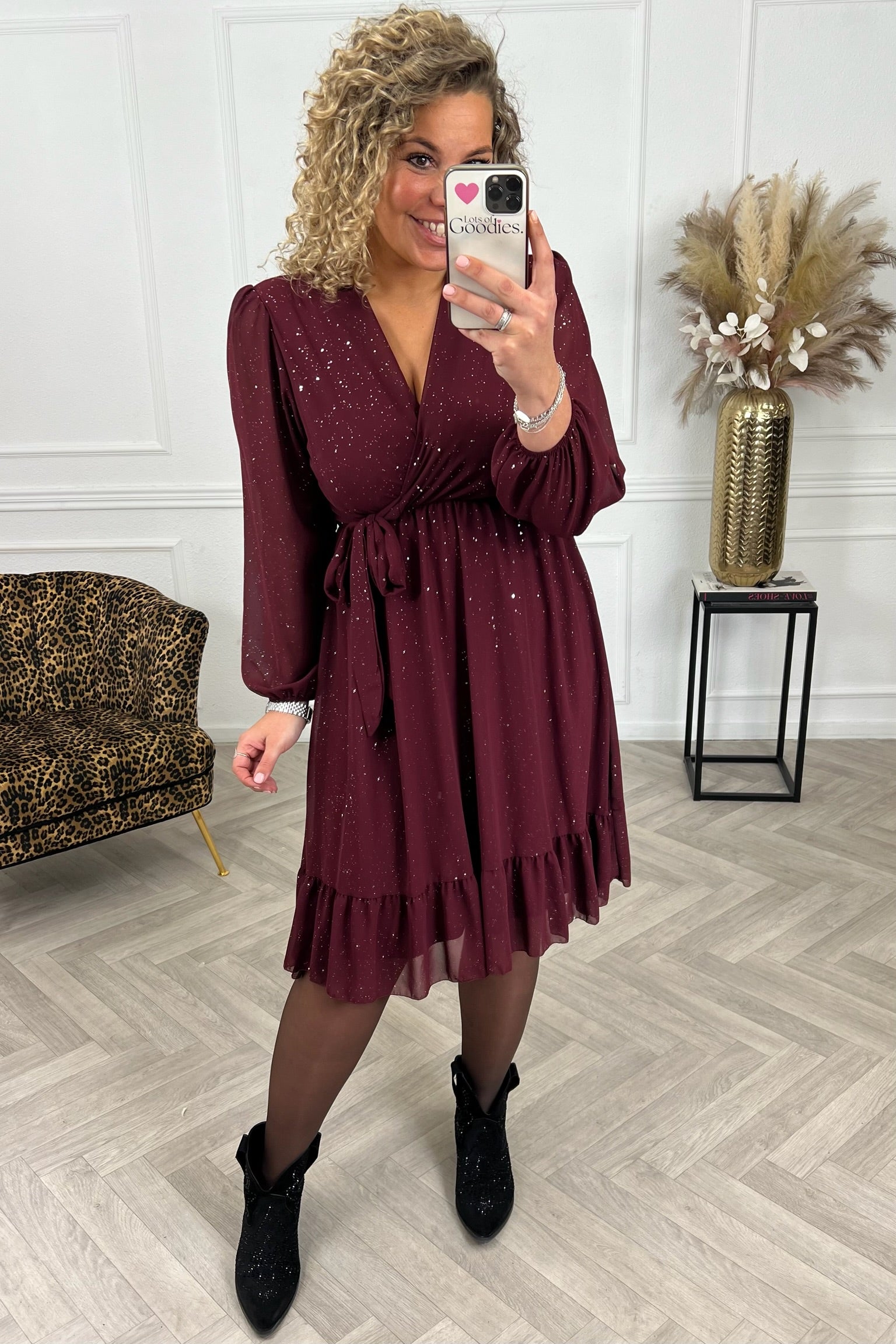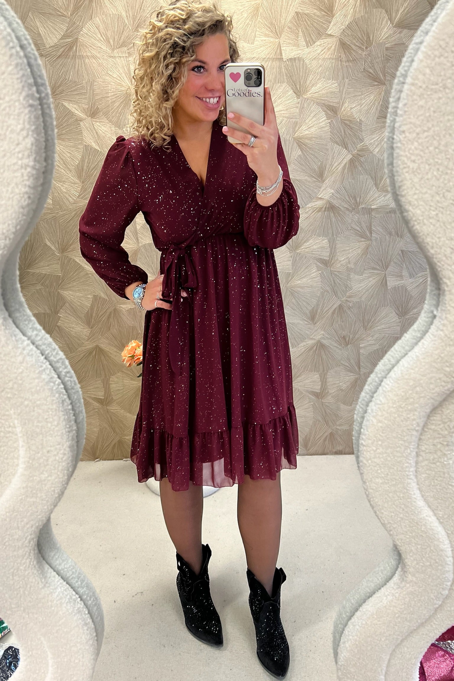 Een prachtig ruffle jurk met een subtiele glitter erin! Shop de sparkle ruffle dress nu in bordeaux!