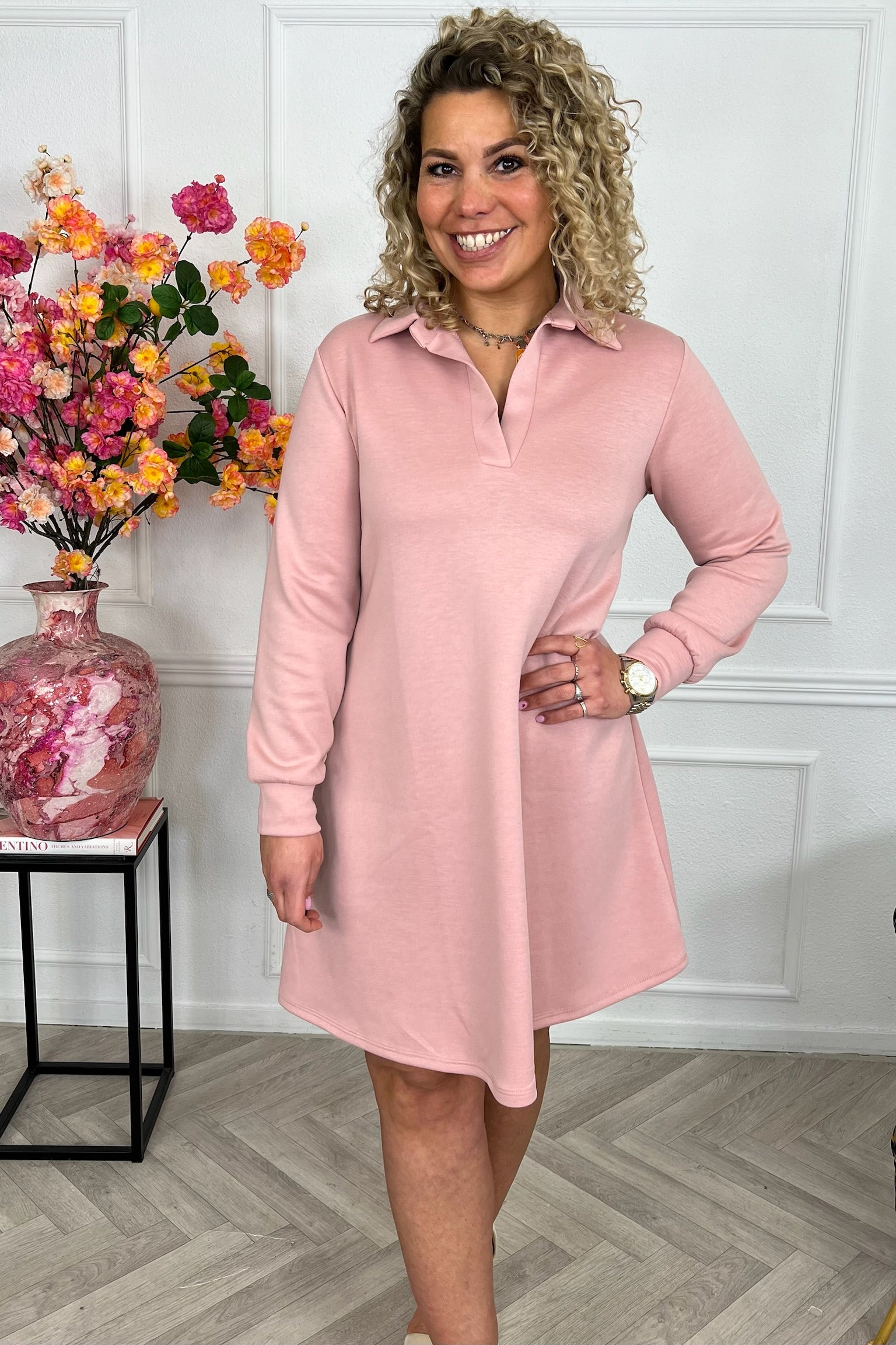 Deze heerlijke sweater dress met langen mouwen zit heerlijk en is gemaakt van scuba materiaal! Shop hem in Old Pink!