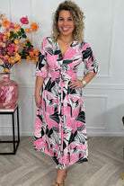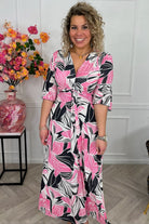 We love our curvy knotted dresses! Deze heerlijke jurk laat je stralen, shop hem in deze mooie palm leavesprint, in black/pink!