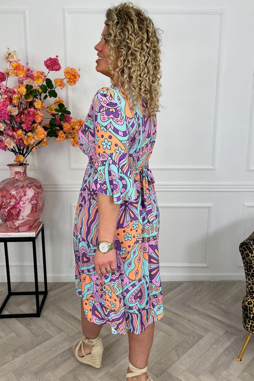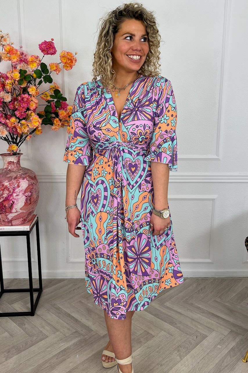 Onze signature dress is terug! Shop onze short knotted dress online in nieuwe prints! Shop hem in onze heartsprint in purple/turquoise!