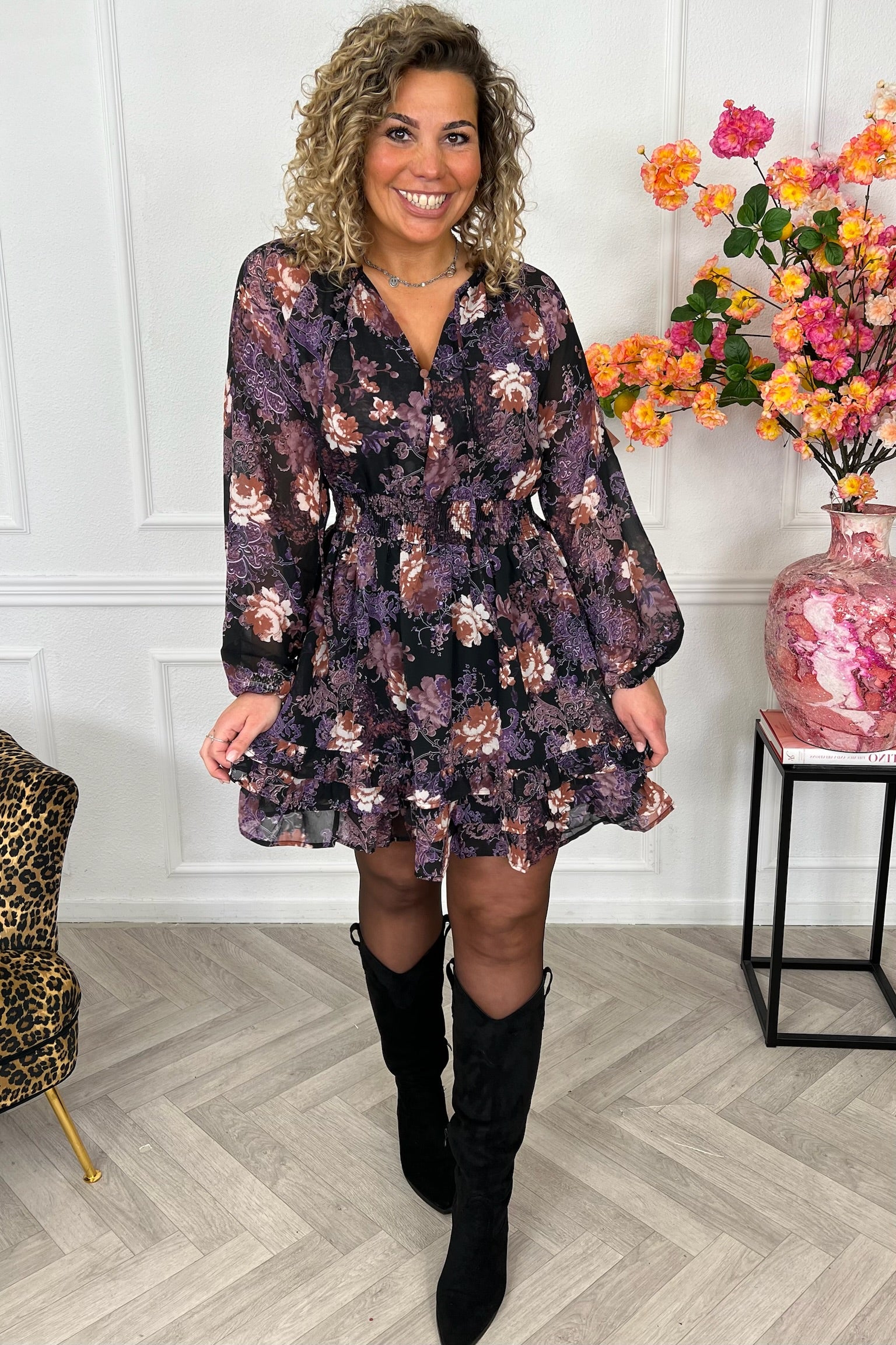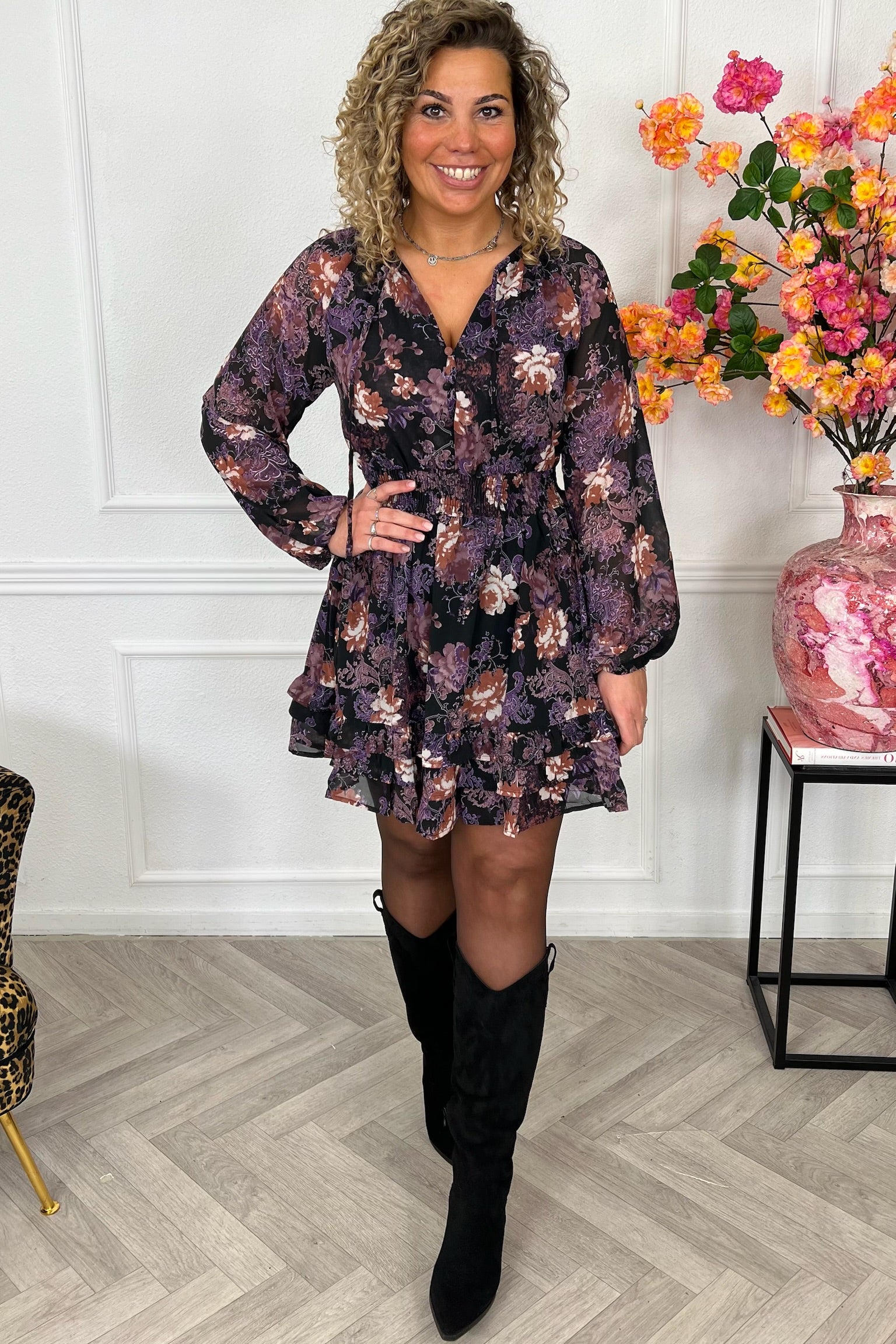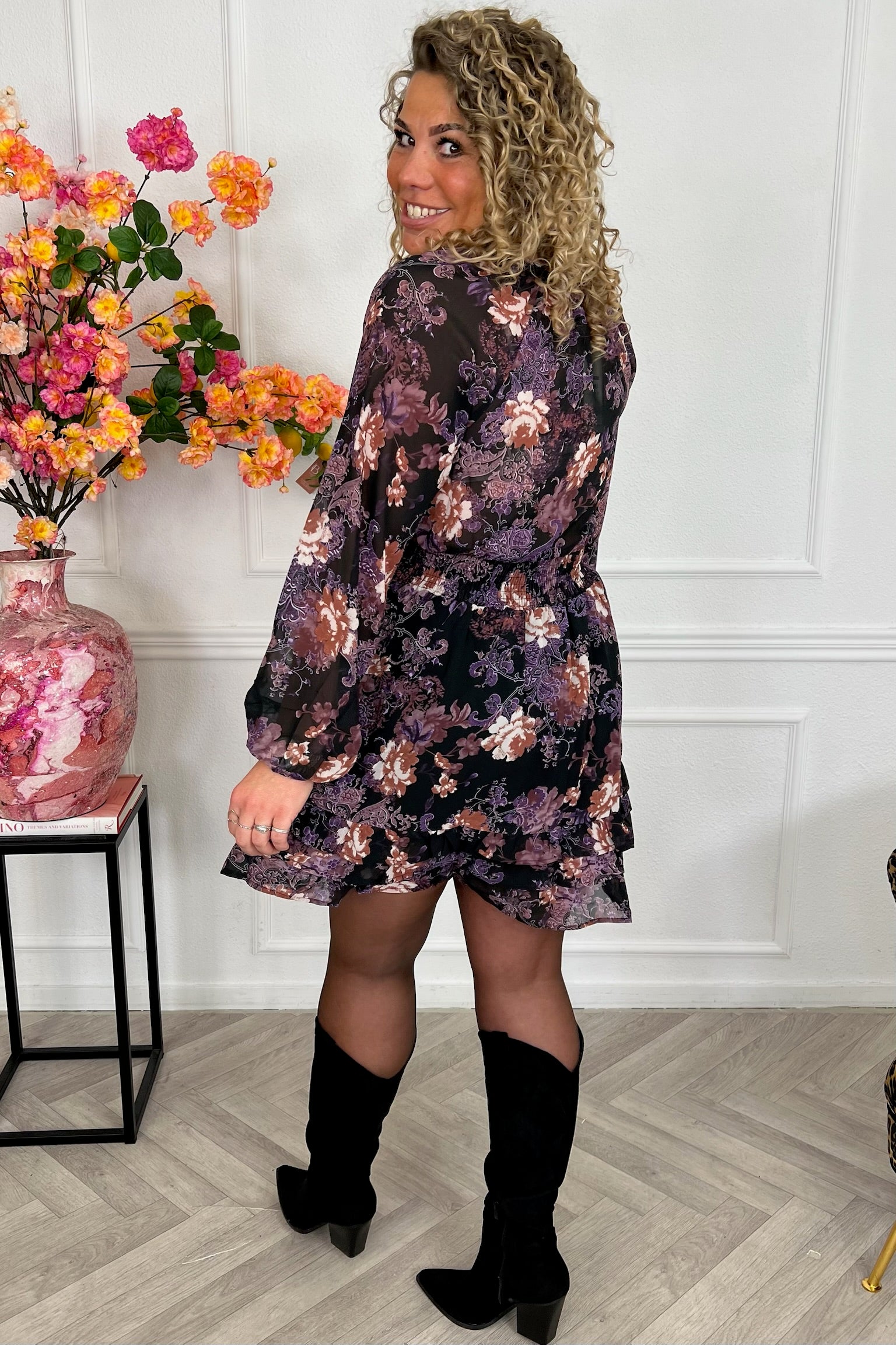 Deze superleuke jurk met prachtig bloemen print is nu beschikbaar, we love it! Shop de Dana dress in Purple!