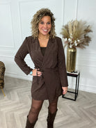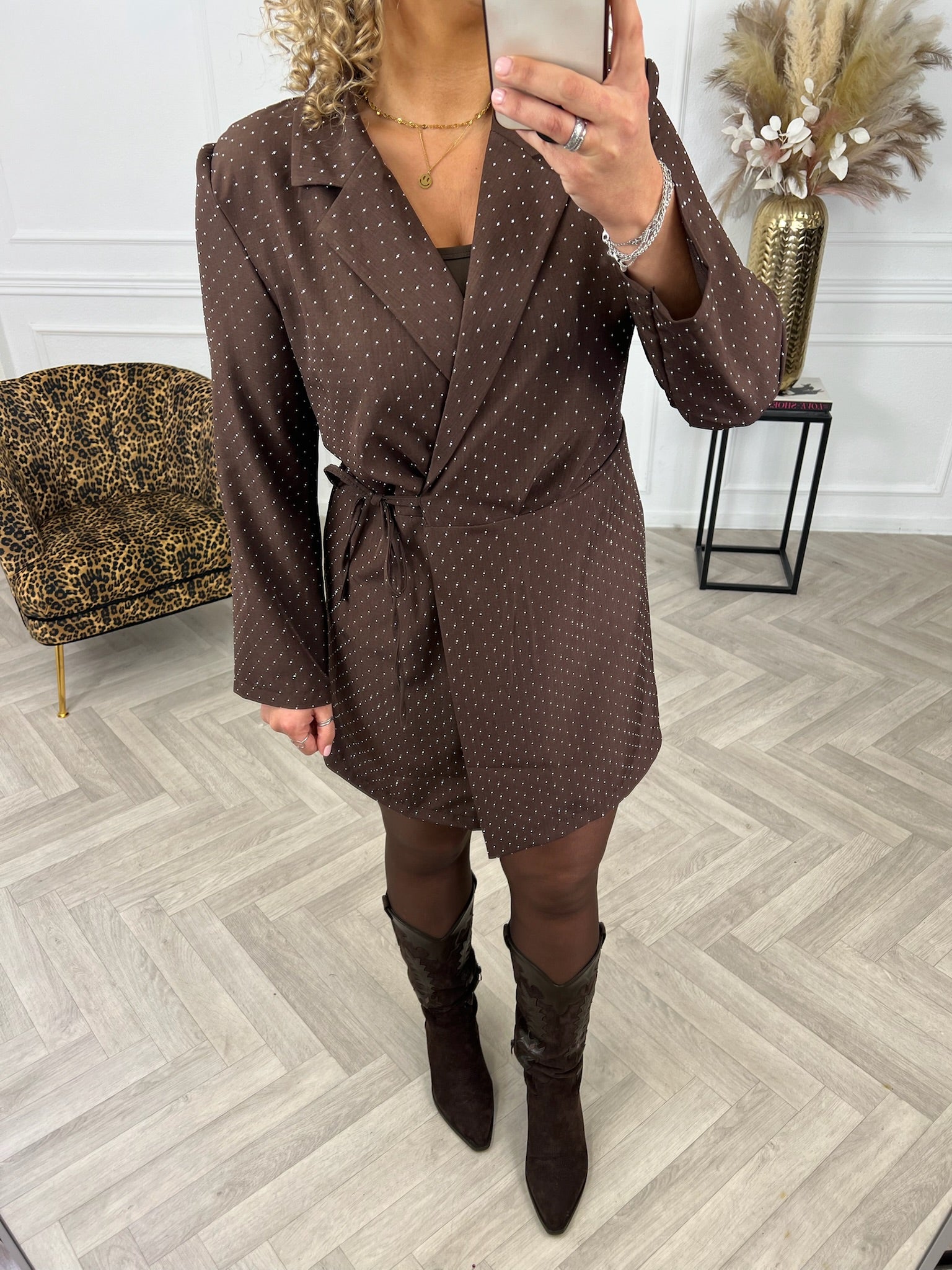 We hebben onze bestseller nu ook in een glitter jurk! Het is een mooie wrap dress en dus vast te maken met een strikje aan de zijkant. We hebben de jurk in regular en curvy, dus shop de elegance glitter wrap dress in brown!