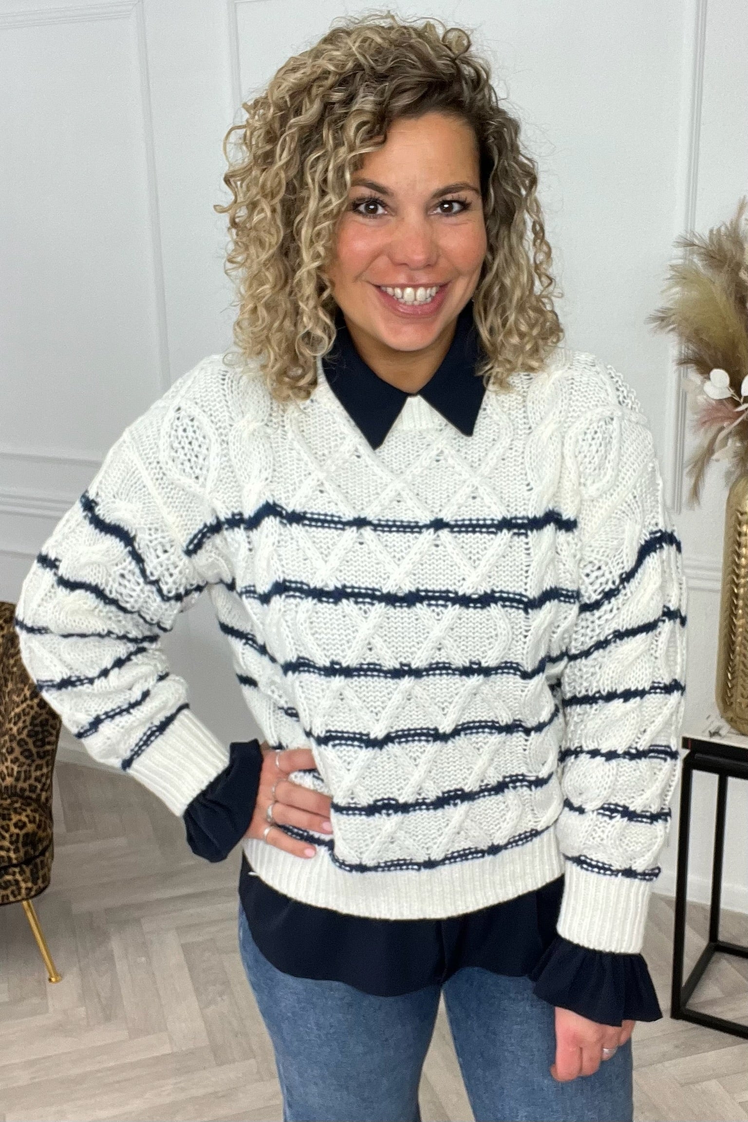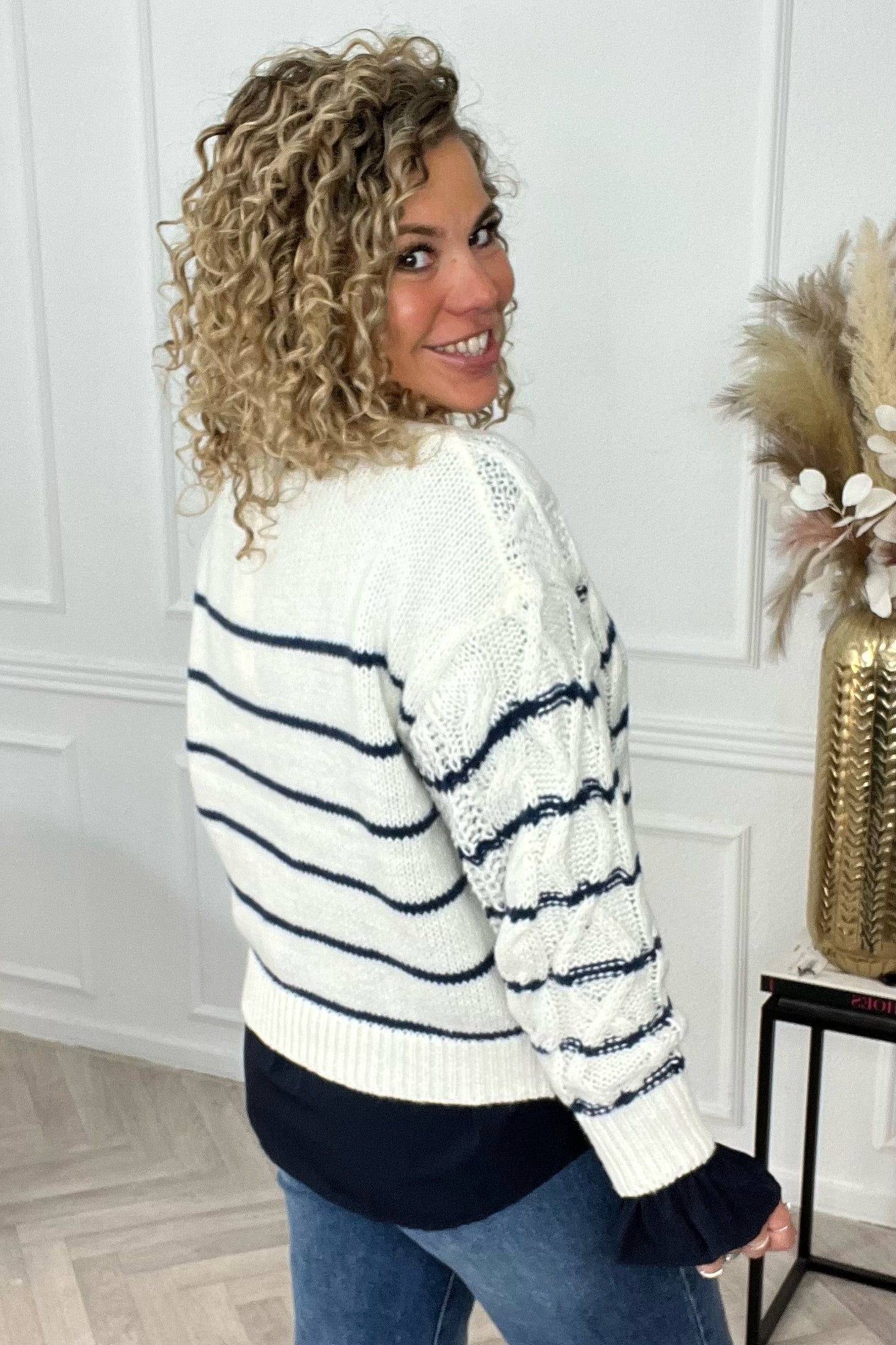 Deze prachtige gestreepte sweater zit bijzonder comfy en ook nog eens super stylish. Combineer hem met een leuke jeans! Shop hem in Beige/Blue!