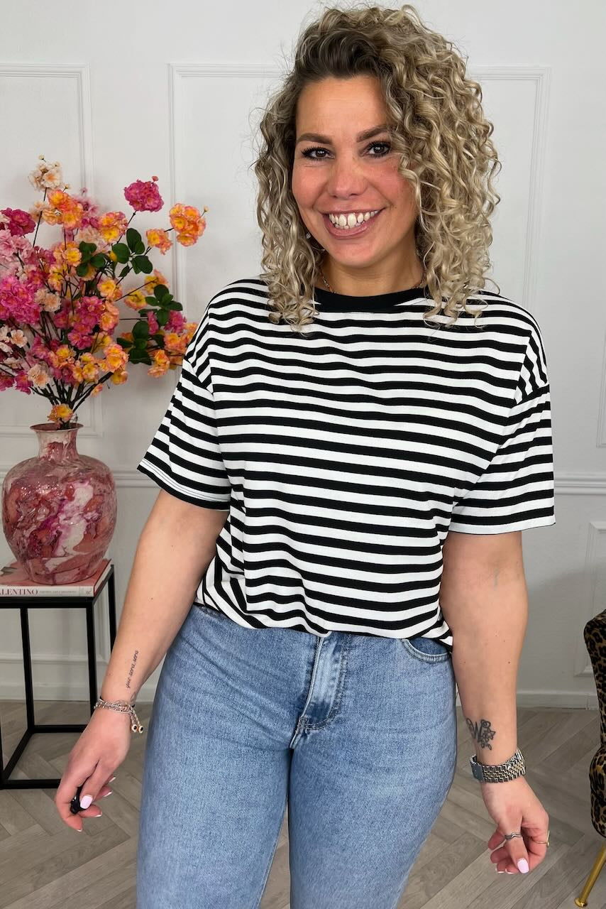 Dit heerlijke t-shirt met trendy streepjes is helemaal spring & summer-proof! Shop hem nu voor een superprijs in black/white!