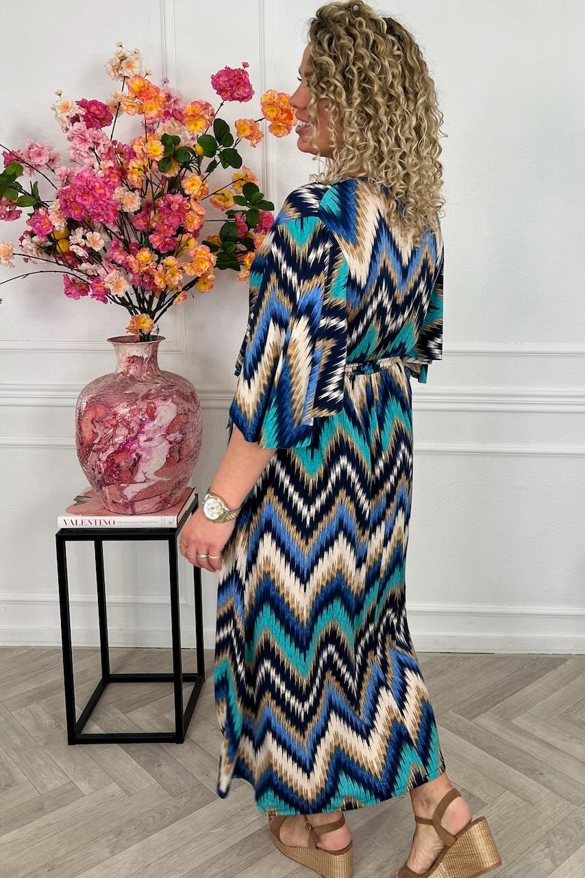 Deze heerlijke maxi dress heeft een fijn koord om de middel. Hij is verkrijgbaar in allerlei een mooie printjes en kleuren! Shop hem in turquoise/blue/beige!