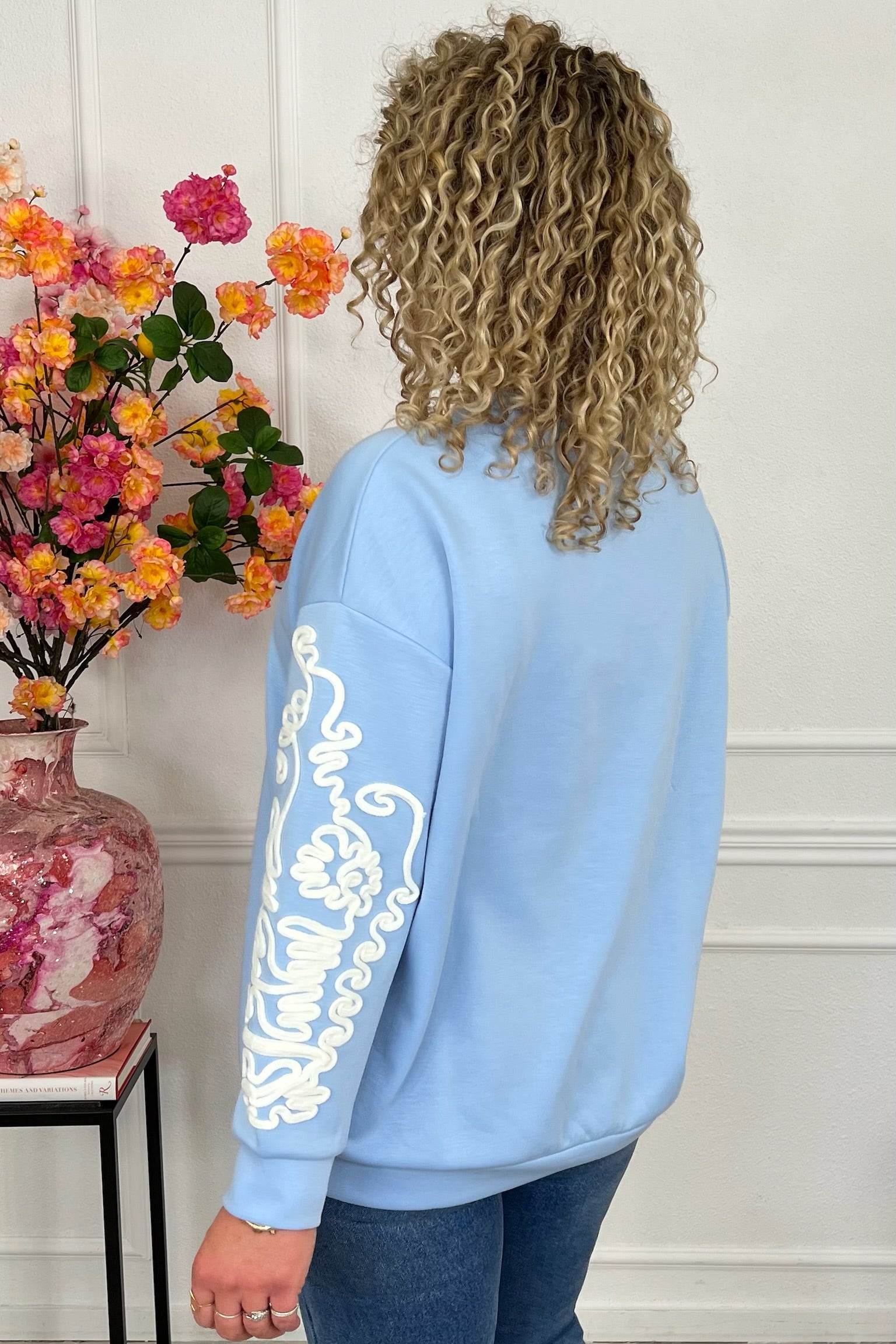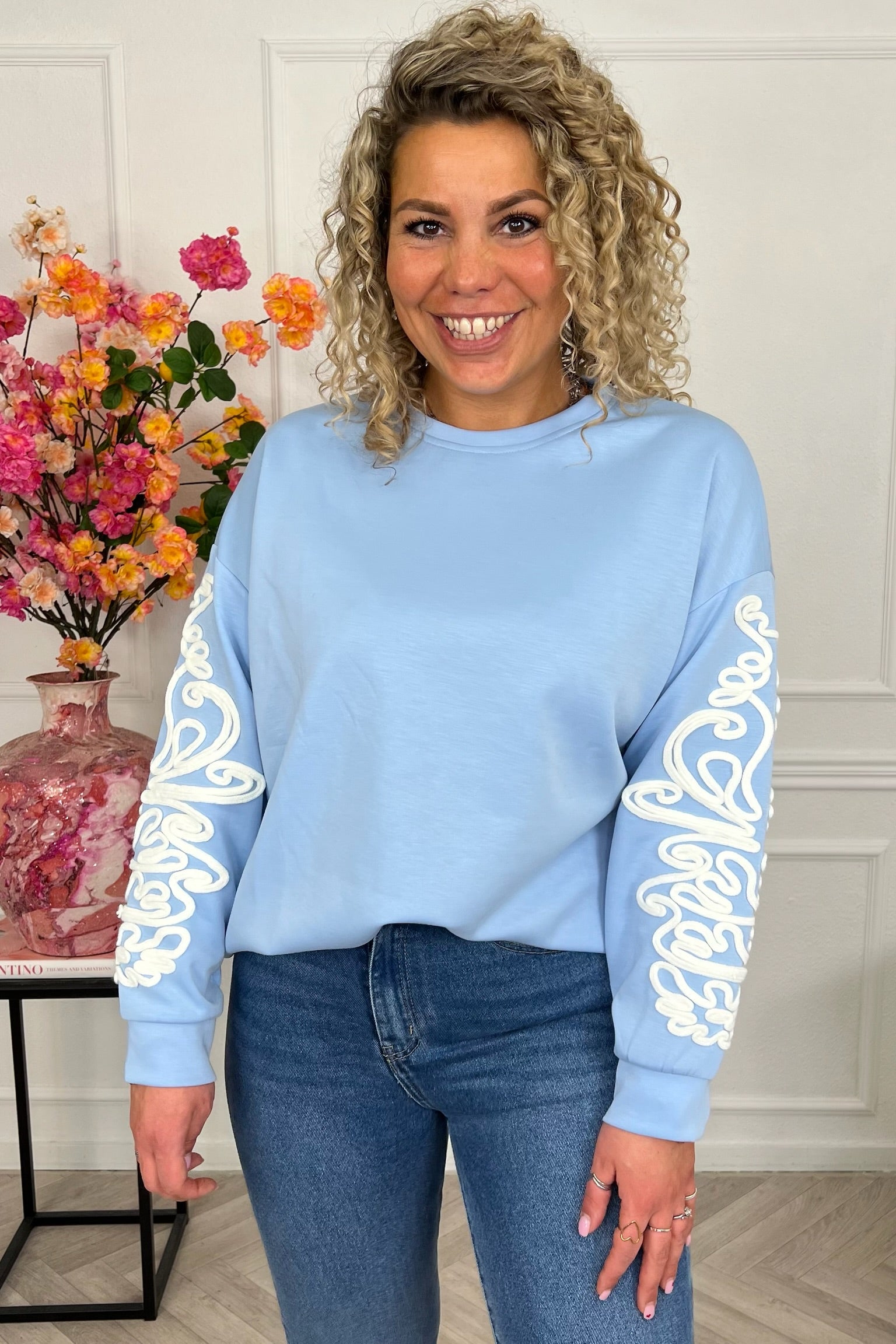 Deze fijne sweater heeft een prachtig detail op de mouwen, shop hem in light blue!