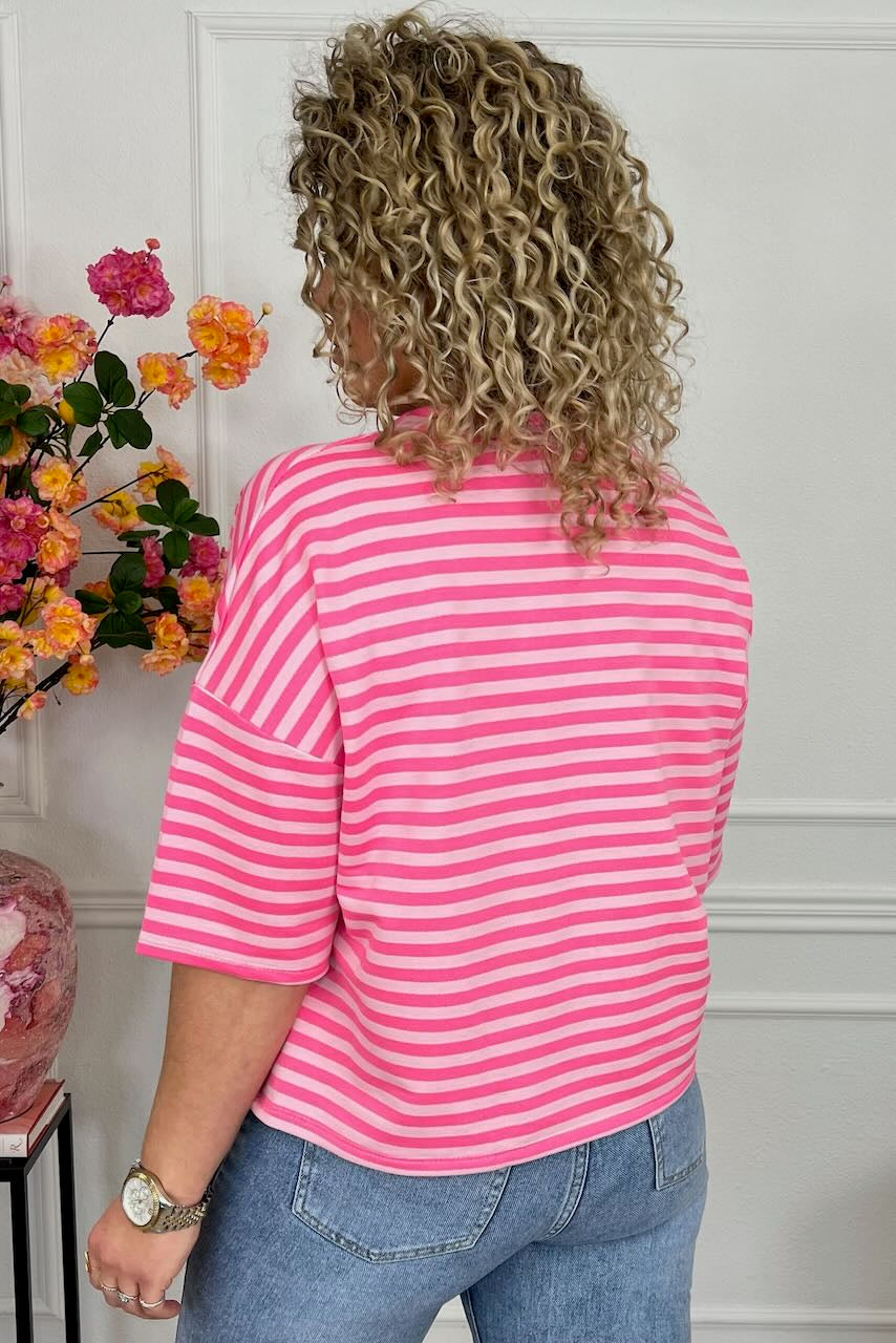 Deze prachtige gestreepte sweater met korte mouwen zit heerlijk en is helemaal on trend! Combineer hem met een leuke jeans! Shop hem in light pink/pink!