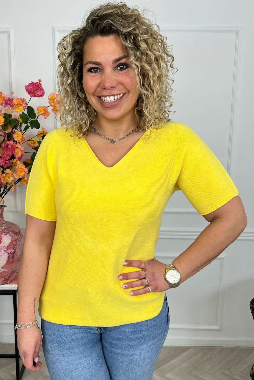 De perfecte sweater met korte mouwen, verkrijgbaar in leuke kleurtjes en ook nog eens met een V hals! Shop hem nu in yellow!