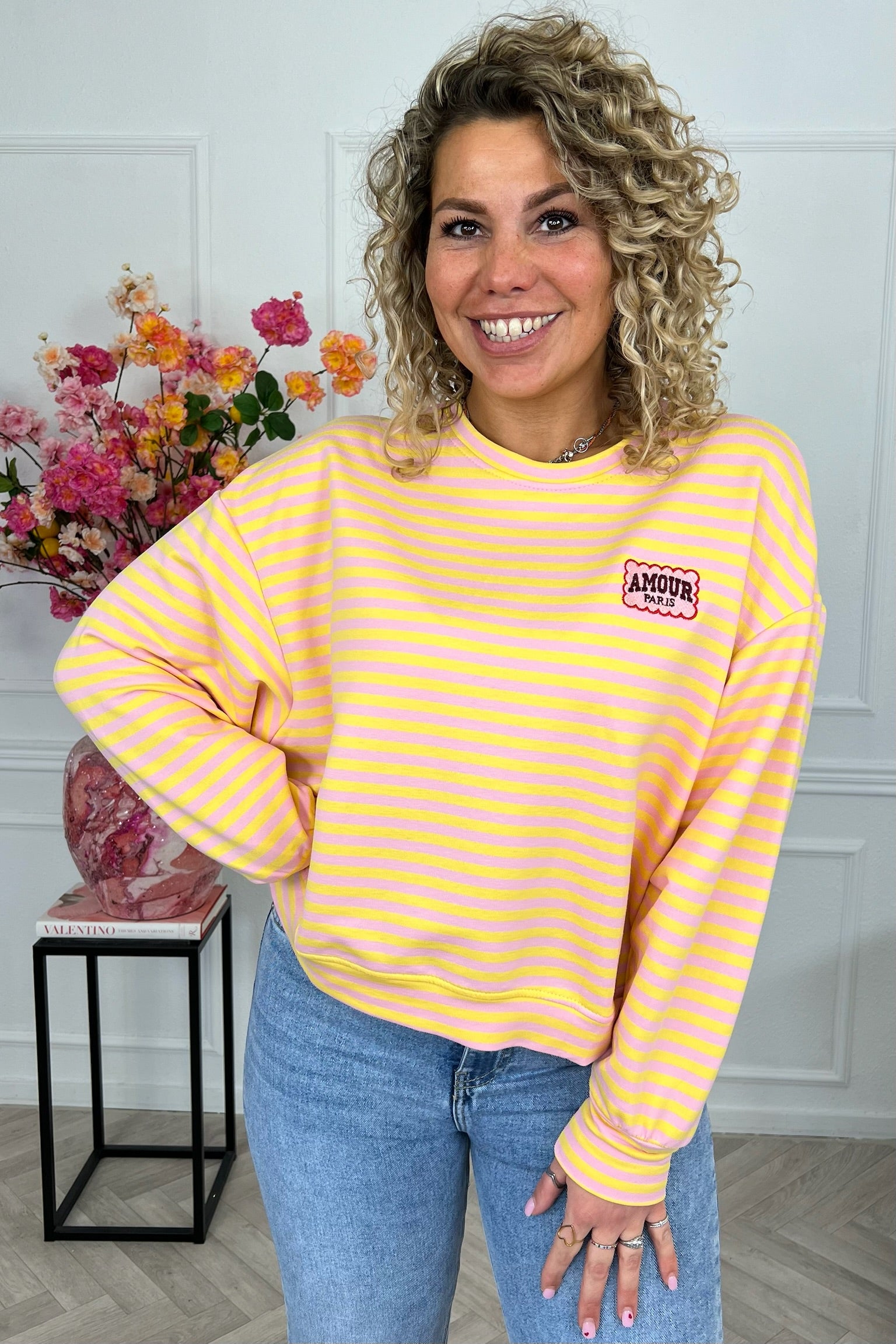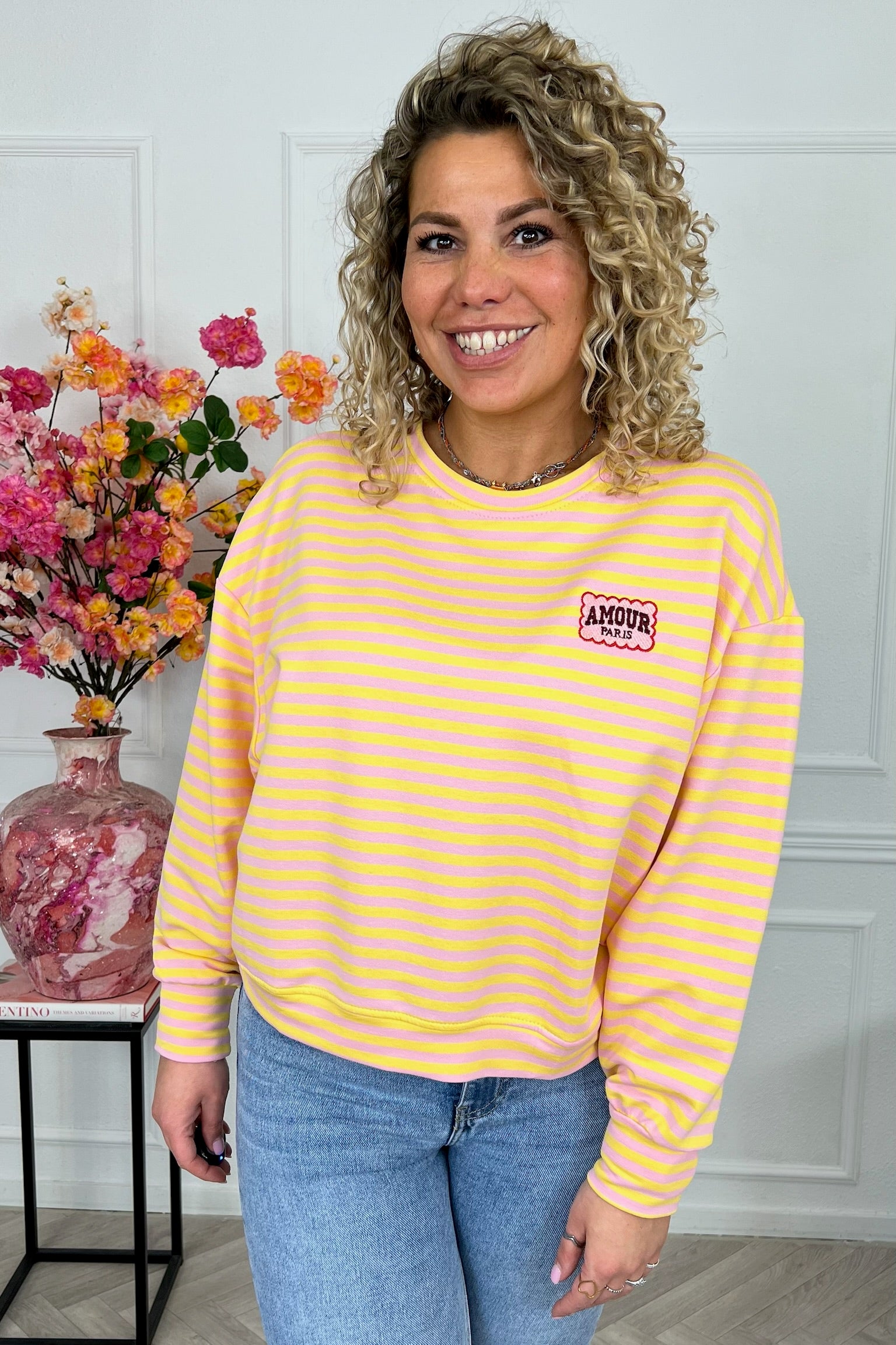 Dit heerlijke gestreepte shirt met mooi AMOUR-embleem erop, shop je in de vrolijkste kleurtjes, zoals yellow/lila!