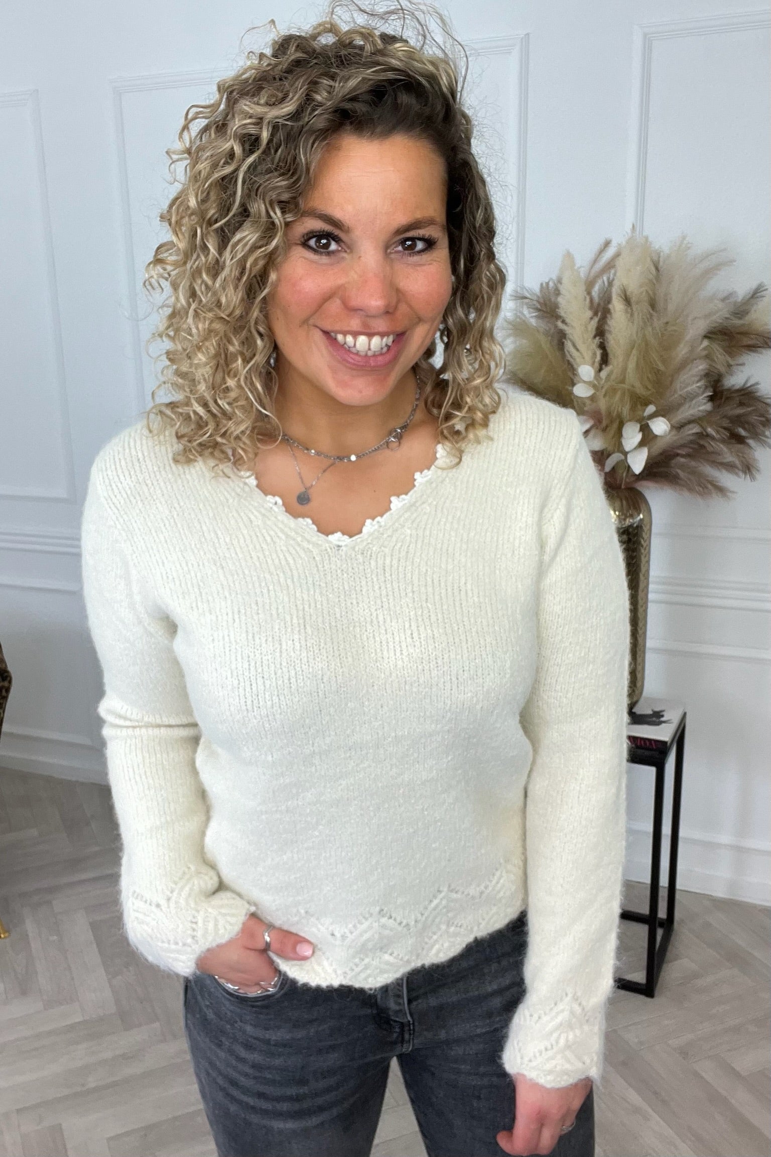 Deze fijne sweater heeft mooie details aan de mouwen en witte details in de hals. Shop deze Alyse Sweater nu in het Beige!