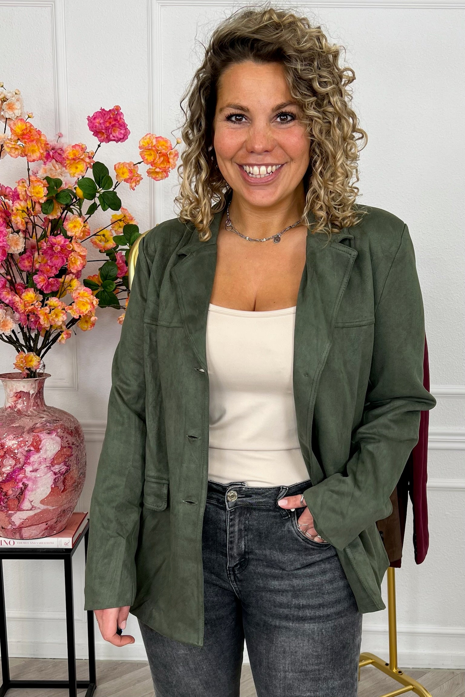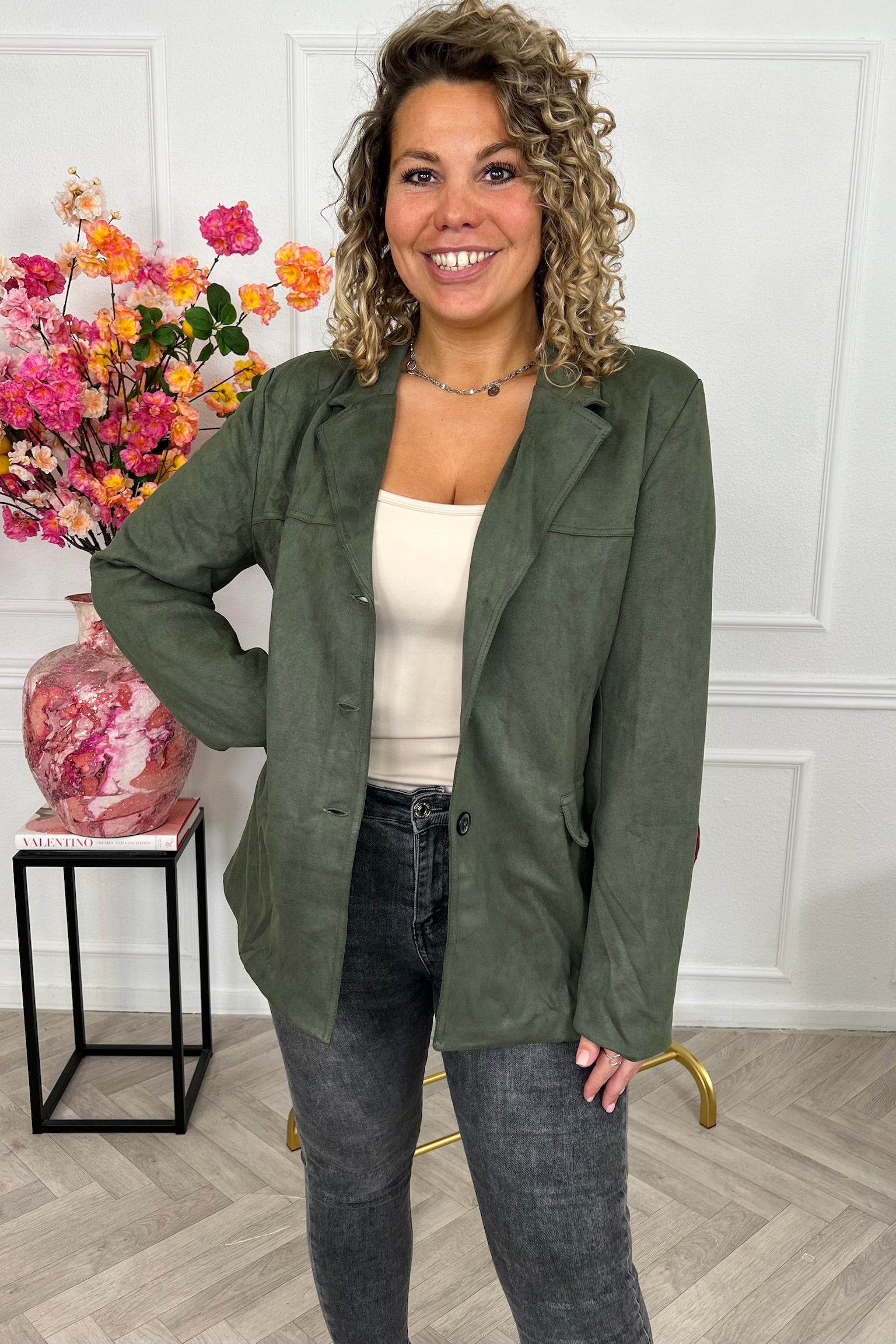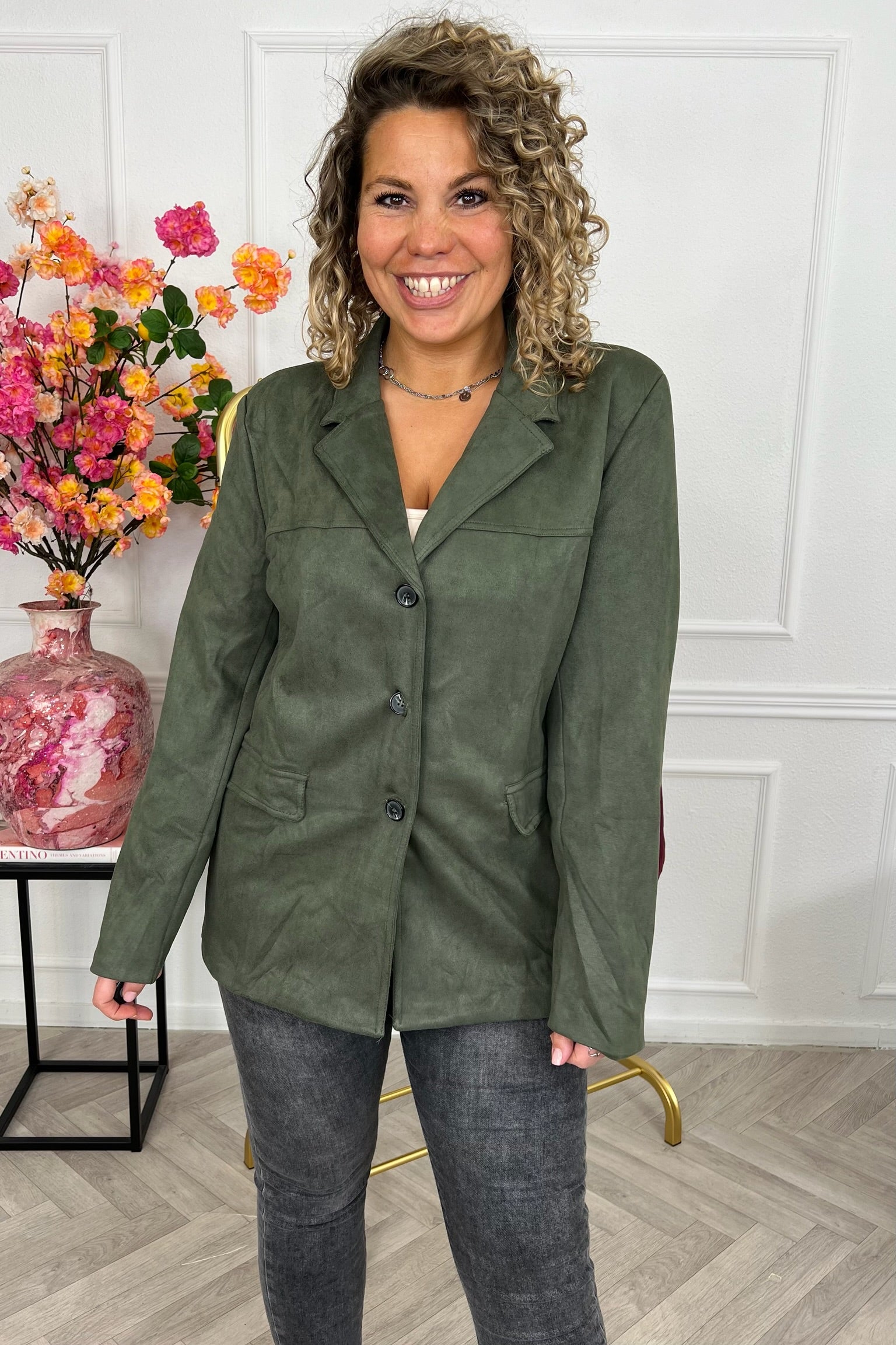 Deze blazer met een prachtige suedine stof staat nu online. Wees er snel bij! Shop hem nu in Armygreen!