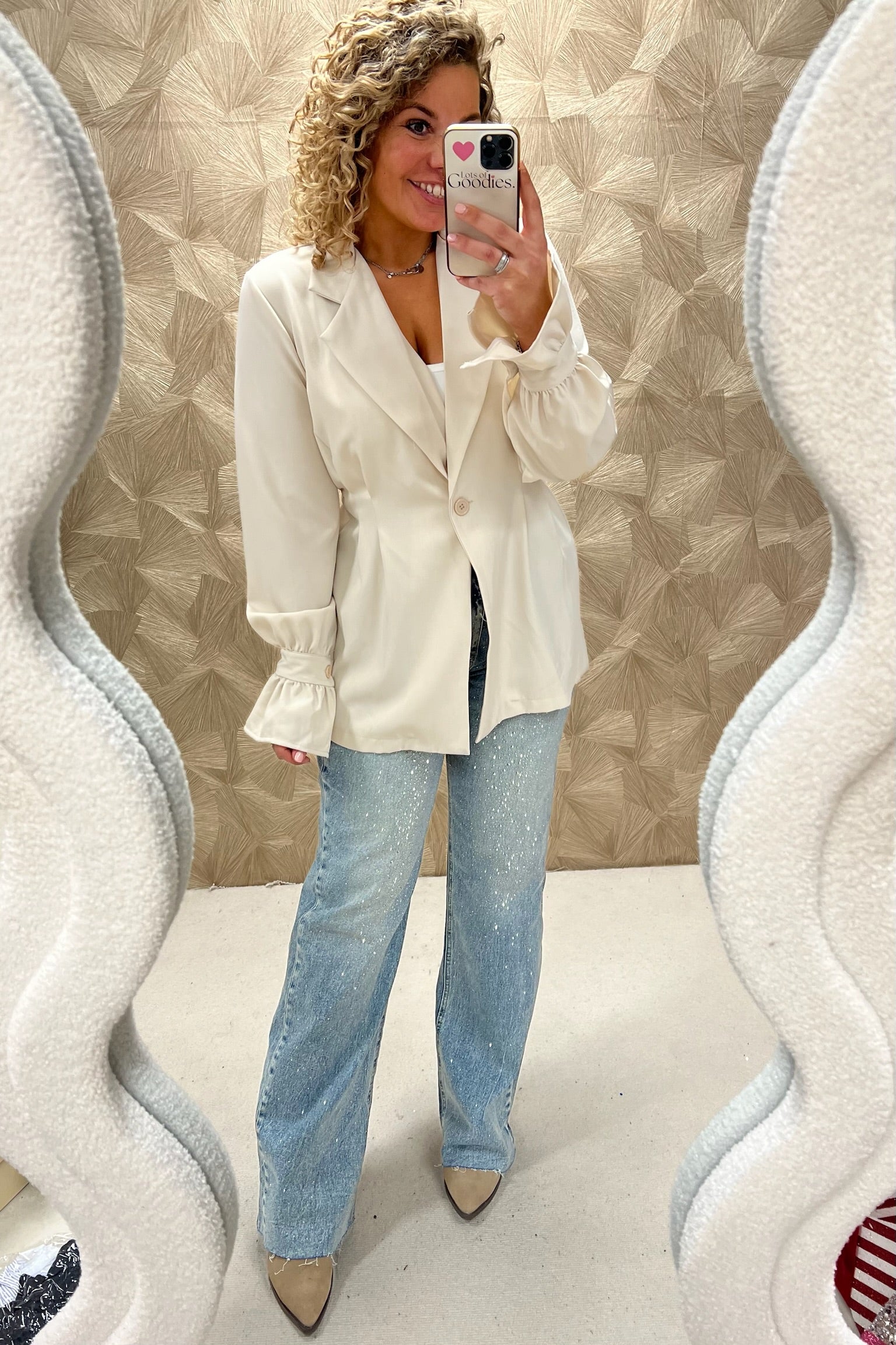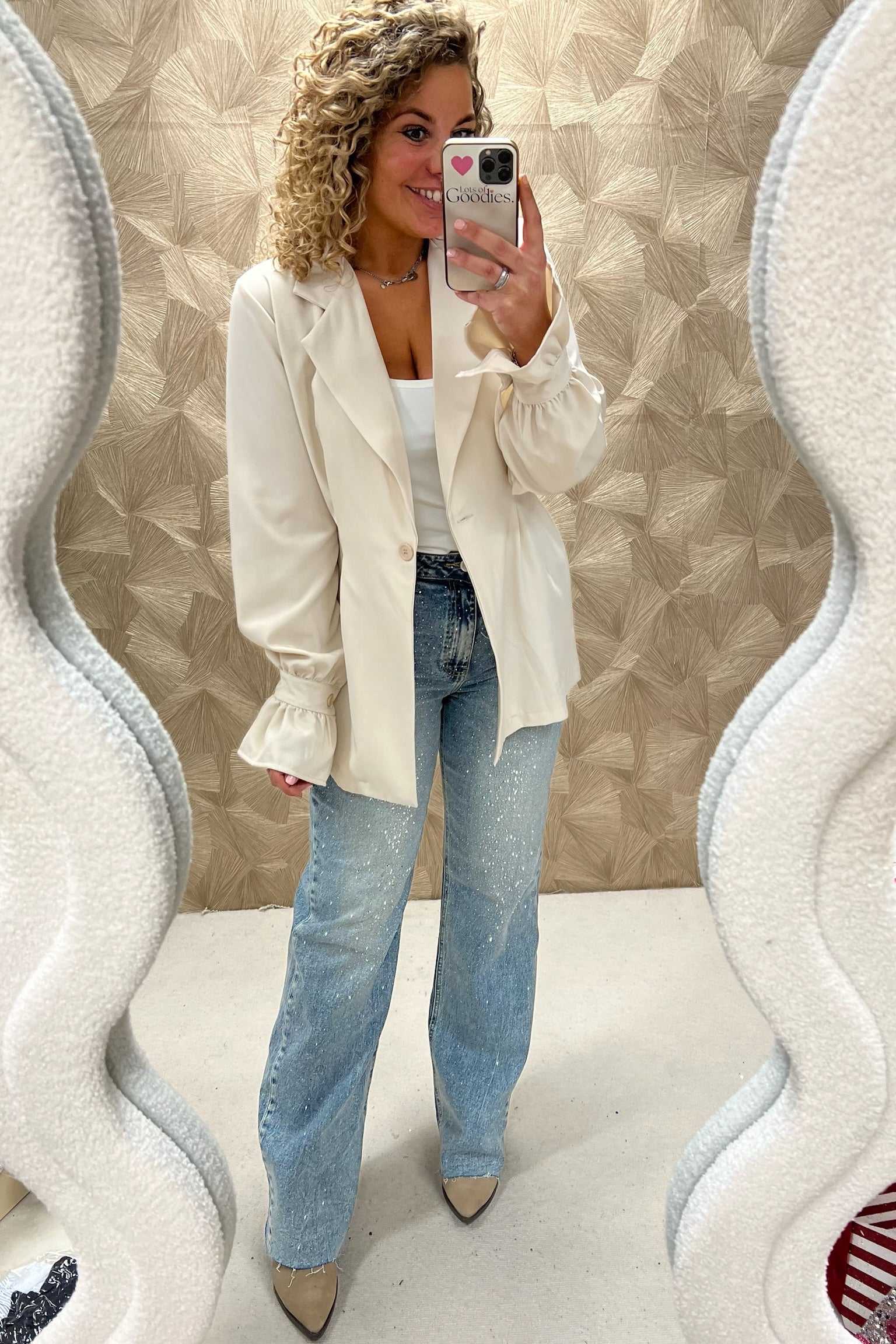 So Classy is deze blazer! Hij is getailleerd bij de taille en heeft een leuke ruffle mouw. Shop hem nu in Beige!