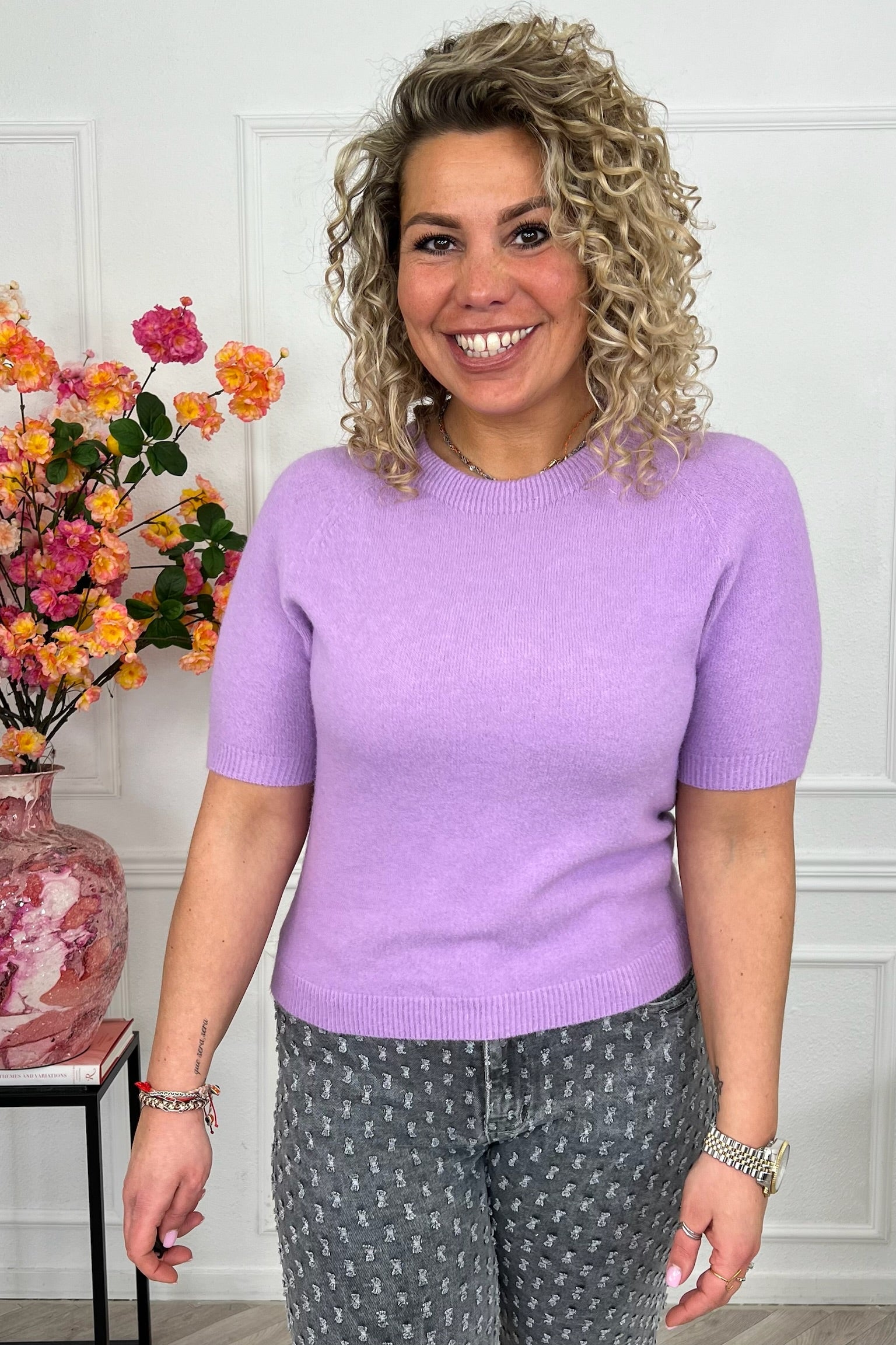 Deze prachtige spring sweater met kort mouwtje zit bijzonder comfy en ook nog eens super stylish. Combineer hem met een leuke jeans! Shop hem in Lila!