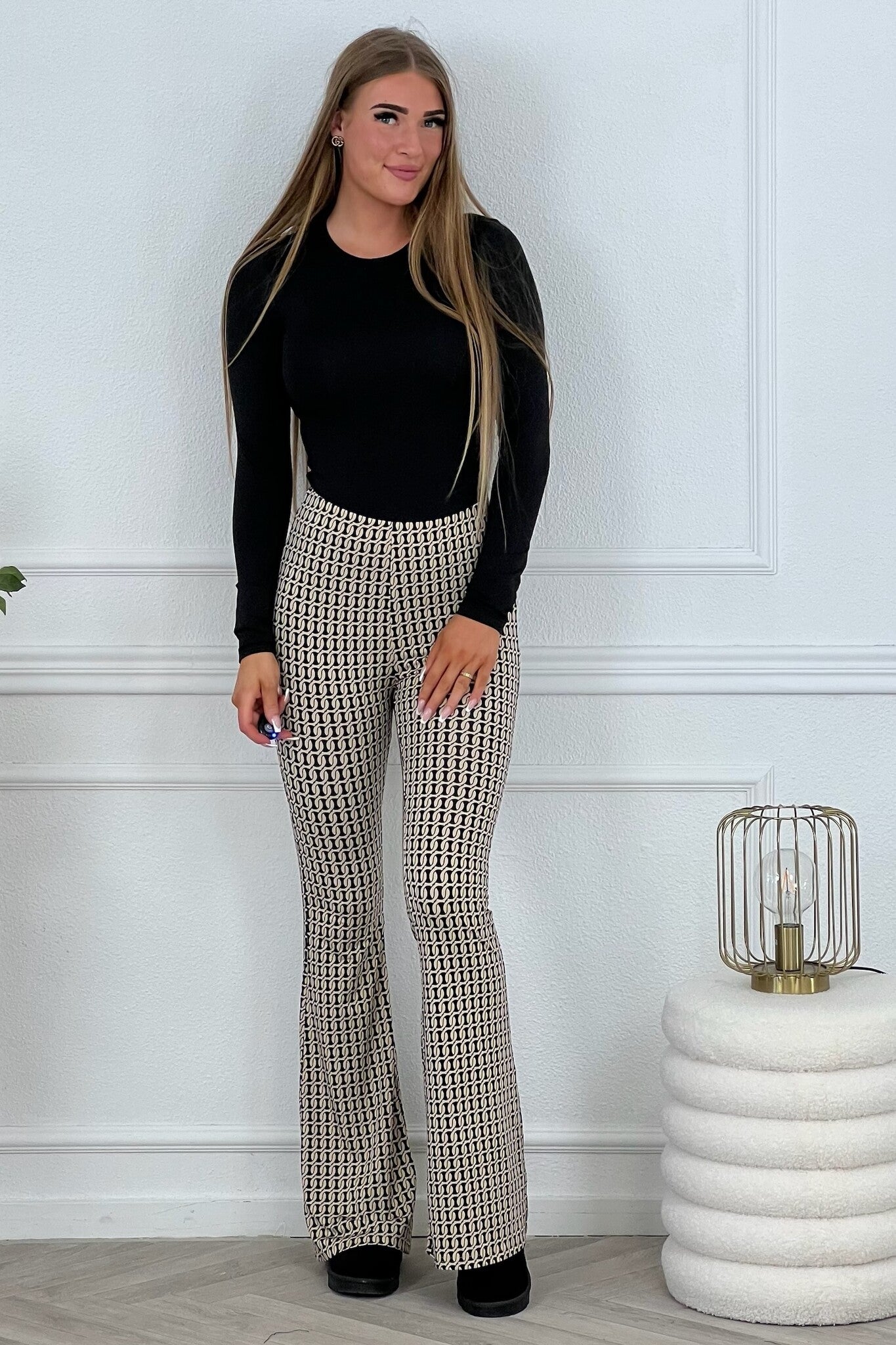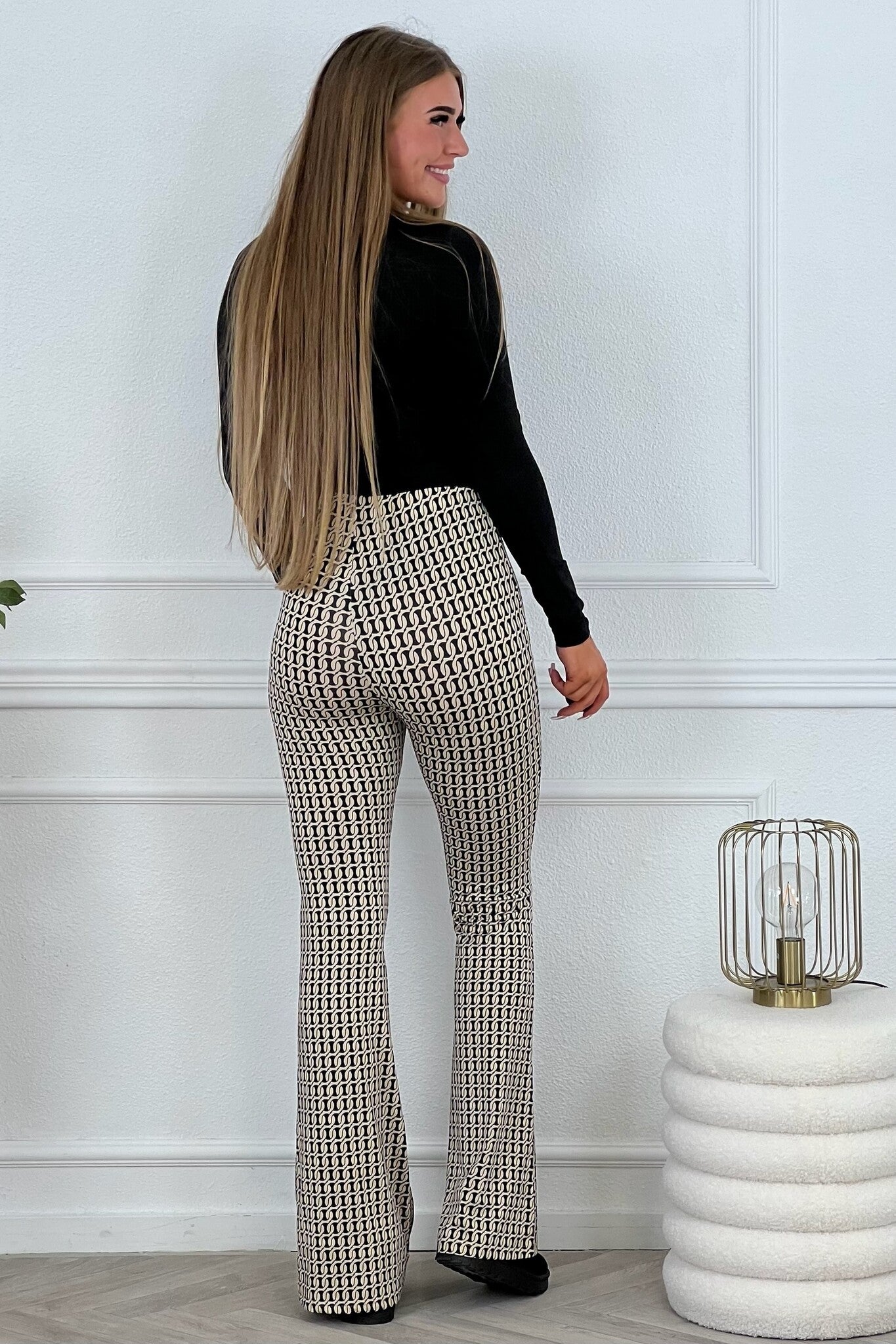 Een fijne flared broek met stretch valt lekker hoog, en een gladde stof.