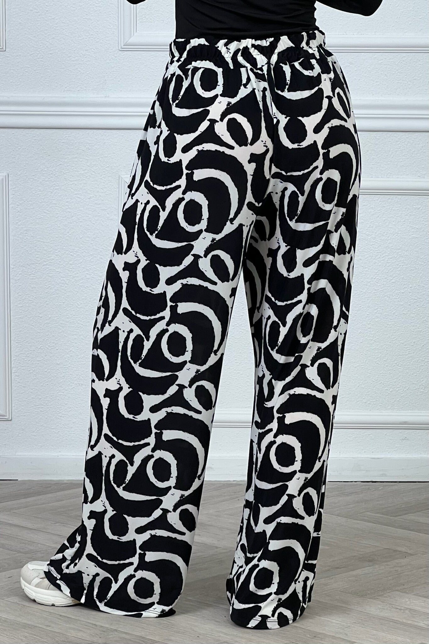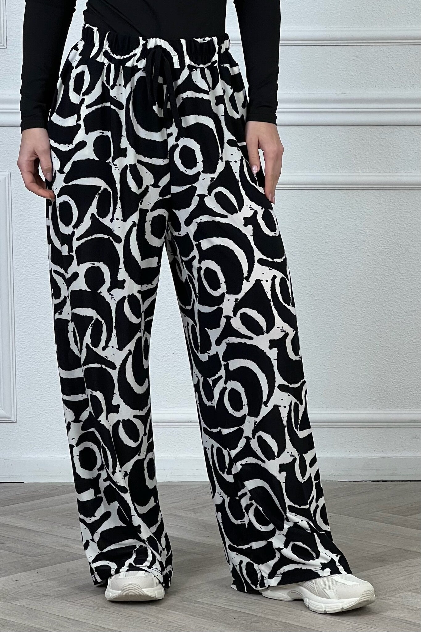 Een mooie wijdvallende broek met een elastieke band en twee touwtjes voor de sier! In een gave print met ronde patronen! Shop hem in black/white!