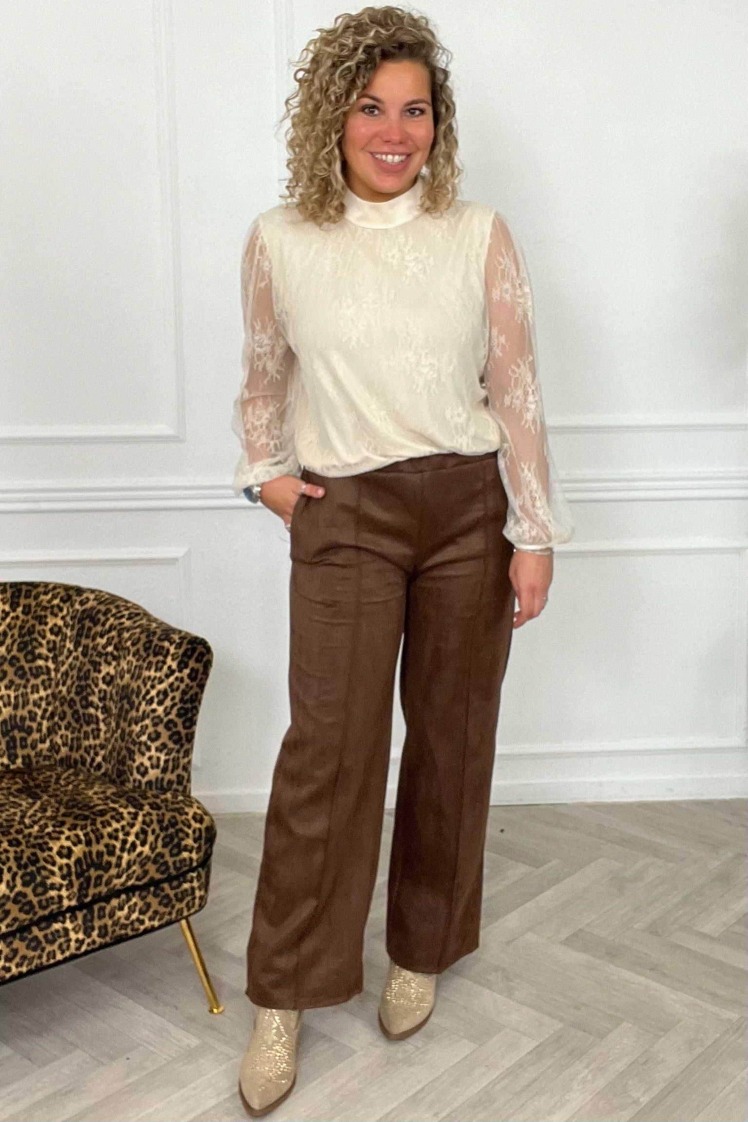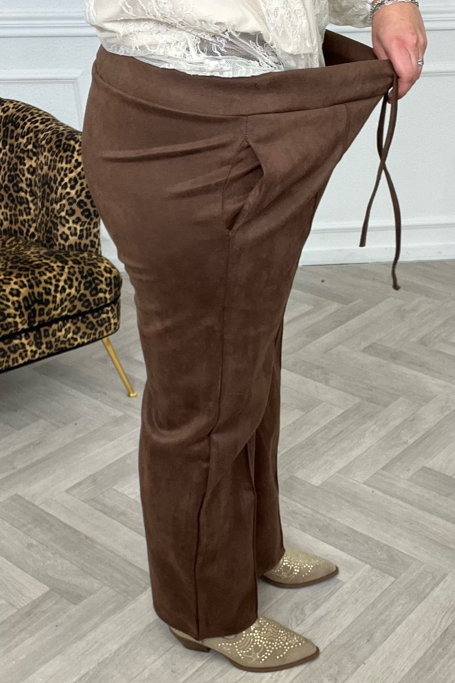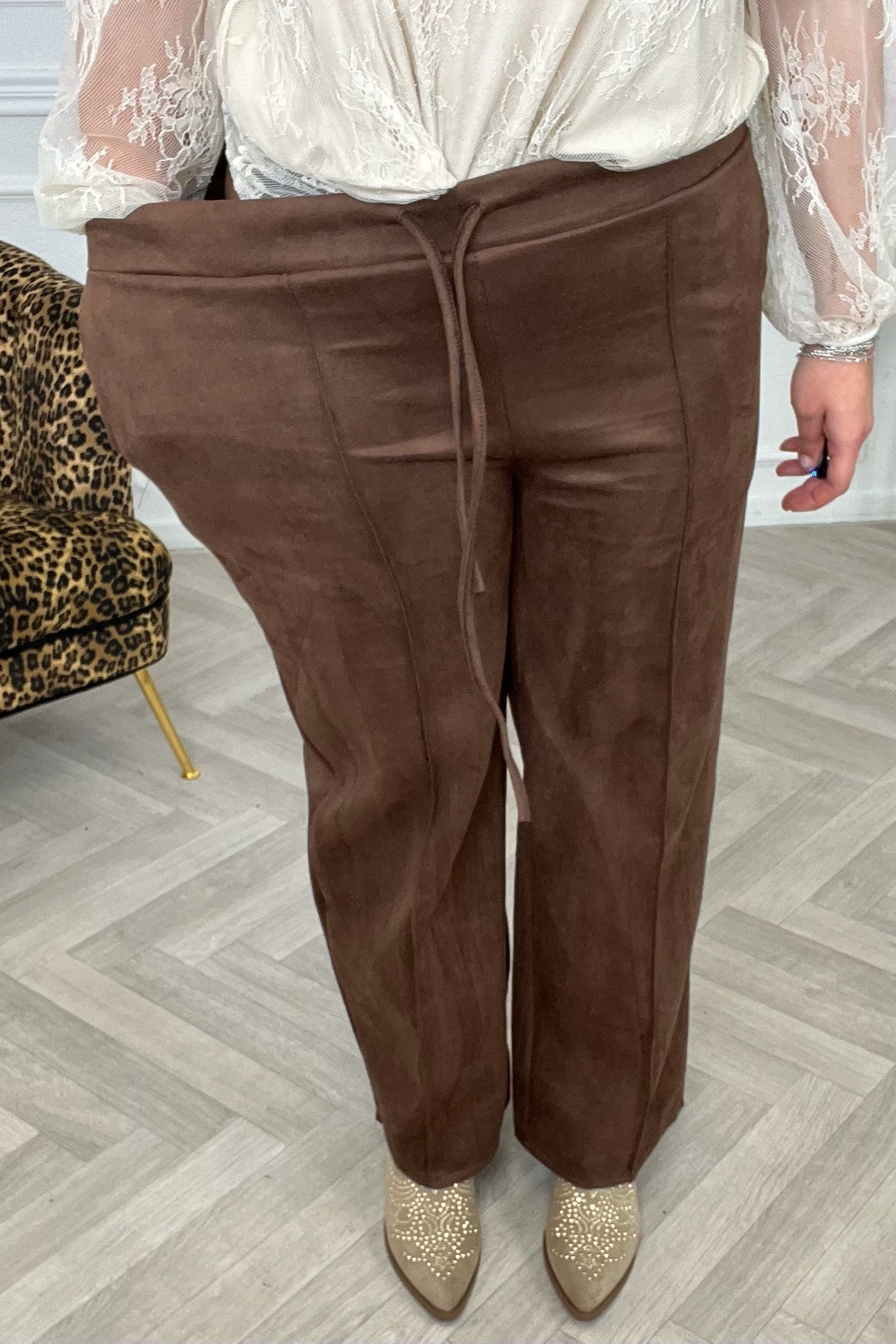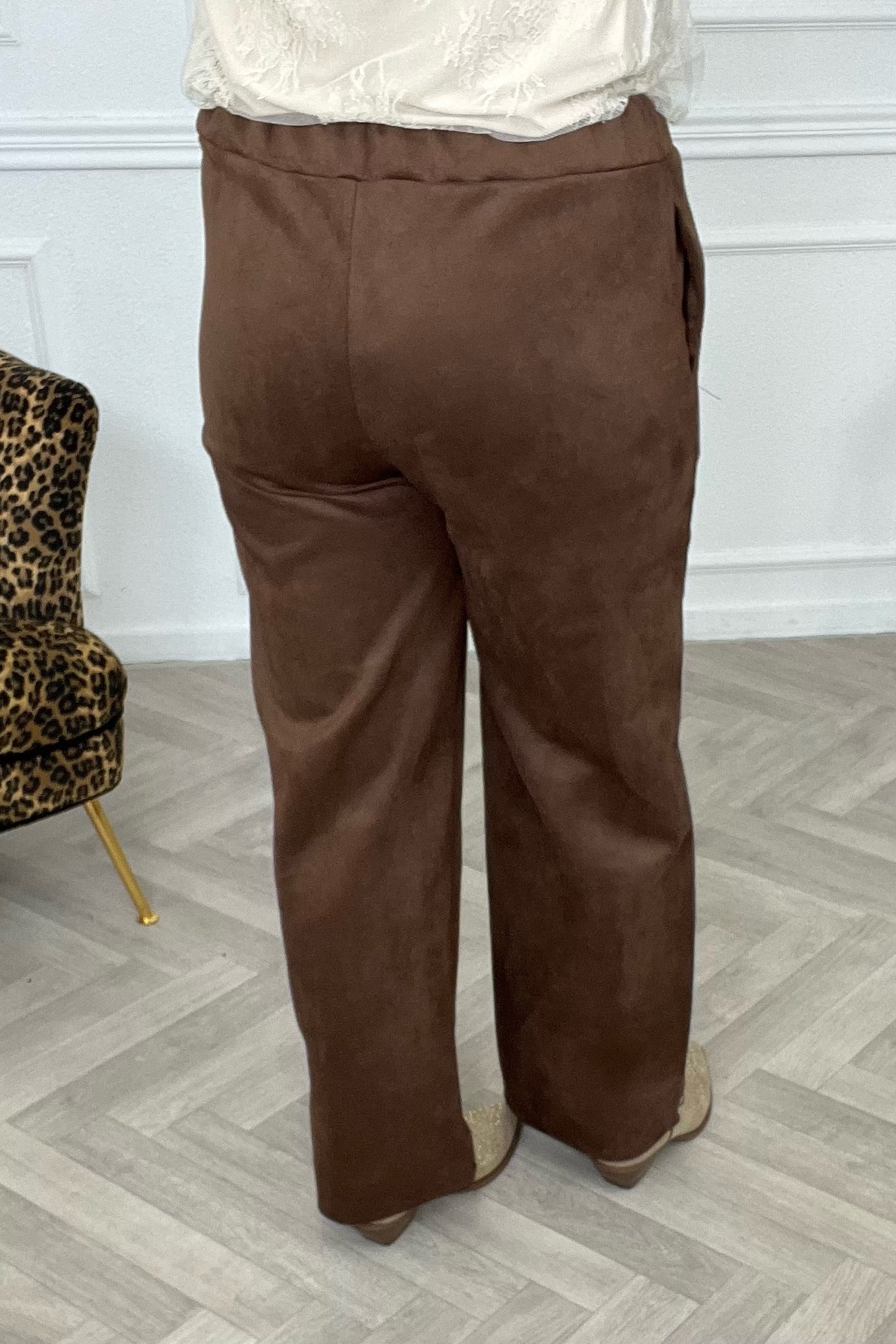 Een prachtige en comfy broek! Er zit een mooie streep in het midden van de wide leg. Shop de suede striped pants nu in brown!