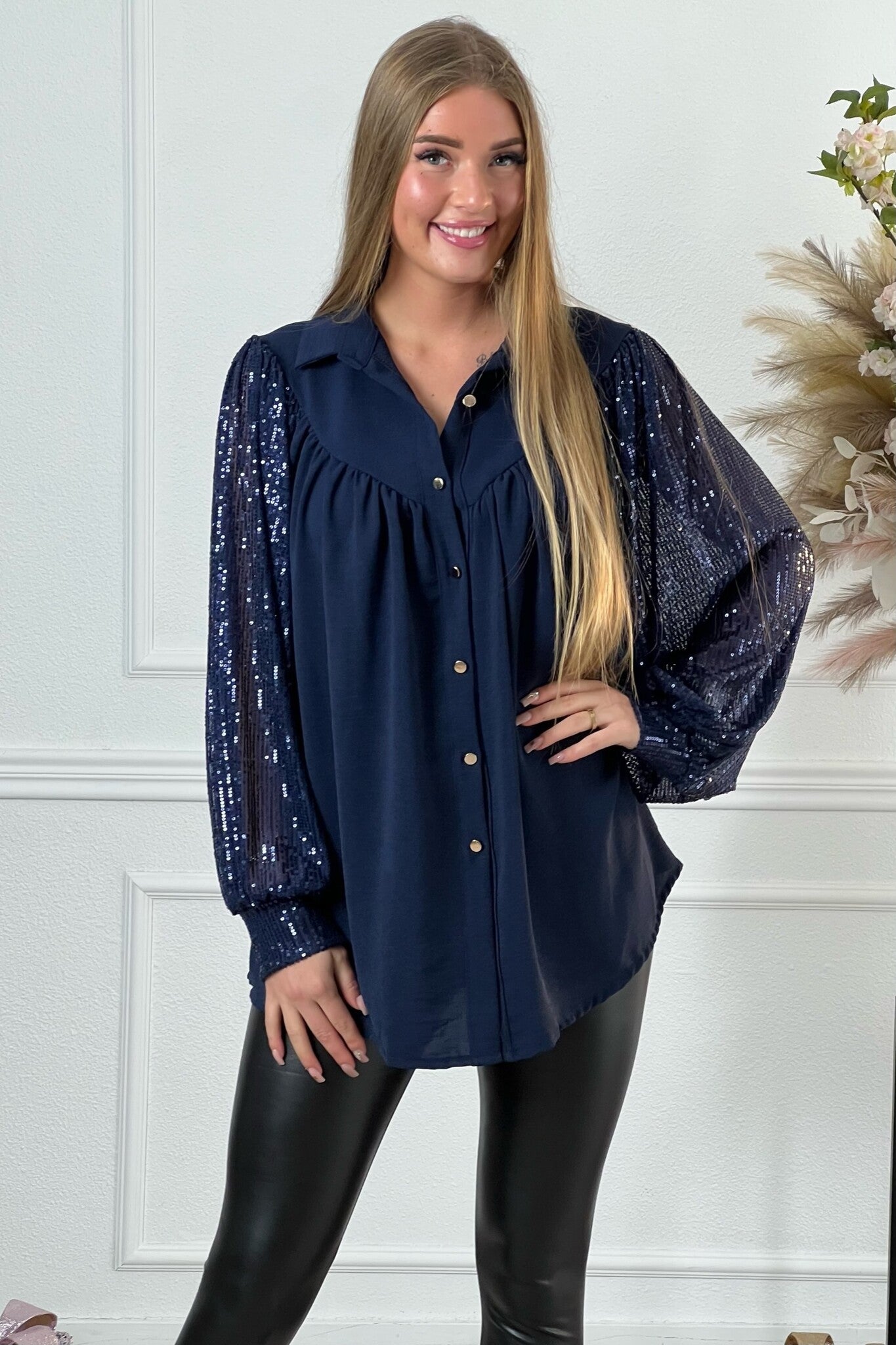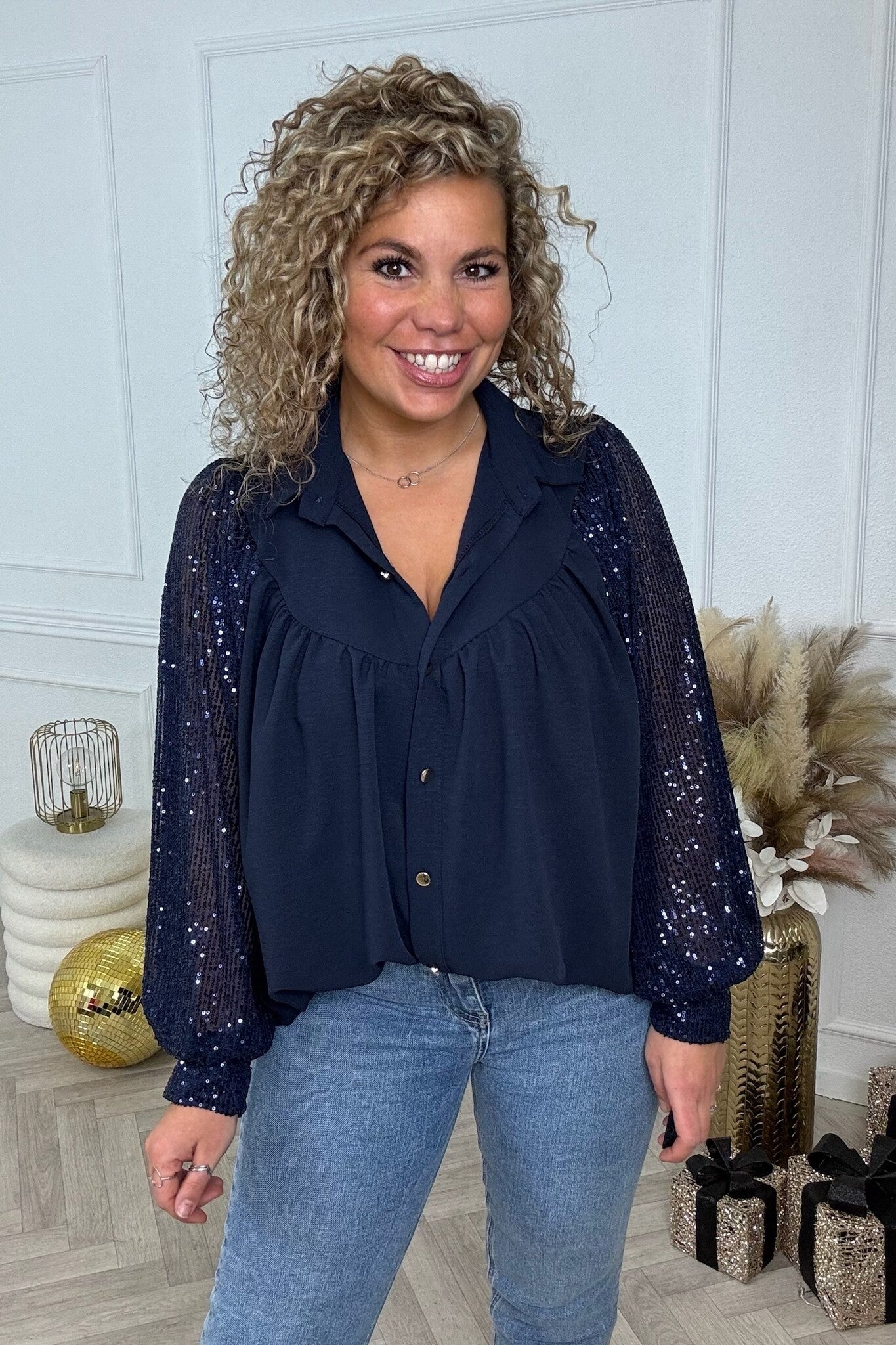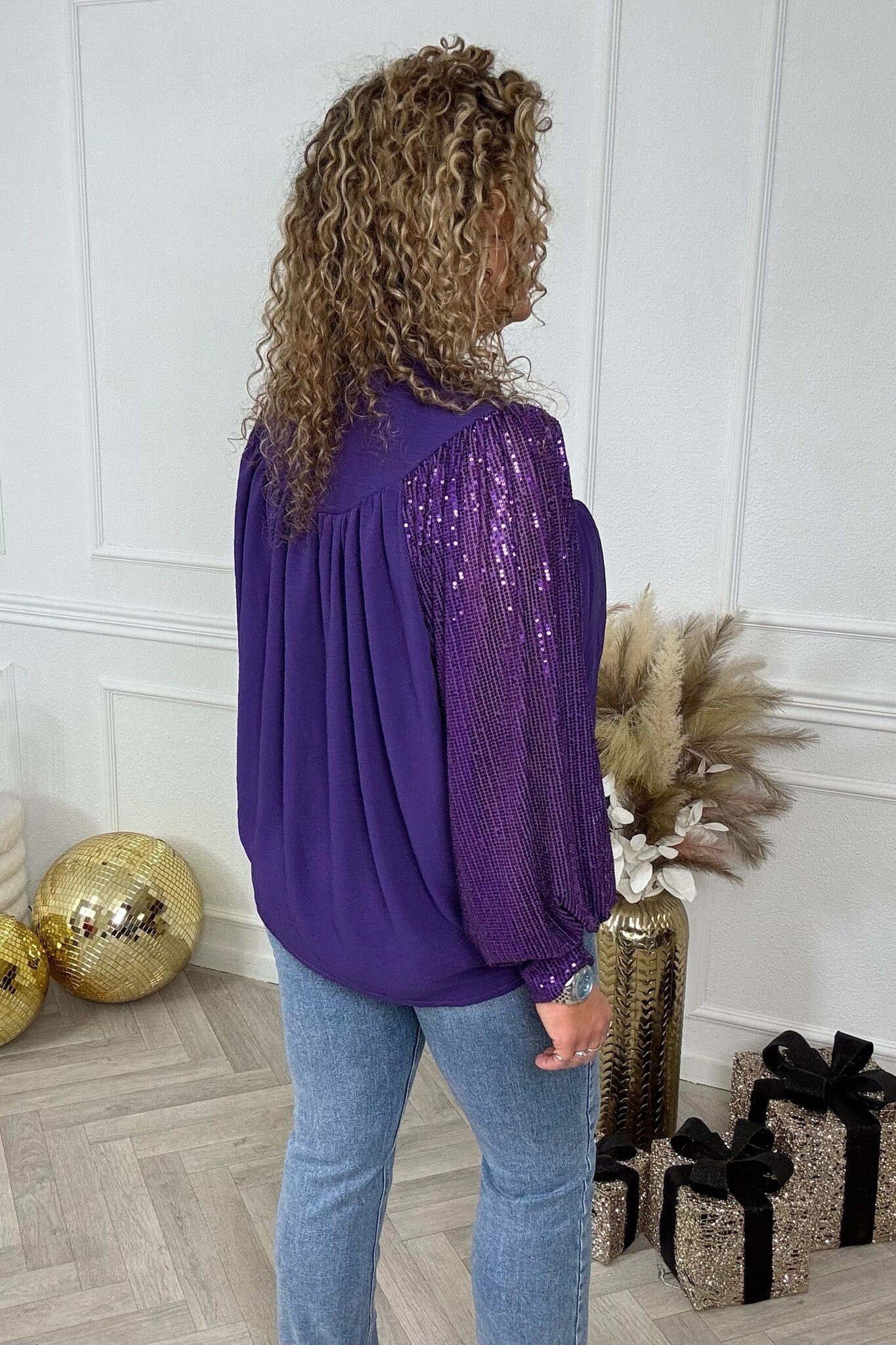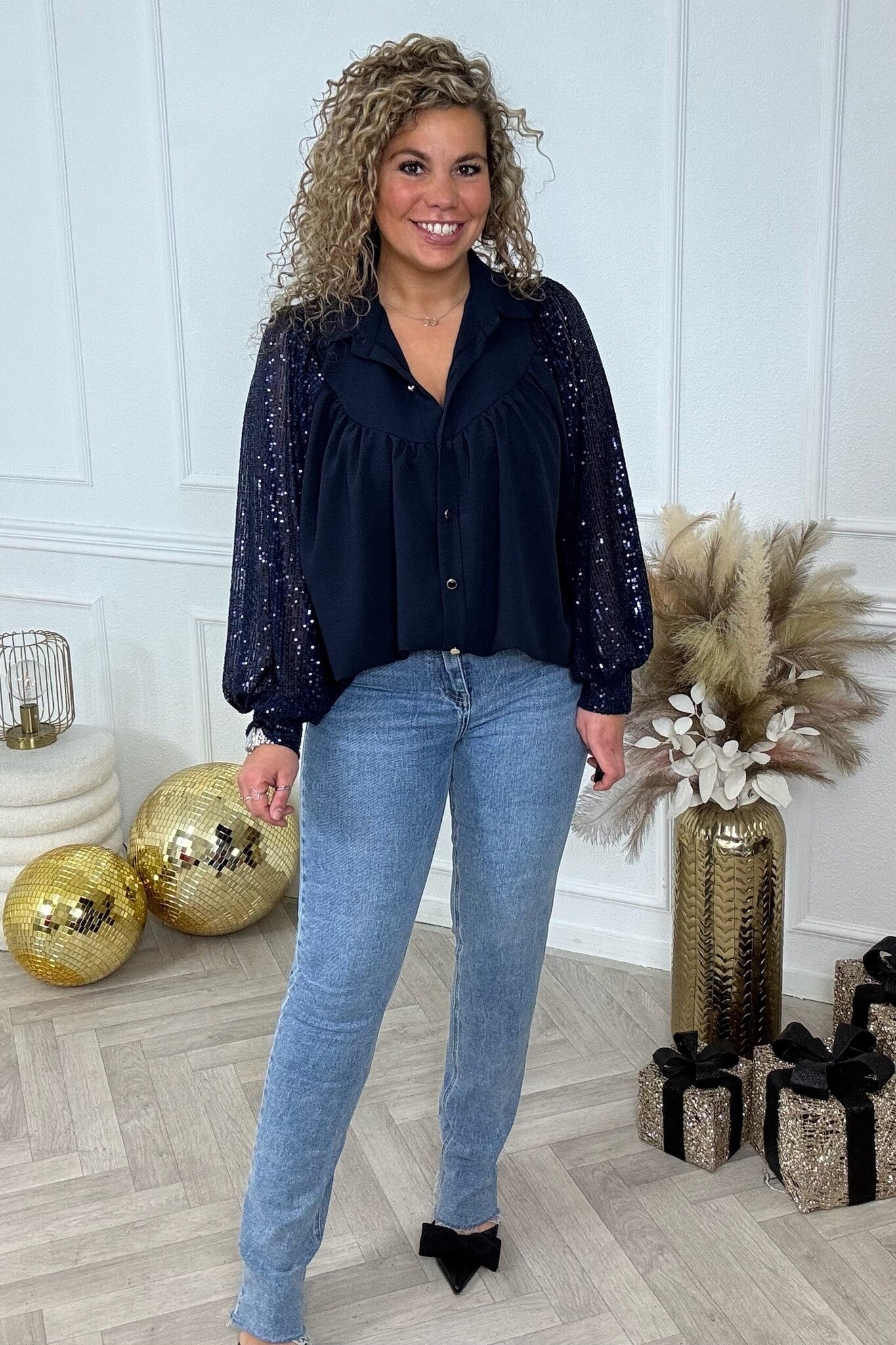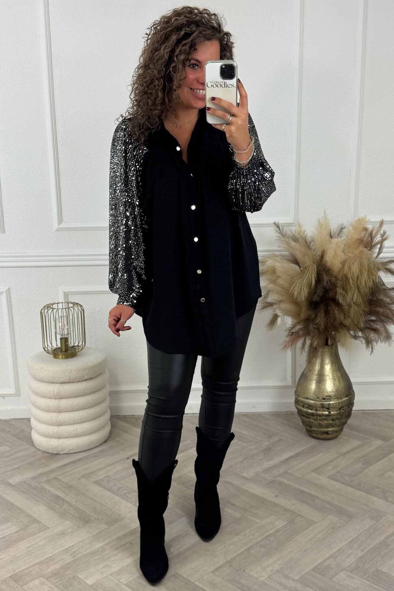 Curvy Sequin Sleeves Blouse - Black/Silver