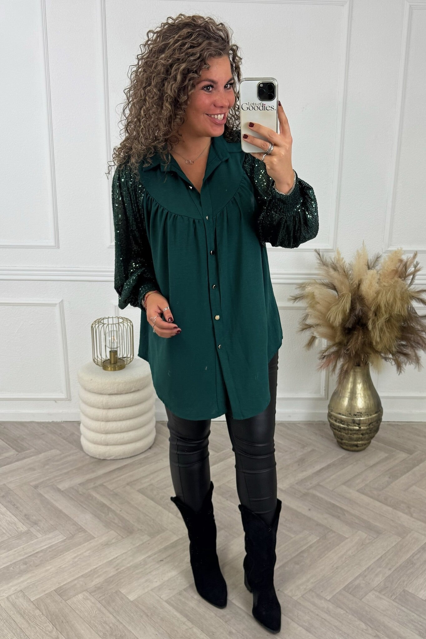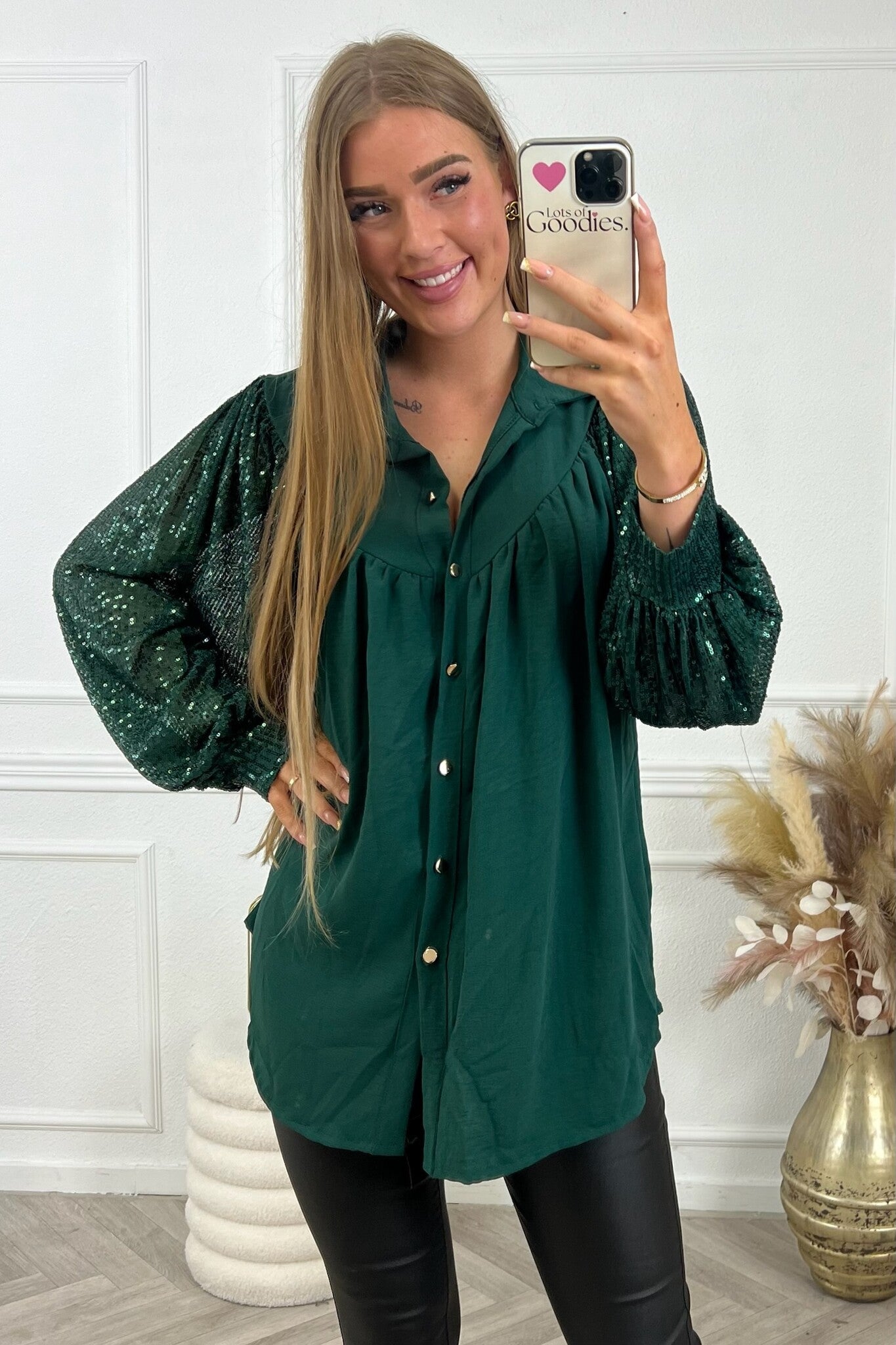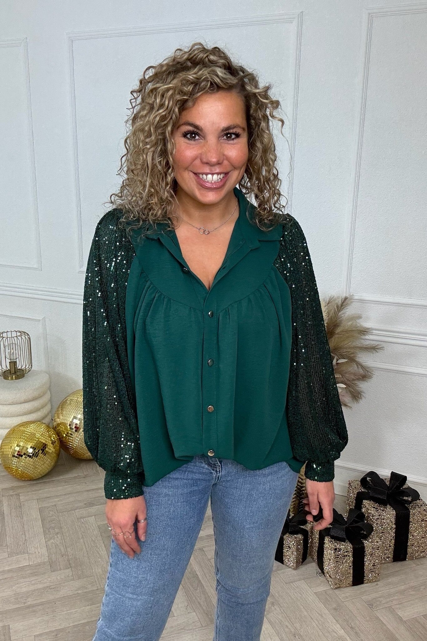 Curvy Sequin Sleeves Blouse - Bottle Green