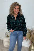 We hebben een exclusieve blouse binnen met chique pailletten! Shop hem in bottle green.