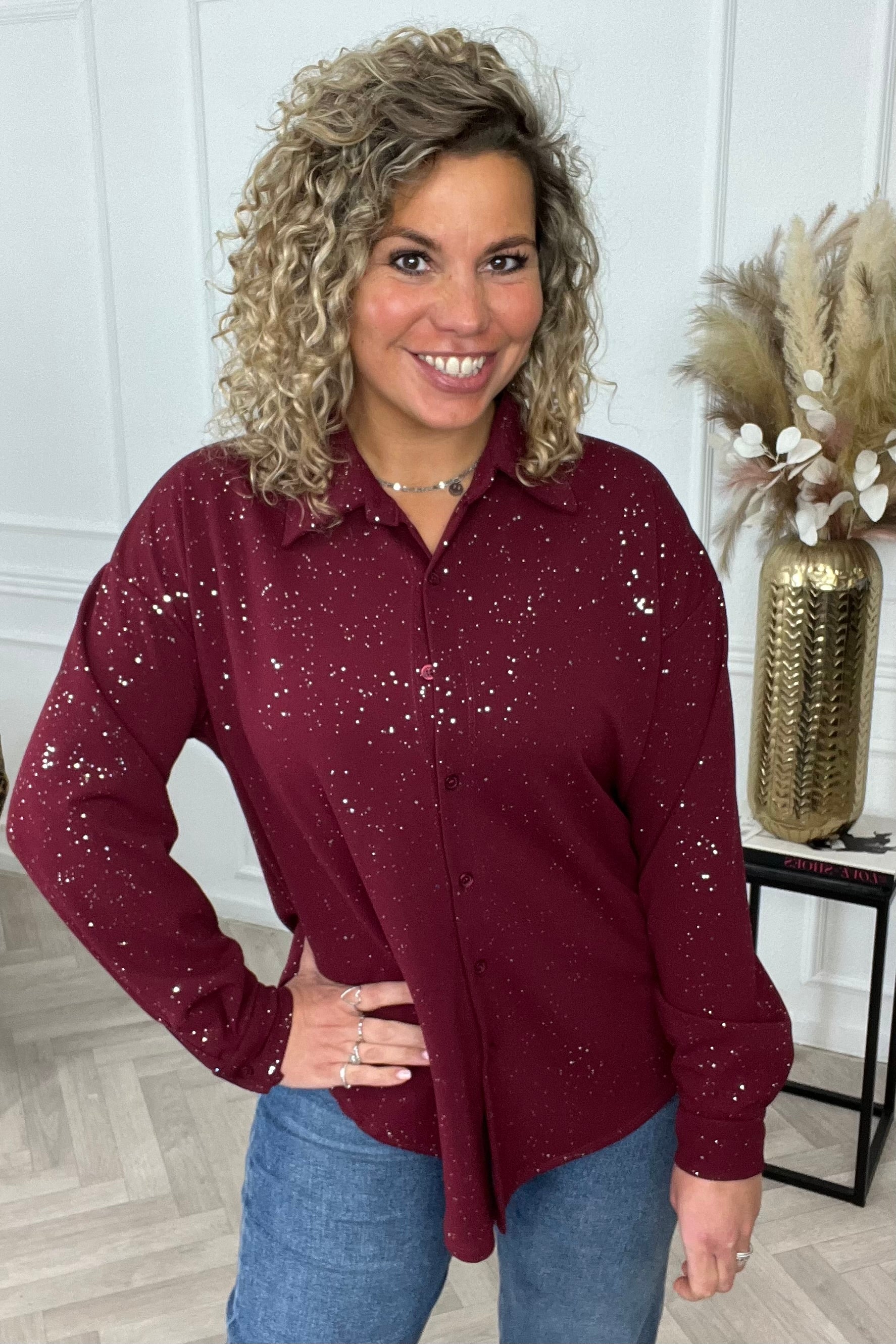 Je zou het stofje van de blouse kunnen herkennen van onze bestseller sparkle dresses! Maar nu hebben we er dus ook te gekke blousjes van! Shop de sparkle button blouse nu in bordeaux!